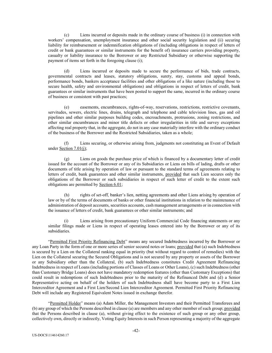 (c) Liens incurred or deposits made in the ordinary course of business (i) in connection with legislation and (ii) securing liability for reimbursement or indemnification obligations of (including obligations in respect of letters of credit or bank guarantees or similar instruments for the benefit of) insurance carriers providing property, casualty or liability insurance to the Borrower or any Restricted Subsidiary or otherwise supporting the payment of items set forth in the foregoing clause (i); (d) Liens incurred or deposits made to secure the performance of bids, trade contracts, governmental contracts and leases, statutory obligations, surety, stay, customs and appeal bonds, performance bonds, bankers acceptance facilities and other obligations of a like nature (including those to secure health, safety and environmental obligations) and obligations in respect of letters of credit, bank guarantees or similar instruments that have been posted to support the same, incurred in the ordinary course of business or consistent with past practices; (e) easements, encumbrances, rights-of-way, reservations, restrictions, restrictive covenants, servitudes, sewers, electric lines, drains, telegraph and telephone and cable television lines, gas and oil pipelines and other similar purposes building codes, encroachments, protrusions, zoning restrictions, and other similar encumbrances and minor title defects or other irregularities in title and survey exceptions affecting real property that, in the aggregate, do not in any case materially interfere with the ordinary conduct of the business of the Borrower and the Restricted Subsidiaries, taken as a whole; (f) Liens securing, or otherwise arising from, judgments not constituting an Event of Default under Section 7.01(j); (g) Liens on goods the purchase price of which is financed by a documentary letter of credit issued for the account of the Borrower or any of its Subsidiaries or Liens on bills of lading, drafts or other documents of title arising by operation of law or pursuant to the standard terms of agreements relating to letters of credit, bank guarantees and other similar instruments, provided that such Lien secures only the obligations of the Borrower or such subsidiaries in respect of such letter of credit to the extent such obligations are permitted by Section 6.01; (h) rights of set- law or by of the terms of documents of banks or other financial institutions in relation to the maintenance of administration of deposit accounts, securities accounts, cash management arrangements or in connection with the issuance of letters of credit, bank guarantees or other similar instruments; and (i) Liens arising from precautionary Uniform Commercial Code financing statements or any similar filings made or Liens in respect of operating leases entered into by the Borrower or any of its subsidiaries. Permitted First Priority Refinancing Debt any Loan Party in the form of one or more series of senior secured notes or loans; provided that (a) such Indebtedness is secured by a Lien on the Collateral ranking equal in priority (but without regard to control of remedies) with the Lien on the Collateral securing the Secured Obligations and is not secured by any property or assets of the Borrower or any Subsidiary other than the Collateral, (b) such Indebtedness constitutes Credit Agreement Refinancing Indebtedness in respect of Loans (including portions of Classes of Loans or Other Loans), (c) such Indebtedness (other than Customary Bridge Loans) does not have mandatory redemption features (other than Customary Exceptions) that could result in redemptions of such Indebtedness prior to the maturity of the Refinanced Debt and (d) a Senior Representative acting on behalf of the holders of such Indebtedness shall have become party to a First Lien Intercreditor Agreement and a First Lien/Second Lien Intercreditor Agreement. Permitted First Priority Refinancing Debt will include any Registered Equivalent Notes issued in exchange therefor. Permitted Holder (b) any group of which the Persons described in clause (a) are members and any other member of such group; provided that the Persons described in clause (a), without giving effect to the existence of such group or any other group, collectively own, directly or indirectly, Voting Equity Interests in such Person representing a majority of the aggregate -42- US-DOCS\114614260.17