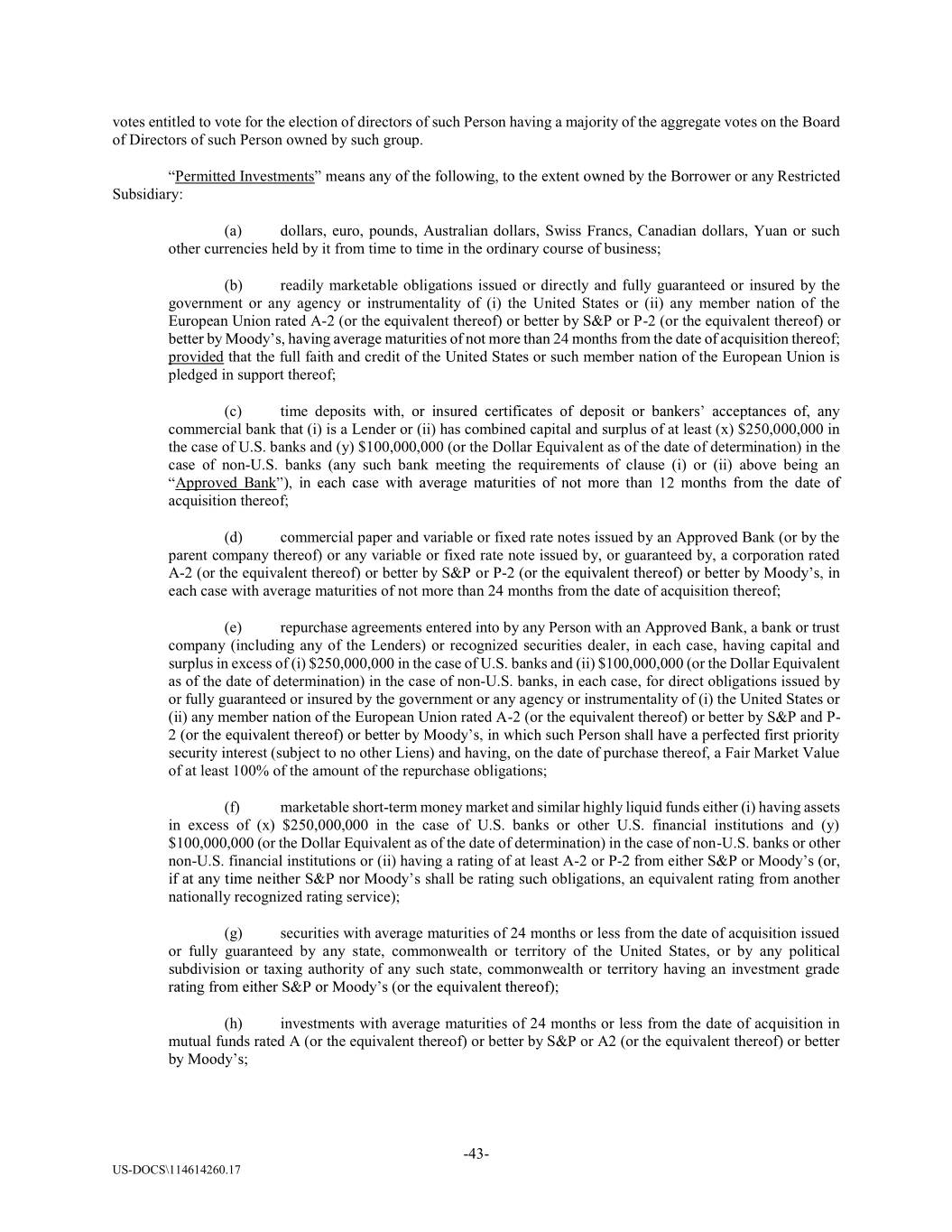 votes entitled to vote for the election of directors of such Person having a majority of the aggregate votes on the Board of Directors of such Person owned by such group. Permitted Investments wer or any Restricted Subsidiary: (a) dollars, euro, pounds, Australian dollars, Swiss Francs, Canadian dollars, Yuan or such other currencies held by it from time to time in the ordinary course of business; (b) readily marketable obligations issued or directly and fully guaranteed or insured by the government or any agency or instrumentality of (i) the United States or (ii) any member nation of the European Union rated A-2 (or the equivalent thereof) or better by S&P or P-2 (or the equivalent thereof) or b provided that the full faith and credit of the United States or such member nation of the European Union is pledged in support thereof; (c) time de commercial bank that (i) is a Lender or (ii) has combined capital and surplus of at least (x) $250,000,000 in the case of U.S. banks and (y) $100,000,000 (or the Dollar Equivalent as of the date of determination) in the case of non-U.S. banks (any such bank meeting the requirements of clause (i) or (ii) above being an Approved Bank acquisition thereof; (d) commercial paper and variable or fixed rate notes issued by an Approved Bank (or by the parent company thereof) or any variable or fixed rate note issued by, or guaranteed by, a corporation rated A-2 (or the equivalent thereof) or better by S&P or P- each case with average maturities of not more than 24 months from the date of acquisition thereof; (e) repurchase agreements entered into by any Person with an Approved Bank, a bank or trust company (including any of the Lenders) or recognized securities dealer, in each case, having capital and surplus in excess of (i) $250,000,000 in the case of U.S. banks and (ii) $100,000,000 (or the Dollar Equivalent as of the date of determination) in the case of non-U.S. banks, in each case, for direct obligations issued by or fully guaranteed or insured by the government or any agency or instrumentality of (i) the United States or (ii) any member nation of the European Union rated A-2 (or the equivalent thereof) or better by S&P and P- security interest (subject to no other Liens) and having, on the date of purchase thereof, a Fair Market Value of at least 100% of the amount of the repurchase obligations; (f) marketable short-term money market and similar highly liquid funds either (i) having assets in excess of (x) $250,000,000 in the case of U.S. banks or other U.S. financial institutions and (y) $100,000,000 (or the Dollar Equivalent as of the date of determination) in the case of non-U.S. banks or other non-U.S. financial institutions or (ii) having a rating of at least A-2 or P- s shall be rating such obligations, an equivalent rating from another nationally recognized rating service); (g) securities with average maturities of 24 months or less from the date of acquisition issued or fully guaranteed by any state, commonwealth or territory of the United States, or by any political subdivision or taxing authority of any such state, commonwealth or territory having an investment grade (h) investments with average maturities of 24 months or less from the date of acquisition in mutual funds rated A (or the equivalent thereof) or better by S&P or A2 (or the equivalent thereof) or better -43- US-DOCS\114614260.17