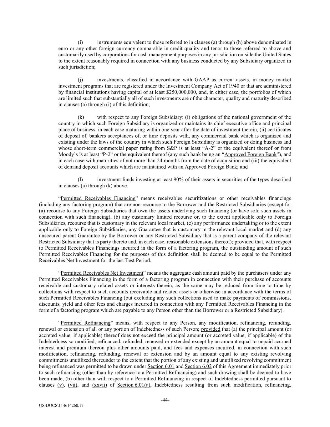 (i) instruments equivalent to those referred to in clauses (a) through (h) above denominated in euro or any other foreign currency comparable in credit quality and tenor to those referred to above and customarily used by corporations for cash management purposes in any jurisdiction outside the United States to the extent reasonably required in connection with any business conducted by any Subsidiary organized in such jurisdiction; (j) investments, classified in accordance with GAAP as current assets, in money market investment programs that are registered under the Investment Company Act of 1940 or that are administered by financial institutions having capital of at least $250,000,000, and, in either case, the portfolios of which are limited such that substantially all of such investments are of the character, quality and maturity described in clauses (a) through (i) of this definition; (k) with respect to any Foreign Subsidiary: (i) obligations of the national government of the country in which such Foreign Subsidiary is organized or maintains its chief executive office and principal place of business, in each case maturing within one year after the date of investment therein, (ii) certificates of deposit of, bankers acceptances of, or time deposits with, any commercial bank which is organized and existing under the laws of the country in which such Foreign Subsidiary is organized or doing business and whose short- - - Approved Foreign Bank in each case with maturities of not more than 24 months from the date of acquisition and (iii) the equivalent of demand deposit accounts which are maintained with an Approved Foreign Bank; and (l) investment funds investing at least 90% of their assets in securities of the types described in clauses (a) through (k) above. Permitted Receivables Financing (including any factoring program) that are non-recourse to the Borrower and the Restricted Subsidiaries (except for (a) recourse to any Foreign Subsidiaries that own the assets underlying such financing (or have sold such assets in connection with such financing), (b) any customary limited recourse or, to the extent applicable only to Foreign Subsidiaries, recourse that is customary in the relevant local market, (c) any performance undertaking or to the extent applicable only to Foreign Subsidiaries, any Guarantee that is customary in the relevant local market and (d) any unsecured parent Guarantee by the Borrower or any Restricted Subsidiary that is a parent company of the relevant Restricted Subsidiary that is party thereto and, in each case, reasonable extensions thereof); provided that, with respect to Permitted Receivables Financings incurred in the form of a factoring program, the outstanding amount of such Permitted Receivables Financing for the purposes of this definition shall be deemed to be equal to the Permitted Receivables Net Investment for the last Test Period. Permitted Receivables Net Investment Permitted Receivables Financing in the form of a factoring program in connection with their purchase of accounts receivable and customary related assets or interests therein, as the same may be reduced from time to time by collections with respect to such accounts receivable and related assets or otherwise in accordance with the terms of such Permitted Receivables Financing (but excluding any such collections used to make payments of commissions, discounts, yield and other fees and charges incurred in connection with any Permitted Receivables Financing in the form of a factoring program which are payable to any Person other than the Borrower or a Restricted Subsidiary). Permitted Refinancing renewal or extension of all or any portion of Indebtedness of such Person; provided that (a) the principal amount (or accreted value, if applicable) thereof does not exceed the principal amount (or accreted value, if applicable) of the Indebtedness so modified, refinanced, refunded, renewed or extended except by an amount equal to unpaid accrued interest and premium thereon plus other amounts paid, and fees and expenses incurred, in connection with such modification, refinancing, refunding, renewal or extension and by an amount equal to any existing revolving commitments unutilized thereunder to the extent that the portion of any existing and unutilized revolving commitment being refinanced was permitted to be drawn under Section 6.01 and Section 6.02 of this Agreement immediately prior to such refinancing (other than by reference to a Permitted Refinancing) and such drawing shall be deemed to have been made, (b) other than with respect to a Permitted Refinancing in respect of Indebtedness permitted pursuant to clauses (v), (vii), and (xxvii) of Section 6.01(a), Indebtedness resulting from such modification, refinancing, -44- US-DOCS\114614260.17