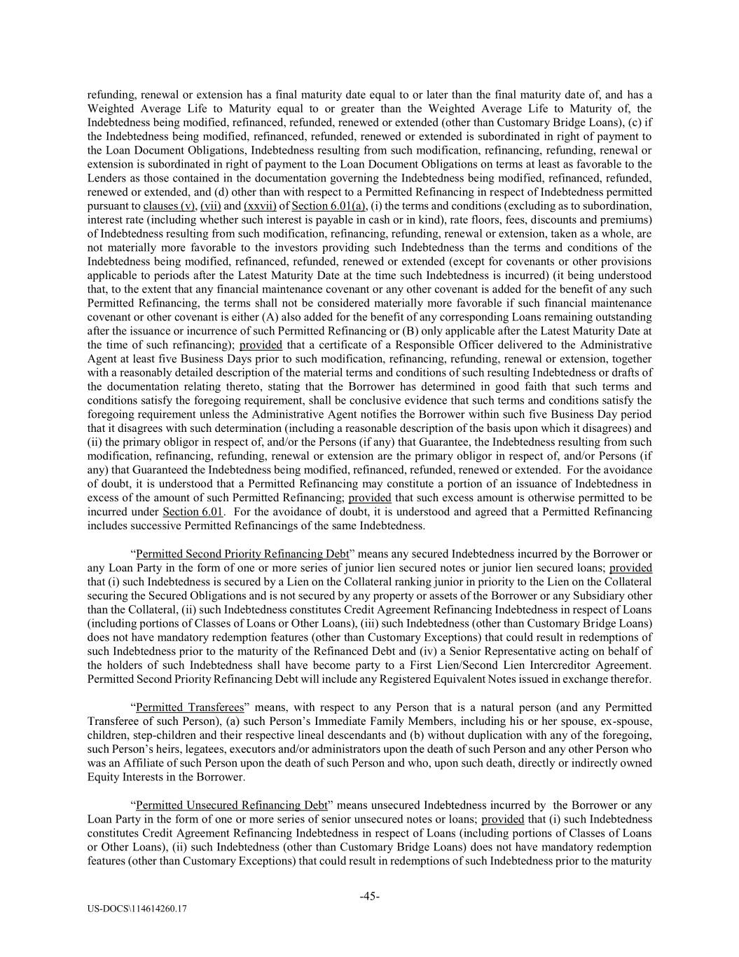 refunding, renewal or extension has a final maturity date equal to or later than the final maturity date of, and has a Weighted Average Life to Maturity equal to or greater than the Weighted Average Life to Maturity of, the Indebtedness being modified, refinanced, refunded, renewed or extended (other than Customary Bridge Loans), (c) if the Indebtedness being modified, refinanced, refunded, renewed or extended is subordinated in right of payment to the Loan Document Obligations, Indebtedness resulting from such modification, refinancing, refunding, renewal or extension is subordinated in right of payment to the Loan Document Obligations on terms at least as favorable to the Lenders as those contained in the documentation governing the Indebtedness being modified, refinanced, refunded, renewed or extended, and (d) other than with respect to a Permitted Refinancing in respect of Indebtedness permitted pursuant to clauses (v), (vii) and (xxvii) of Section 6.01(a), (i) the terms and conditions (excluding as to subordination, interest rate (including whether such interest is payable in cash or in kind), rate floors, fees, discounts and premiums) of Indebtedness resulting from such modification, refinancing, refunding, renewal or extension, taken as a whole, are not materially more favorable to the investors providing such Indebtedness than the terms and conditions of the Indebtedness being modified, refinanced, refunded, renewed or extended (except for covenants or other provisions applicable to periods after the Latest Maturity Date at the time such Indebtedness is incurred) (it being understood that, to the extent that any financial maintenance covenant or any other covenant is added for the benefit of any such Permitted Refinancing, the terms shall not be considered materially more favorable if such financial maintenance covenant or other covenant is either (A) also added for the benefit of any corresponding Loans remaining outstanding after the issuance or incurrence of such Permitted Refinancing or (B) only applicable after the Latest Maturity Date at the time of such refinancing); provided that a certificate of a Responsible Officer delivered to the Administrative Agent at least five Business Days prior to such modification, refinancing, refunding, renewal or extension, together with a reasonably detailed description of the material terms and conditions of such resulting Indebtedness or drafts of the documentation relating thereto, stating that the Borrower has determined in good faith that such terms and conditions satisfy the foregoing requirement, shall be conclusive evidence that such terms and conditions satisfy the foregoing requirement unless the Administrative Agent notifies the Borrower within such five Business Day period that it disagrees with such determination (including a reasonable description of the basis upon which it disagrees) and (ii) the primary obligor in respect of, and/or the Persons (if any) that Guarantee, the Indebtedness resulting from such modification, refinancing, refunding, renewal or extension are the primary obligor in respect of, and/or Persons (if any) that Guaranteed the Indebtedness being modified, refinanced, refunded, renewed or extended. For the avoidance of doubt, it is understood that a Permitted Refinancing may constitute a portion of an issuance of Indebtedness in excess of the amount of such Permitted Refinancing; provided that such excess amount is otherwise permitted to be incurred under Section 6.01. For the avoidance of doubt, it is understood and agreed that a Permitted Refinancing includes successive Permitted Refinancings of the same Indebtedness. Permitted Second Priority Refinancing Debt any Loan Party in the form of one or more series of junior lien secured notes or junior lien secured loans; provided that (i) such Indebtedness is secured by a Lien on the Collateral ranking junior in priority to the Lien on the Collateral securing the Secured Obligations and is not secured by any property or assets of the Borrower or any Subsidiary other than the Collateral, (ii) such Indebtedness constitutes Credit Agreement Refinancing Indebtedness in respect of Loans (including portions of Classes of Loans or Other Loans), (iii) such Indebtedness (other than Customary Bridge Loans) does not have mandatory redemption features (other than Customary Exceptions) that could result in redemptions of such Indebtedness prior to the maturity of the Refinanced Debt and (iv) a Senior Representative acting on behalf of the holders of such Indebtedness shall have become party to a First Lien/Second Lien Intercreditor Agreement. Permitted Second Priority Refinancing Debt will include any Registered Equivalent Notes issued in exchange therefor. Permitted Transferees respect to any Person that is a natural person (and any Permitted -spouse, children, step-children and their respective lineal descendants and (b) without duplication with any of the foregoing, was an Affiliate of such Person upon the death of such Person and who, upon such death, directly or indirectly owned Equity Interests in the Borrower. Permitted Unsecured Refinancing Debt Loan Party in the form of one or more series of senior unsecured notes or loans; provided that (i) such Indebtedness constitutes Credit Agreement Refinancing Indebtedness in respect of Loans (including portions of Classes of Loans or Other Loans), (ii) such Indebtedness (other than Customary Bridge Loans) does not have mandatory redemption features (other than Customary Exceptions) that could result in redemptions of such Indebtedness prior to the maturity -45- US-DOCS\114614260.17