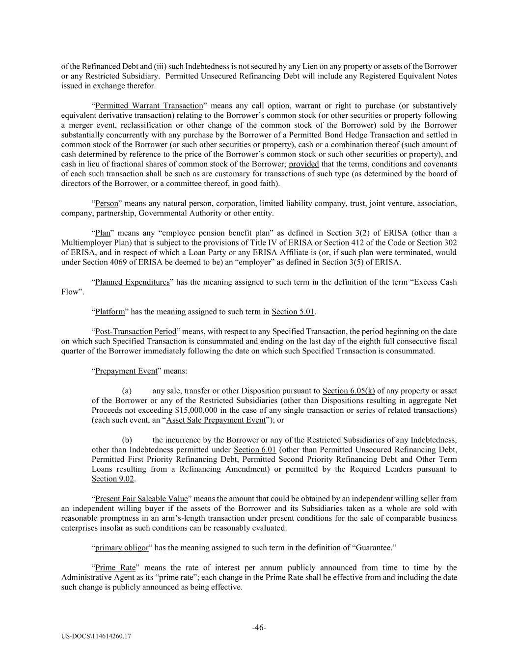 of the Refinanced Debt and (iii) such Indebtedness is not secured by any Lien on any property or assets of the Borrower or any Restricted Subsidiary. Permitted Unsecured Refinancing Debt will include any Registered Equivalent Notes issued in exchange therefor. Permitted Warrant Transaction equivalent derivative transaction) relating a merger event, reclassification or other change of the common stock of the Borrower) sold by the Borrower substantially concurrently with any purchase by the Borrower of a Permitted Bond Hedge Transaction and settled in common stock of the Borrower (or such other securities or property), cash or a combination thereof (such amount of roperty), and cash in lieu of fractional shares of common stock of the Borrower; provided that the terms, conditions and covenants of each such transaction shall be such as are customary for transactions of such type (as determined by the board of directors of the Borrower, or a committee thereof, in good faith). Person son, corporation, limited liability company, trust, joint venture, association, company, partnership, Governmental Authority or other entity. Plan Multiemployer Plan) that is subject to the provisions of Title IV of ERISA or Section 412 of the Code or Section 302 of ERISA, and in respect of which a Loan Party or any ERISA Affiliate is (or, if such plan were terminated, would under Section 4069 of ERISA be deemed to Planned Expenditures Platform Section 5.01. Post-Transaction Period on which such Specified Transaction is consummated and ending on the last day of the eighth full consecutive fiscal quarter of the Borrower immediately following the date on which such Specified Transaction is consummated. Prepayment Event (a) any sale, transfer or other Disposition pursuant to Section 6.05(k) of any property or asset of the Borrower or any of the Restricted Subsidiaries (other than Dispositions resulting in aggregate Net Proceeds not exceeding $15,000,000 in the case of any single transaction or series of related transactions) (each such ev Asset Sale Prepayment Event (b) the incurrence by the Borrower or any of the Restricted Subsidiaries of any Indebtedness, other than Indebtedness permitted under Section 6.01 (other than Permitted Unsecured Refinancing Debt, Permitted First Priority Refinancing Debt, Permitted Second Priority Refinancing Debt and Other Term Loans resulting from a Refinancing Amendment) or permitted by the Required Lenders pursuant to Section 9.02. Present Fair Saleable Value an independent willing buyer if the assets of the Borrower and its Subsidiaries taken as a whole are sold with -length transaction under present conditions for the sale of comparable business enterprises insofar as such conditions can be reasonably evaluated. primary obligor Prime Rate te shall be effective from and including the date such change is publicly announced as being effective. -46- US-DOCS\114614260.17