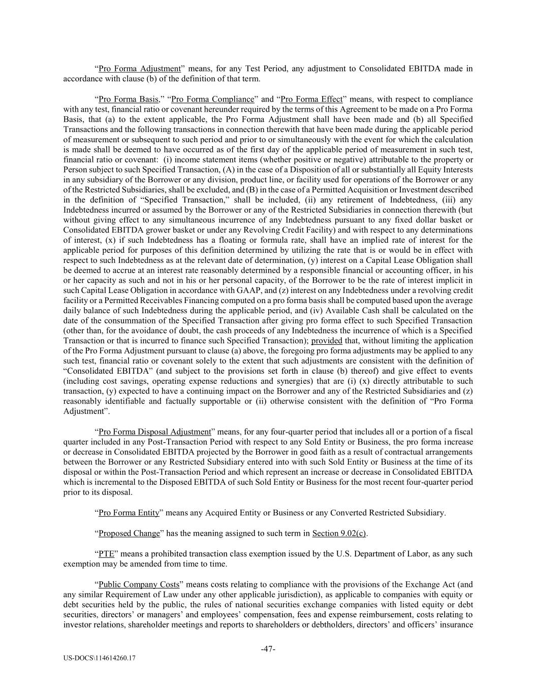 Pro Forma Adjustment accordance with clause (b) of the definition of that term. Pro Forma Basis Pro Forma Compliance Pro Forma Effect with any test, financial ratio or covenant hereunder required by the terms of this Agreement to be made on a Pro Forma Basis, that (a) to the extent applicable, the Pro Forma Adjustment shall have been made and (b) all Specified Transactions and the following transactions in connection therewith that have been made during the applicable period of measurement or subsequent to such period and prior to or simultaneously with the event for which the calculation is made shall be deemed to have occurred as of the first day of the applicable period of measurement in such test, financial ratio or covenant: (i) income statement items (whether positive or negative) attributable to the property or Person subject to such Specified Transaction, (A) in the case of a Disposition of all or substantially all Equity Interests in any subsidiary of the Borrower or any division, product line, or facility used for operations of the Borrower or any of the Restricted Subsidiaries, shall be excluded, and (B) in the case of a Permitted Acquisition or Investment described Indebtedness incurred or assumed by the Borrower or any of the Restricted Subsidiaries in connection therewith (but without giving effect to any simultaneous incurrence of any Indebtedness pursuant to any fixed dollar basket or Consolidated EBITDA grower basket or under any Revolving Credit Facility) and with respect to any determinations of interest, (x) if such Indebtedness has a floating or formula rate, shall have an implied rate of interest for the applicable period for purposes of this definition determined by utilizing the rate that is or would be in effect with respect to such Indebtedness as at the relevant date of determination, (y) interest on a Capital Lease Obligation shall be deemed to accrue at an interest rate reasonably determined by a responsible financial or accounting officer, in his or her capacity as such and not in his or her personal capacity, of the Borrower to be the rate of interest implicit in such Capital Lease Obligation in accordance with GAAP, and (z) interest on any Indebtedness under a revolving credit facility or a Permitted Receivables Financing computed on a pro forma basis shall be computed based upon the average daily balance of such Indebtedness during the applicable period, and (iv) Available Cash shall be calculated on the date of the consummation of the Specified Transaction after giving pro forma effect to such Specified Transaction (other than, for the avoidance of doubt, the cash proceeds of any Indebtedness the incurrence of which is a Specified Transaction or that is incurred to finance such Specified Transaction); provided that, without limiting the application of the Pro Forma Adjustment pursuant to clause (a) above, the foregoing pro forma adjustments may be applied to any such test, financial ratio or covenant solely to the extent that such adjustments are consistent with the definition of (including cost savings, operating expense reductions and synergies) that are (i) (x) directly attributable to such transaction, (y) expected to have a continuing impact on the Borrower and any of the Restricted Subsidiaries and (z) reasonably identifiable and factually supportable or (ii) otherwise consistent with the Pro Forma Disposal Adjustment -quarter period that includes all or a portion of a fiscal quarter included in any Post-Transaction Period with respect to any Sold Entity or Business, the pro forma increase or decrease in Consolidated EBITDA projected by the Borrower in good faith as a result of contractual arrangements between the Borrower or any Restricted Subsidiary entered into with such Sold Entity or Business at the time of its disposal or within the Post-Transaction Period and which represent an increase or decrease in Consolidated EBITDA which is incremental to the Disposed EBITDA of such Sold Entity or Business for the most recent four-quarter period prior to its disposal. Pro Forma Entity eans any Acquired Entity or Business or any Converted Restricted Subsidiary. Proposed Change Section 9.02(c). PTE exemption may be amended from time to time. Public Company Costs ng to compliance with the provisions of the Exchange Act (and any similar Requirement of Law under any other applicable jurisdiction), as applicable to companies with equity or debt securities held by the public, the rules of national securities exchange companies with listed equity or debt -47- US-DOCS\114614260.17