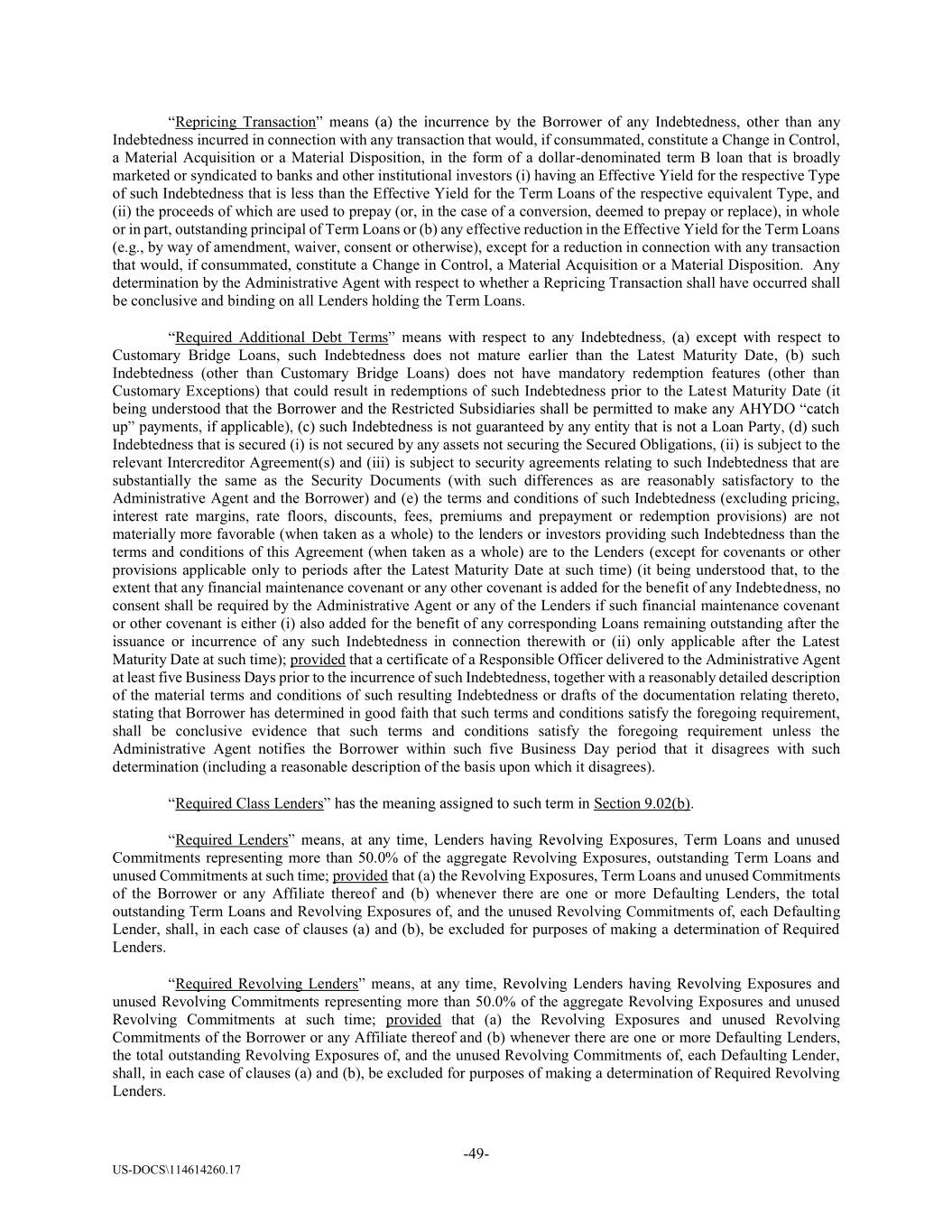 Repricing Transaction r than any Indebtedness incurred in connection with any transaction that would, if consummated, constitute a Change in Control, a Material Acquisition or a Material Disposition, in the form of a dollar-denominated term B loan that is broadly marketed or syndicated to banks and other institutional investors (i) having an Effective Yield for the respective Type of such Indebtedness that is less than the Effective Yield for the Term Loans of the respective equivalent Type, and (ii) the proceeds of which are used to prepay (or, in the case of a conversion, deemed to prepay or replace), in whole or in part, outstanding principal of Term Loans or (b) any effective reduction in the Effective Yield for the Term Loans (e.g., by way of amendment, waiver, consent or otherwise), except for a reduction in connection with any transaction that would, if consummated, constitute a Change in Control, a Material Acquisition or a Material Disposition. Any determination by the Administrative Agent with respect to whether a Repricing Transaction shall have occurred shall be conclusive and binding on all Lenders holding the Term Loans. Required Additional Debt Terms Customary Bridge Loans, such Indebtedness does not mature earlier than the Latest Maturity Date, (b) such Indebtedness (other than Customary Bridge Loans) does not have mandatory redemption features (other than Customary Exceptions) that could result in redemptions of such Indebtedness prior to the Latest Maturity Date (it Indebtedness that is secured (i) is not secured by any assets not securing the Secured Obligations, (ii) is subject to the relevant Intercreditor Agreement(s) and (iii) is subject to security agreements relating to such Indebtedness that are substantially the same as the Security Documents (with such differences as are reasonably satisfactory to the Administrative Agent and the Borrower) and (e) the terms and conditions of such Indebtedness (excluding pricing, interest rate margins, rate floors, discounts, fees, premiums and prepayment or redemption provisions) are not materially more favorable (when taken as a whole) to the lenders or investors providing such Indebtedness than the terms and conditions of this Agreement (when taken as a whole) are to the Lenders (except for covenants or other provisions applicable only to periods after the Latest Maturity Date at such time) (it being understood that, to the extent that any financial maintenance covenant or any other covenant is added for the benefit of any Indebtedness, no consent shall be required by the Administrative Agent or any of the Lenders if such financial maintenance covenant or other covenant is either (i) also added for the benefit of any corresponding Loans remaining outstanding after the issuance or incurrence of any such Indebtedness in connection therewith or (ii) only applicable after the Latest Maturity Date at such time); provided that a certificate of a Responsible Officer delivered to the Administrative Agent at least five Business Days prior to the incurrence of such Indebtedness, together with a reasonably detailed description of the material terms and conditions of such resulting Indebtedness or drafts of the documentation relating thereto, stating that Borrower has determined in good faith that such terms and conditions satisfy the foregoing requirement, shall be conclusive evidence that such terms and conditions satisfy the foregoing requirement unless the Administrative Agent notifies the Borrower within such five Business Day period that it disagrees with such determination (including a reasonable description of the basis upon which it disagrees). Required Class Lenders Section 9.02(b). Required Lenders Commitments representing more than 50.0% of the aggregate Revolving Exposures, outstanding Term Loans and unused Commitments at such time; provided that (a) the Revolving Exposures, Term Loans and unused Commitments of the Borrower or any Affiliate thereof and (b) whenever there are one or more Defaulting Lenders, the total outstanding Term Loans and Revolving Exposures of, and the unused Revolving Commitments of, each Defaulting Lender, shall, in each case of clauses (a) and (b), be excluded for purposes of making a determination of Required Lenders. Required Revolving Lenders unused Revolving Commitments representing more than 50.0% of the aggregate Revolving Exposures and unused Revolving Commitments at such time; provided that (a) the Revolving Exposures and unused Revolving Commitments of the Borrower or any Affiliate thereof and (b) whenever there are one or more Defaulting Lenders, the total outstanding Revolving Exposures of, and the unused Revolving Commitments of, each Defaulting Lender, shall, in each case of clauses (a) and (b), be excluded for purposes of making a determination of Required Revolving Lenders. -49- US-DOCS\114614260.17