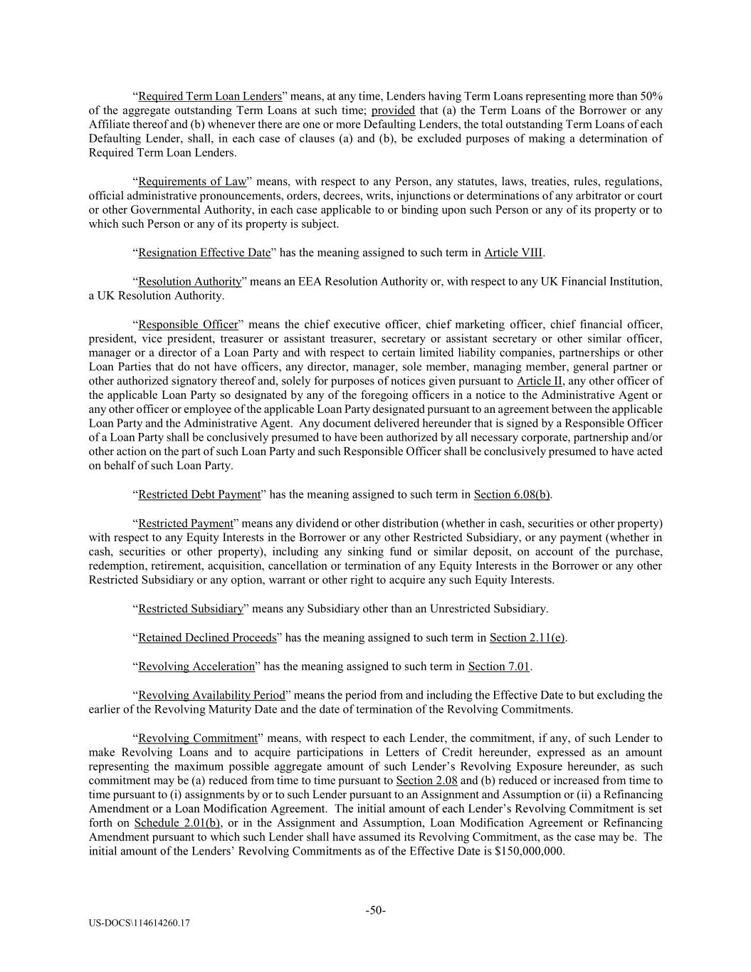 Required Term Loan Lenders of the aggregate outstanding Term Loans at such time; provided that (a) the Term Loans of the Borrower or any Affiliate thereof and (b) whenever there are one or more Defaulting Lenders, the total outstanding Term Loans of each Defaulting Lender, shall, in each case of clauses (a) and (b), be excluded purposes of making a determination of Required Term Loan Lenders. Requirements of Law with respect to any Person, any statutes, laws, treaties, rules, regulations, official administrative pronouncements, orders, decrees, writs, injunctions or determinations of any arbitrator or court or other Governmental Authority, in each case applicable to or binding upon such Person or any of its property or to which such Person or any of its property is subject. Resignation Effective Date Article VIII. Resolution Authority a UK Resolution Authority. Responsible Officer officer, chief financial officer, president, vice president, treasurer or assistant treasurer, secretary or assistant secretary or other similar officer, manager or a director of a Loan Party and with respect to certain limited liability companies, partnerships or other Loan Parties that do not have officers, any director, manager, sole member, managing member, general partner or other authorized signatory thereof and, solely for purposes of notices given pursuant to Article II, any other officer of the applicable Loan Party so designated by any of the foregoing officers in a notice to the Administrative Agent or any other officer or employee of the applicable Loan Party designated pursuant to an agreement between the applicable Loan Party and the Administrative Agent. Any document delivered hereunder that is signed by a Responsible Officer of a Loan Party shall be conclusively presumed to have been authorized by all necessary corporate, partnership and/or other action on the part of such Loan Party and such Responsible Officer shall be conclusively presumed to have acted on behalf of such Loan Party. Restricted Debt Payment Section 6.08(b). Restricted Payment cash, securities or other property) with respect to any Equity Interests in the Borrower or any other Restricted Subsidiary, or any payment (whether in cash, securities or other property), including any sinking fund or similar deposit, on account of the purchase, redemption, retirement, acquisition, cancellation or termination of any Equity Interests in the Borrower or any other Restricted Subsidiary or any option, warrant or other right to acquire any such Equity Interests. Restricted Subsidiary y Subsidiary other than an Unrestricted Subsidiary. Retained Declined Proceeds Section 2.11(e). Revolving Acceleration Section 7.01. Revolving Availability Period earlier of the Revolving Maturity Date and the date of termination of the Revolving Commitments. Revolving Commitment ender, the commitment, if any, of such Lender to make Revolving Loans and to acquire participations in Letters of Credit hereunder, expressed as an amount such commitment may be (a) reduced from time to time pursuant to Section 2.08 and (b) reduced or increased from time to time pursuant to (i) assignments by or to such Lender pursuant to an Assignment and Assumption or (ii) a Refinancing forth on Schedule 2.01(b), or in the Assignment and Assumption, Loan Modification Agreement or Refinancing Amendment pursuant to which such Lender shall have assumed its Revolving Commitment, as the case may be. The -50- US-DOCS\114614260.17