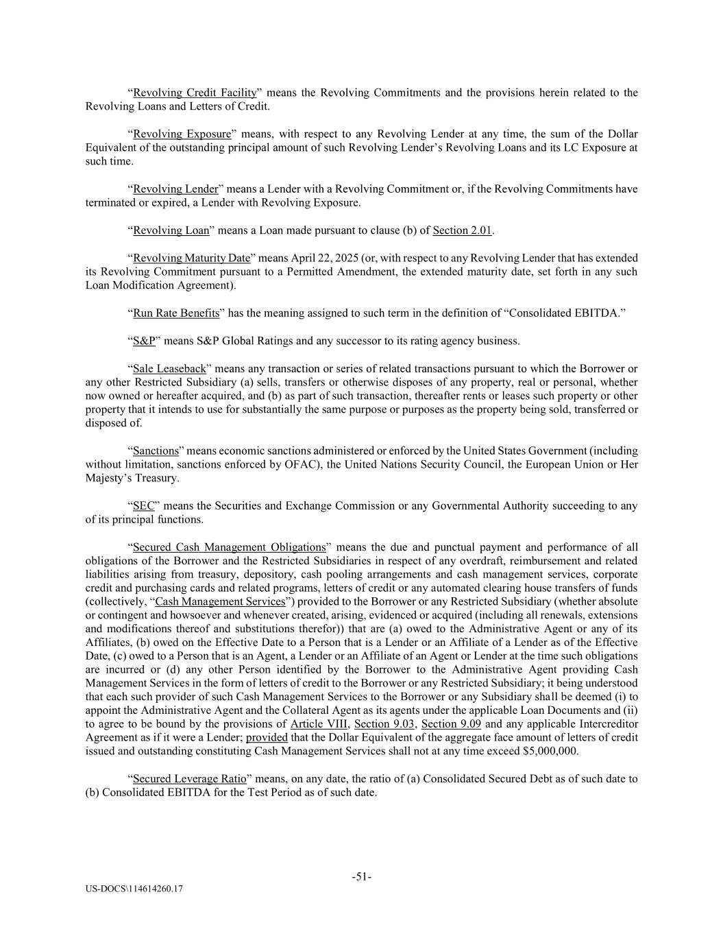 Revolving Credit Facility Revolving Loans and Letters of Credit. Revolving Exposure Equivalent of th such time. Revolving Lender terminated or expired, a Lender with Revolving Exposure. Revolving Loan Section 2.01. Revolving Maturity Date April 22, 2025 (or, with respect to any Revolving Lender that has extended its Revolving Commitment pursuant to a Permitted Amendment, the extended maturity date, set forth in any such Loan Modification Agreement). Run Rate Benefits S&P Sale Leaseback any other Restricted Subsidiary (a) sells, transfers or otherwise disposes of any property, real or personal, whether now owned or hereafter acquired, and (b) as part of such transaction, thereafter rents or leases such property or other property that it intends to use for substantially the same purpose or purposes as the property being sold, transferred or disposed of. Sanctions without limitation, sanctions enforced by OFAC), the United Nations Security Council, the European Union or Her SEC of its principal functions. Secured Cash Management Obligations t and performance of all obligations of the Borrower and the Restricted Subsidiaries in respect of any overdraft, reimbursement and related liabilities arising from treasury, depository, cash pooling arrangements and cash management services, corporate credit and purchasing cards and related programs, letters of credit or any automated clearing house transfers of funds Cash Management Services or contingent and howsoever and whenever created, arising, evidenced or acquired (including all renewals, extensions and modifications thereof and substitutions therefor)) that are (a) owed to the Administrative Agent or any of its Affiliates, (b) owed on the Effective Date to a Person that is a Lender or an Affiliate of a Lender as of the Effective Date, (c) owed to a Person that is an Agent, a Lender or an Affiliate of an Agent or Lender at the time such obligations are incurred or (d) any other Person identified by the Borrower to the Administrative Agent providing Cash Management Services in the form of letters of credit to the Borrower or any Restricted Subsidiary; it being understood that each such provider of such Cash Management Services to the Borrower or any Subsidiary shall be deemed (i) to appoint the Administrative Agent and the Collateral Agent as its agents under the applicable Loan Documents and (ii) to agree to be bound by the provisions of Article VIII, Section 9.03, Section 9.09 and any applicable Intercreditor Agreement as if it were a Lender; provided that the Dollar Equivalent of the aggregate face amount of letters of credit issued and outstanding constituting Cash Management Services shall not at any time exceed $5,000,000. Secured Leverage Ratio any date, the ratio of (a) Consolidated Secured Debt as of such date to (b) Consolidated EBITDA for the Test Period as of such date. -51- US-DOCS\114614260.17