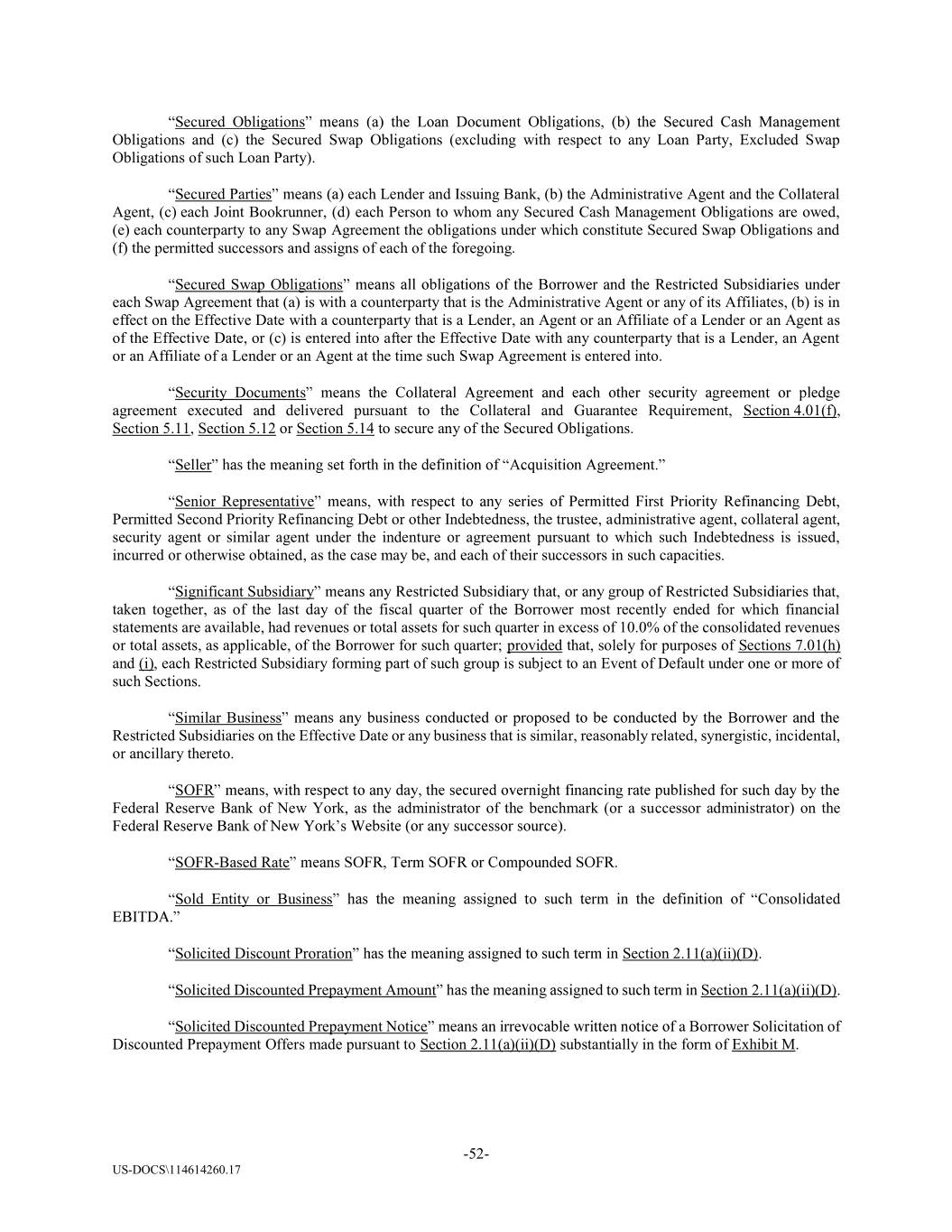 Secured Obligations Obligations and (c) the Secured Swap Obligations (excluding with respect to any Loan Party, Excluded Swap Obligations of such Loan Party). Secured Parties each Lender and Issuing Bank, (b) the Administrative Agent and the Collateral Agent, (c) each Joint Bookrunner, (d) each Person to whom any Secured Cash Management Obligations are owed, (e) each counterparty to any Swap Agreement the obligations under which constitute Secured Swap Obligations and (f) the permitted successors and assigns of each of the foregoing. Secured Swap Obligations each Swap Agreement that (a) is with a counterparty that is the Administrative Agent or any of its Affiliates, (b) is in effect on the Effective Date with a counterparty that is a Lender, an Agent or an Affiliate of a Lender or an Agent as of the Effective Date, or (c) is entered into after the Effective Date with any counterparty that is a Lender, an Agent or an Affiliate of a Lender or an Agent at the time such Swap Agreement is entered into. Security Documents agreement executed and delivered pursuant to the Collateral and Guarantee Requirement, Section 4.01(f), Section 5.11, Section 5.12 or Section 5.14 to secure any of the Secured Obligations. Seller Senior Representative Permitted Second Priority Refinancing Debt or other Indebtedness, the trustee, administrative agent, collateral agent, security agent or similar agent under the indenture or agreement pursuant to which such Indebtedness is issued, incurred or otherwise obtained, as the case may be, and each of their successors in such capacities. Significant Subsidiary taken together, as of the last day of the fiscal quarter of the Borrower most recently ended for which financial statements are available, had revenues or total assets for such quarter in excess of 10.0% of the consolidated revenues or total assets, as applicable, of the Borrower for such quarter; provided that, solely for purposes of Sections 7.01(h) and (i), each Restricted Subsidiary forming part of such group is subject to an Event of Default under one or more of such Sections. Similar Business Restricted Subsidiaries on the Effective Date or any business that is similar, reasonably related, synergistic, incidental, or ancillary thereto. SOFR Federal Reserve Bank of New York, as the administrator of the benchmark (or a successor administrator) on the SOFR-Based Rate Sold Entity or Business ed Solicited Discount Proration Section 2.11(a)(ii)(D). Solicited Discounted Prepayment Amount Section 2.11(a)(ii)(D). Solicited Discounted Prepayment Notice a Borrower Solicitation of Discounted Prepayment Offers made pursuant to Section 2.11(a)(ii)(D) substantially in the form of Exhibit M. -52- US-DOCS\114614260.17