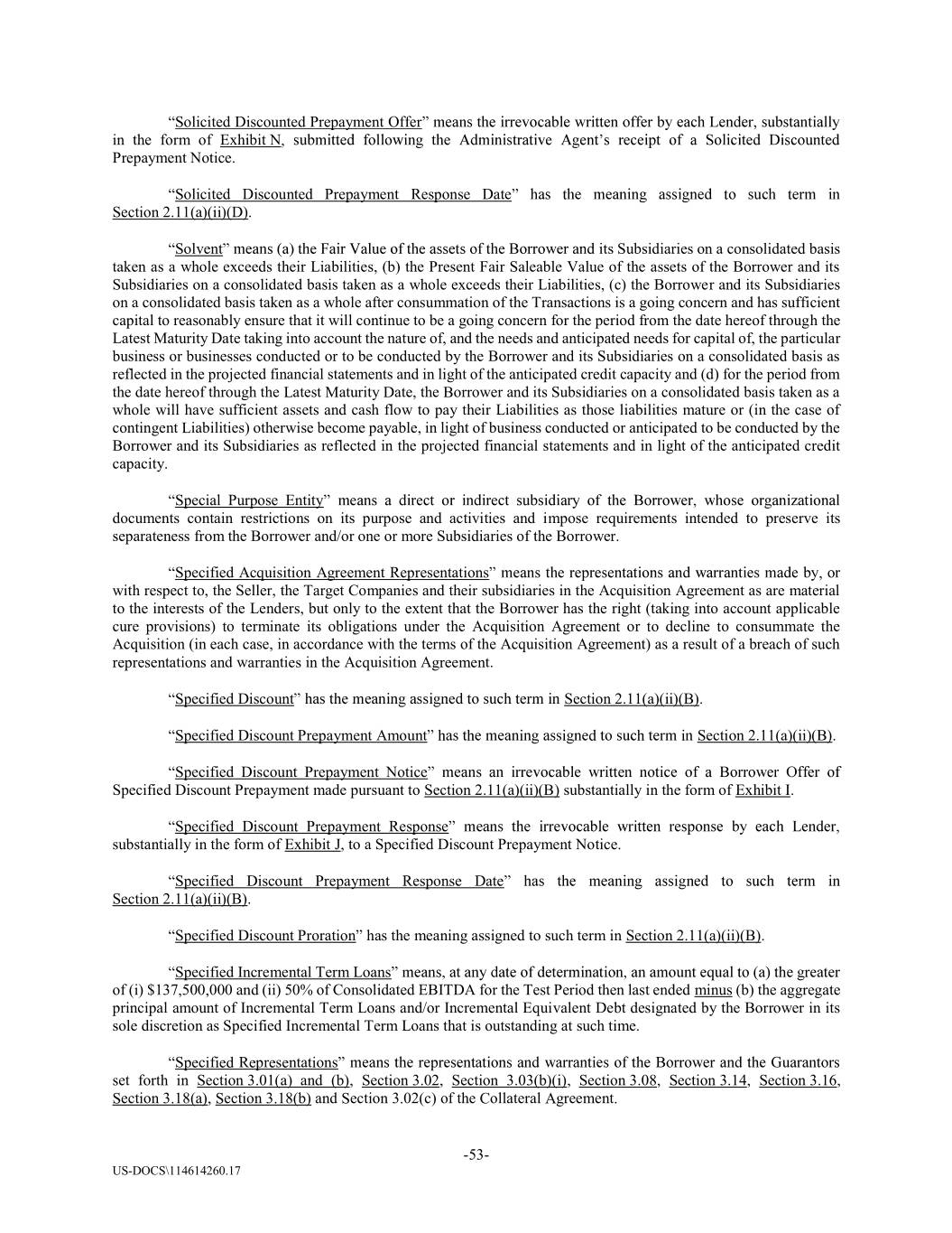 Solicited Discounted Prepayment Offer in the form of Exhibit N Prepayment Notice. Solicited Discounted Prepayment Response Date Section 2.11(a)(ii)(D). Solvent its Subsidiaries on a consolidated basis taken as a whole exceeds their Liabilities, (b) the Present Fair Saleable Value of the assets of the Borrower and its Subsidiaries on a consolidated basis taken as a whole exceeds their Liabilities, (c) the Borrower and its Subsidiaries on a consolidated basis taken as a whole after consummation of the Transactions is a going concern and has sufficient capital to reasonably ensure that it will continue to be a going concern for the period from the date hereof through the Latest Maturity Date taking into account the nature of, and the needs and anticipated needs for capital of, the particular business or businesses conducted or to be conducted by the Borrower and its Subsidiaries on a consolidated basis as reflected in the projected financial statements and in light of the anticipated credit capacity and (d) for the period from the date hereof through the Latest Maturity Date, the Borrower and its Subsidiaries on a consolidated basis taken as a whole will have sufficient assets and cash flow to pay their Liabilities as those liabilities mature or (in the case of contingent Liabilities) otherwise become payable, in light of business conducted or anticipated to be conducted by the Borrower and its Subsidiaries as reflected in the projected financial statements and in light of the anticipated credit capacity. Special Purpose Entity documents contain restrictions on its purpose and activities and impose requirements intended to preserve its separateness from the Borrower and/or one or more Subsidiaries of the Borrower. Specified Acquisition Agreement Representations with respect to, the Seller, the Target Companies and their subsidiaries in the Acquisition Agreement as are material to the interests of the Lenders, but only to the extent that the Borrower has the right (taking into account applicable cure provisions) to terminate its obligations under the Acquisition Agreement or to decline to consummate the Acquisition (in each case, in accordance with the terms of the Acquisition Agreement) as a result of a breach of such representations and warranties in the Acquisition Agreement. Specified Discount Section 2.11(a)(ii)(B). Specified Discount Prepayment Amount Section 2.11(a)(ii)(B). Specified Discount Prepayment Notice Specified Discount Prepayment made pursuant to Section 2.11(a)(ii)(B) substantially in the form of Exhibit I. Specified Discount Prepayment Response substantially in the form of Exhibit J, to a Specified Discount Prepayment Notice. Specified Discount Prepayment Response Date Section 2.11(a)(ii)(B). Specified Discount Proration has the meaning assigned to such term in Section 2.11(a)(ii)(B). Specified Incremental Term Loans of (i) $137,500,000 and (ii) 50% of Consolidated EBITDA for the Test Period then last ended minus (b) the aggregate principal amount of Incremental Term Loans and/or Incremental Equivalent Debt designated by the Borrower in its sole discretion as Specified Incremental Term Loans that is outstanding at such time. Specified Representations set forth in Section 3.01(a) and (b), Section 3.02, Section 3.03(b)(i), Section 3.08, Section 3.14, Section 3.16, Section 3.18(a), Section 3.18(b) and Section 3.02(c) of the Collateral Agreement. -53- US-DOCS\114614260.17