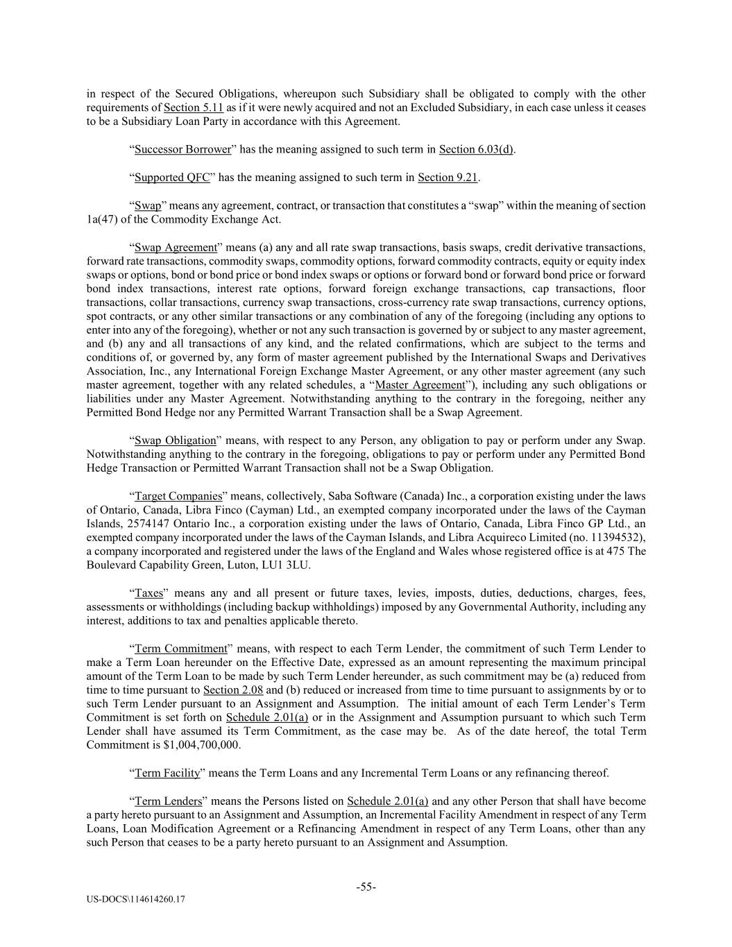 in respect of the Secured Obligations, whereupon such Subsidiary shall be obligated to comply with the other requirements of Section 5.11 as if it were newly acquired and not an Excluded Subsidiary, in each case unless it ceases to be a Subsidiary Loan Party in accordance with this Agreement. Successor Borrower Section 6.03(d). Supported QFC Section 9.21. Swap 1a(47) of the Commodity Exchange Act. Swap Agreement forward rate transactions, commodity swaps, commodity options, forward commodity contracts, equity or equity index swaps or options, bond or bond price or bond index swaps or options or forward bond or forward bond price or forward bond index transactions, interest rate options, forward foreign exchange transactions, cap transactions, floor transactions, collar transactions, currency swap transactions, cross-currency rate swap transactions, currency options, spot contracts, or any other similar transactions or any combination of any of the foregoing (including any options to enter into any of the foregoing), whether or not any such transaction is governed by or subject to any master agreement, and (b) any and all transactions of any kind, and the related confirmations, which are subject to the terms and conditions of, or governed by, any form of master agreement published by the International Swaps and Derivatives Association, Inc., any International Foreign Exchange Master Agreement, or any other master agreement (any such Master Agreement gations or liabilities under any Master Agreement. Notwithstanding anything to the contrary in the foregoing, neither any Permitted Bond Hedge nor any Permitted Warrant Transaction shall be a Swap Agreement. Swap Obligation son, any obligation to pay or perform under any Swap. Notwithstanding anything to the contrary in the foregoing, obligations to pay or perform under any Permitted Bond Hedge Transaction or Permitted Warrant Transaction shall not be a Swap Obligation. Target Companies of Ontario, Canada, Libra Finco (Cayman) Ltd., an exempted company incorporated under the laws of the Cayman Islands, 2574147 Ontario Inc., a corporation existing under the laws of Ontario, Canada, Libra Finco GP Ltd., an exempted company incorporated under the laws of the Cayman Islands, and Libra Acquireco Limited (no. 11394532), a company incorporated and registered under the laws of the England and Wales whose registered office is at 475 The Boulevard Capability Green, Luton, LU1 3LU. Taxes assessments or withholdings (including backup withholdings) imposed by any Governmental Authority, including any interest, additions to tax and penalties applicable thereto. Term Commitment make a Term Loan hereunder on the Effective Date, expressed as an amount representing the maximum principal amount of the Term Loan to be made by such Term Lender hereunder, as such commitment may be (a) reduced from time to time pursuant to Section 2.08 and (b) reduced or increased from time to time pursuant to assignments by or to Commitment is set forth on Schedule 2.01(a) or in the Assignment and Assumption pursuant to which such Term Lender shall have assumed its Term Commitment, as the case may be. As of the date hereof, the total Term Commitment is $1,004,700,000. Term Facility he Term Loans and any Incremental Term Loans or any refinancing thereof. Term Lenders Schedule 2.01(a) and any other Person that shall have become a party hereto pursuant to an Assignment and Assumption, an Incremental Facility Amendment in respect of any Term Loans, Loan Modification Agreement or a Refinancing Amendment in respect of any Term Loans, other than any such Person that ceases to be a party hereto pursuant to an Assignment and Assumption. -55- US-DOCS\114614260.17