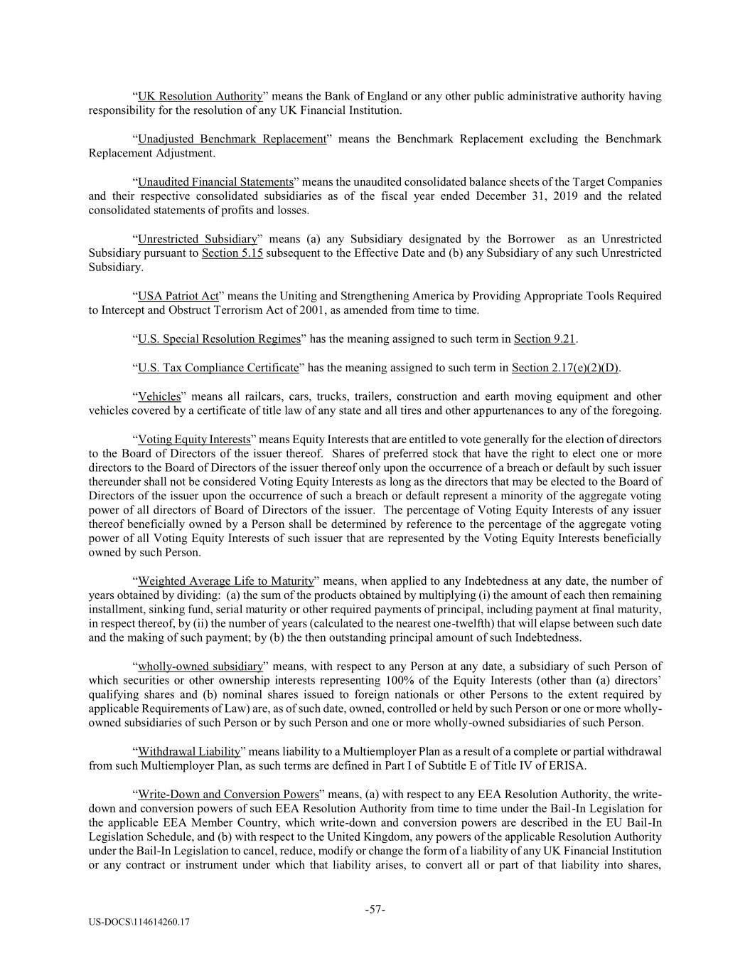 UK Resolution Authority responsibility for the resolution of any UK Financial Institution. Unadjusted Benchmark Replacement Replacement Adjustment. Unaudited Financial Statements the unaudited consolidated balance sheets of the Target Companies and their respective consolidated subsidiaries as of the fiscal year ended December 31, 2019 and the related consolidated statements of profits and losses. Unrestricted Subsidiary rrower as an Unrestricted Subsidiary pursuant to Section 5.15 subsequent to the Effective Date and (b) any Subsidiary of any such Unrestricted Subsidiary. USA Patriot Act to Intercept and Obstruct Terrorism Act of 2001, as amended from time to time. U.S. Special Resolution Regimes term in Section 9.21. U.S. Tax Compliance Certificate Section 2.17(e)(2)(D). Vehicles vehicles covered by a certificate of title law of any state and all tires and other appurtenances to any of the foregoing. Voting Equity Interests to the Board of Directors of the issuer thereof. Shares of preferred stock that have the right to elect one or more directors to the Board of Directors of the issuer thereof only upon the occurrence of a breach or default by such issuer thereunder shall not be considered Voting Equity Interests as long as the directors that may be elected to the Board of Directors of the issuer upon the occurrence of such a breach or default represent a minority of the aggregate voting power of all directors of Board of Directors of the issuer. The percentage of Voting Equity Interests of any issuer thereof beneficially owned by a Person shall be determined by reference to the percentage of the aggregate voting power of all Voting Equity Interests of such issuer that are represented by the Voting Equity Interests beneficially owned by such Person. Weighted Average Life to Maturity years obtained by dividing: (a) the sum of the products obtained by multiplying (i) the amount of each then remaining installment, sinking fund, serial maturity or other required payments of principal, including payment at final maturity, in respect thereof, by (ii) the number of years (calculated to the nearest one-twelfth) that will elapse between such date and the making of such payment; by (b) the then outstanding principal amount of such Indebtedness. wholly-owned subsidiary qualifying shares and (b) nominal shares issued to foreign nationals or other Persons to the extent required by applicable Requirements of Law) are, as of such date, owned, controlled or held by such Person or one or more wholly- owned subsidiaries of such Person or by such Person and one or more wholly-owned subsidiaries of such Person. Withdrawal Liability from such Multiemployer Plan, as such terms are defined in Part I of Subtitle E of Title IV of ERISA. Write-Down and Conversion Powers - down and conversion powers of such EEA Resolution Authority from time to time under the Bail-In Legislation for the applicable EEA Member Country, which write-down and conversion powers are described in the EU Bail-In Legislation Schedule, and (b) with respect to the United Kingdom, any powers of the applicable Resolution Authority under the Bail-In Legislation to cancel, reduce, modify or change the form of a liability of any UK Financial Institution or any contract or instrument under which that liability arises, to convert all or part of that liability into shares, -57- US-DOCS\114614260.17