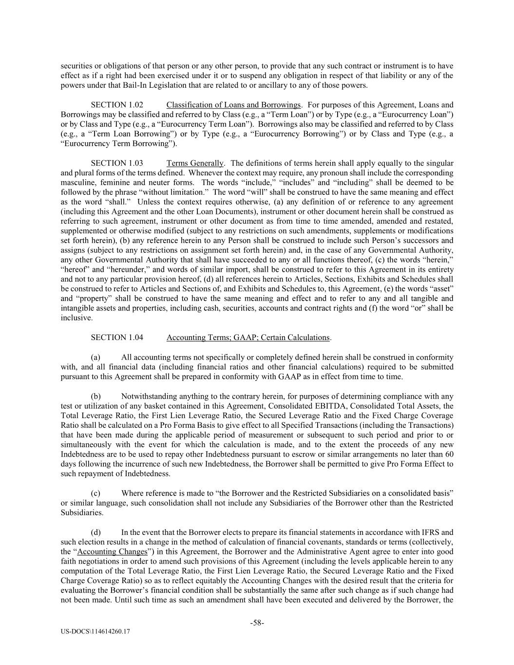 securities or obligations of that person or any other person, to provide that any such contract or instrument is to have effect as if a right had been exercised under it or to suspend any obligation in respect of that liability or any of the powers under that Bail-In Legislation that are related to or ancillary to any of those powers. SECTION 1.02 Classification of Loans and Borrowings. For purposes of this Agreement, Loans and SECTION 1.03 Terms Generally. The definitions of terms herein shall apply equally to the singular and plural forms of the terms defined. Whenever the context may require, any pronoun shall include the corresponding (including this Agreement and the other Loan Documents), instrument or other document herein shall be construed as referring to such agreement, instrument or other document as from time to time amended, amended and restated, supplemented or otherwise modified (subject to any restrictions on such amendments, supplements or modifications assigns (subject to any restrictions on assignment set forth herein) and, in the case of any Governmental Authority, fer to this Agreement in its entirety and not to any particular provision hereof, (d) all references herein to Articles, Sections, Exhibits and Schedules shall be construed to refer to Articles and Sections of, and Exhibits and Schedules to, this Agreement inclusive. SECTION 1.04 Accounting Terms; GAAP; Certain Calculations. (a) All accounting terms not specifically or completely defined herein shall be construed in conformity with, and all financial data (including financial ratios and other financial calculations) required to be submitted pursuant to this Agreement shall be prepared in conformity with GAAP as in effect from time to time. (b) Notwithstanding anything to the contrary herein, for purposes of determining compliance with any test or utilization of any basket contained in this Agreement, Consolidated EBITDA, Consolidated Total Assets, the Total Leverage Ratio, the First Lien Leverage Ratio, the Secured Leverage Ratio and the Fixed Charge Coverage Ratio shall be calculated on a Pro Forma Basis to give effect to all Specified Transactions (including the Transactions) that have been made during the applicable period of measurement or subsequent to such period and prior to or simultaneously with the event for which the calculation is made, and to the extent the proceeds of any new Indebtedness are to be used to repay other Indebtedness pursuant to escrow or similar arrangements no later than 60 days following the incurrence of such new Indebtedness, the Borrower shall be permitted to give Pro Forma Effect to such repayment of Indebtedness. (c) or similar language, such consolidation shall not include any Subsidiaries of the Borrower other than the Restricted Subsidiaries. (d) In the event that the Borrower elects to prepare its financial statements in accordance with IFRS and such election results in a change in the method of calculation of financial covenants, standards or terms (collectively, Accounting Changes nt, the Borrower and the Administrative Agent agree to enter into good faith negotiations in order to amend such provisions of this Agreement (including the levels applicable herein to any computation of the Total Leverage Ratio, the First Lien Leverage Ratio, the Secured Leverage Ratio and the Fixed Charge Coverage Ratio) so as to reflect equitably the Accounting Changes with the desired result that the criteria for ange as if such change had not been made. Until such time as such an amendment shall have been executed and delivered by the Borrower, the -58- US-DOCS\114614260.17