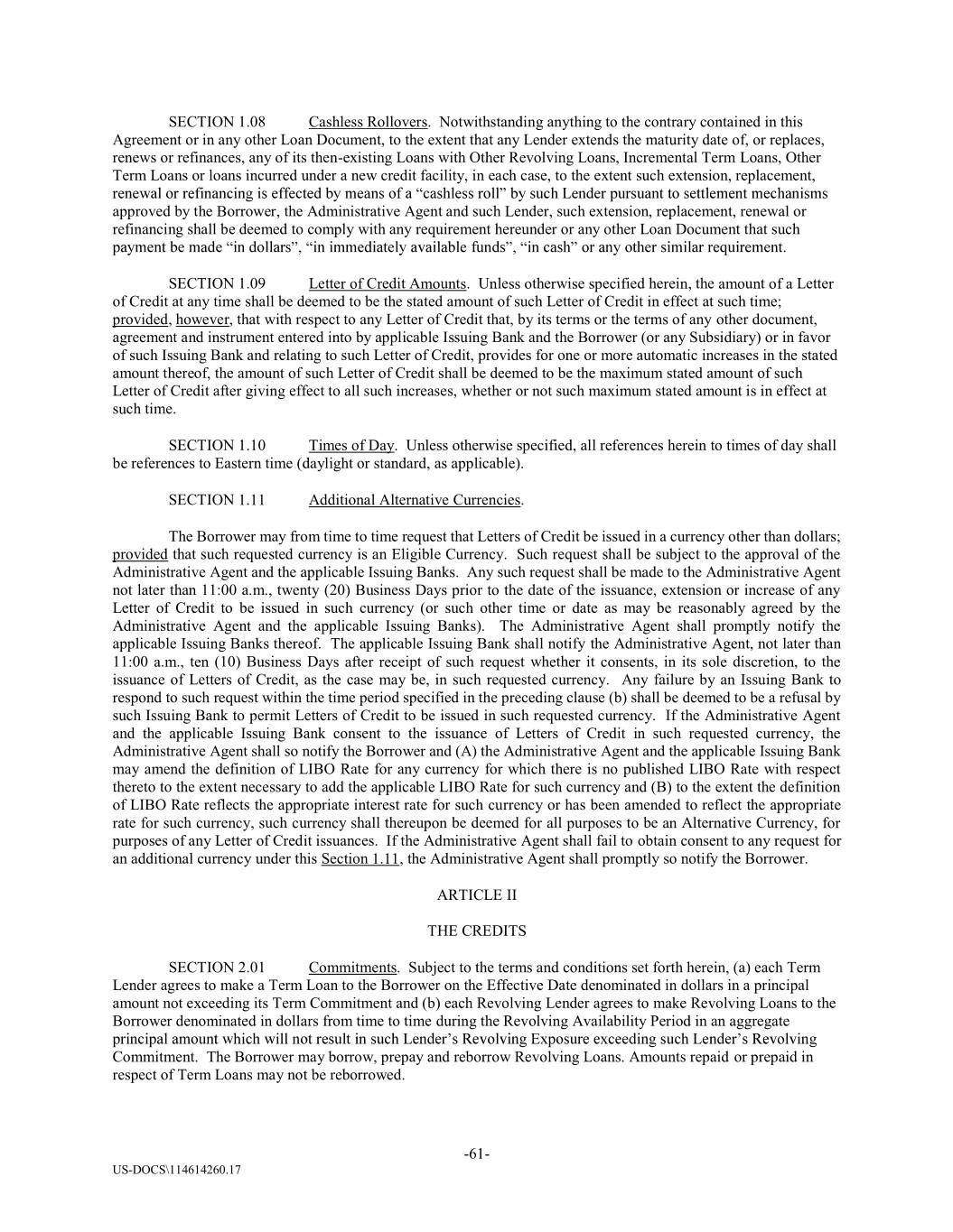 SECTION 1.08 Cashless Rollovers. Notwithstanding anything to the contrary contained in this Agreement or in any other Loan Document, to the extent that any Lender extends the maturity date of, or replaces, renews or refinances, any of its then-existing Loans with Other Revolving Loans, Incremental Term Loans, Other Term Loans or loans incurred under a new credit facility, in each case, to the extent such extension, replacement, approved by the Borrower, the Administrative Agent and such Lender, such extension, replacement, renewal or refinancing shall be deemed to comply with any requirement hereunder or any other Loan Document that such SECTION 1.09 Letter of Credit Amounts. Unless otherwise specified herein, the amount of a Letter of Credit at any time shall be deemed to be the stated amount of such Letter of Credit in effect at such time; provided, however, that with respect to any Letter of Credit that, by its terms or the terms of any other document, agreement and instrument entered into by applicable Issuing Bank and the Borrower (or any Subsidiary) or in favor of such Issuing Bank and relating to such Letter of Credit, provides for one or more automatic increases in the stated amount thereof, the amount of such Letter of Credit shall be deemed to be the maximum stated amount of such Letter of Credit after giving effect to all such increases, whether or not such maximum stated amount is in effect at such time. SECTION 1.10 Times of Day. Unless otherwise specified, all references herein to times of day shall be references to Eastern time (daylight or standard, as applicable). SECTION 1.11 Additional Alternative Currencies. The Borrower may from time to time request that Letters of Credit be issued in a currency other than dollars; provided that such requested currency is an Eligible Currency. Such request shall be subject to the approval of the Administrative Agent and the applicable Issuing Banks. Any such request shall be made to the Administrative Agent not later than 11:00 a.m., twenty (20) Business Days prior to the date of the issuance, extension or increase of any Letter of Credit to be issued in such currency (or such other time or date as may be reasonably agreed by the Administrative Agent and the applicable Issuing Banks). The Administrative Agent shall promptly notify the applicable Issuing Banks thereof. The applicable Issuing Bank shall notify the Administrative Agent, not later than 11:00 a.m., ten (10) Business Days after receipt of such request whether it consents, in its sole discretion, to the issuance of Letters of Credit, as the case may be, in such requested currency. Any failure by an Issuing Bank to respond to such request within the time period specified in the preceding clause (b) shall be deemed to be a refusal by such Issuing Bank to permit Letters of Credit to be issued in such requested currency. If the Administrative Agent and the applicable Issuing Bank consent to the issuance of Letters of Credit in such requested currency, the Administrative Agent shall so notify the Borrower and (A) the Administrative Agent and the applicable Issuing Bank may amend the definition of LIBO Rate for any currency for which there is no published LIBO Rate with respect thereto to the extent necessary to add the applicable LIBO Rate for such currency and (B) to the extent the definition of LIBO Rate reflects the appropriate interest rate for such currency or has been amended to reflect the appropriate rate for such currency, such currency shall thereupon be deemed for all purposes to be an Alternative Currency, for purposes of any Letter of Credit issuances. If the Administrative Agent shall fail to obtain consent to any request for an additional currency under this Section 1.11, the Administrative Agent shall promptly so notify the Borrower. ARTICLE II THE CREDITS SECTION 2.01 Commitments. Subject to the terms and conditions set forth herein, (a) each Term Lender agrees to make a Term Loan to the Borrower on the Effective Date denominated in dollars in a principal amount not exceeding its Term Commitment and (b) each Revolving Lender agrees to make Revolving Loans to the Borrower denominated in dollars from time to time during the Revolving Availability Period in an aggregate Commitment. The Borrower may borrow, prepay and reborrow Revolving Loans. Amounts repaid or prepaid in respect of Term Loans may not be reborrowed. -61- US-DOCS\114614260.17