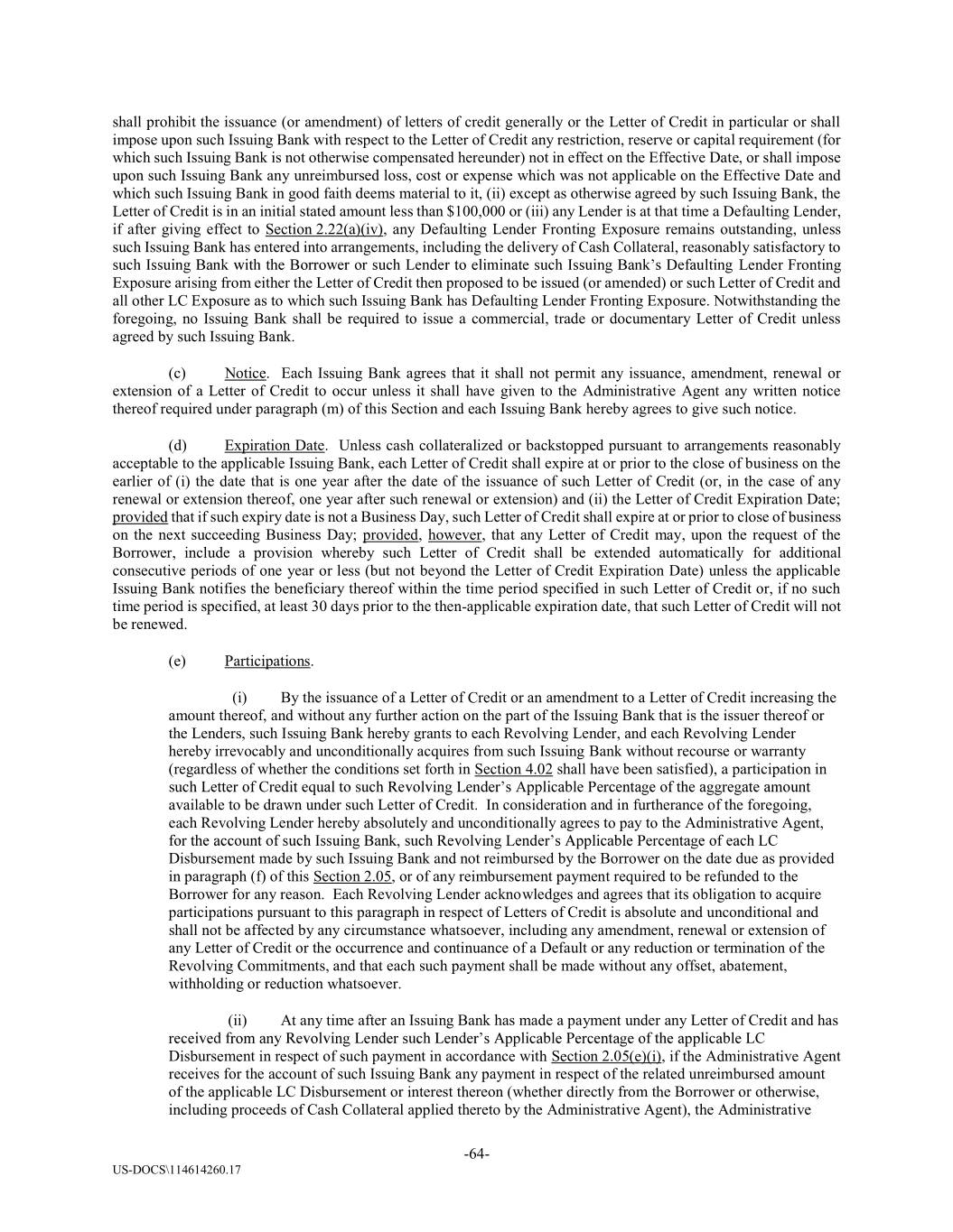 shall prohibit the issuance (or amendment) of letters of credit generally or the Letter of Credit in particular or shall impose upon such Issuing Bank with respect to the Letter of Credit any restriction, reserve or capital requirement (for which such Issuing Bank is not otherwise compensated hereunder) not in effect on the Effective Date, or shall impose upon such Issuing Bank any unreimbursed loss, cost or expense which was not applicable on the Effective Date and which such Issuing Bank in good faith deems material to it, (ii) except as otherwise agreed by such Issuing Bank, the Letter of Credit is in an initial stated amount less than $100,000 or (iii) any Lender is at that time a Defaulting Lender, if after giving effect to Section 2.22(a)(iv), any Defaulting Lender Fronting Exposure remains outstanding, unless such Issuing Bank has entered into arrangements, including the delivery of Cash Collateral, reasonably satisfactory to Lender Fronting Exposure arising from either the Letter of Credit then proposed to be issued (or amended) or such Letter of Credit and all other LC Exposure as to which such Issuing Bank has Defaulting Lender Fronting Exposure. Notwithstanding the foregoing, no Issuing Bank shall be required to issue a commercial, trade or documentary Letter of Credit unless agreed by such Issuing Bank. (c) Notice. Each Issuing Bank agrees that it shall not permit any issuance, amendment, renewal or extension of a Letter of Credit to occur unless it shall have given to the Administrative Agent any written notice thereof required under paragraph (m) of this Section and each Issuing Bank hereby agrees to give such notice. (d) Expiration Date. Unless cash collateralized or backstopped pursuant to arrangements reasonably acceptable to the applicable Issuing Bank, each Letter of Credit shall expire at or prior to the close of business on the earlier of (i) the date that is one year after the date of the issuance of such Letter of Credit (or, in the case of any renewal or extension thereof, one year after such renewal or extension) and (ii) the Letter of Credit Expiration Date; provided that if such expiry date is not a Business Day, such Letter of Credit shall expire at or prior to close of business on the next succeeding Business Day; provided, however, that any Letter of Credit may, upon the request of the Borrower, include a provision whereby such Letter of Credit shall be extended automatically for additional consecutive periods of one year or less (but not beyond the Letter of Credit Expiration Date) unless the applicable Issuing Bank notifies the beneficiary thereof within the time period specified in such Letter of Credit or, if no such time period is specified, at least 30 days prior to the then-applicable expiration date, that such Letter of Credit will not be renewed. (e) Participations. (i) By the issuance of a Letter of Credit or an amendment to a Letter of Credit increasing the amount thereof, and without any further action on the part of the Issuing Bank that is the issuer thereof or the Lenders, such Issuing Bank hereby grants to each Revolving Lender, and each Revolving Lender hereby irrevocably and unconditionally acquires from such Issuing Bank without recourse or warranty (regardless of whether the conditions set forth in Section 4.02 shall have been satisfied), a participation in su available to be drawn under such Letter of Credit. In consideration and in furtherance of the foregoing, each Revolving Lender hereby absolutely and unconditionally agrees to pay to the Administrative Agent, Disbursement made by such Issuing Bank and not reimbursed by the Borrower on the date due as provided in paragraph (f) of this Section 2.05, or of any reimbursement payment required to be refunded to the Borrower for any reason. Each Revolving Lender acknowledges and agrees that its obligation to acquire participations pursuant to this paragraph in respect of Letters of Credit is absolute and unconditional and shall not be affected by any circumstance whatsoever, including any amendment, renewal or extension of any Letter of Credit or the occurrence and continuance of a Default or any reduction or termination of the Revolving Commitments, and that each such payment shall be made without any offset, abatement, withholding or reduction whatsoever. (ii) At any time after an Issuing Bank has made a payment under any Letter of Credit and has Disbursement in respect of such payment in accordance with Section 2.05(e)(i), if the Administrative Agent receives for the account of such Issuing Bank any payment in respect of the related unreimbursed amount of the applicable LC Disbursement or interest thereon (whether directly from the Borrower or otherwise, including proceeds of Cash Collateral applied thereto by the Administrative Agent), the Administrative -64- US-DOCS\114614260.17