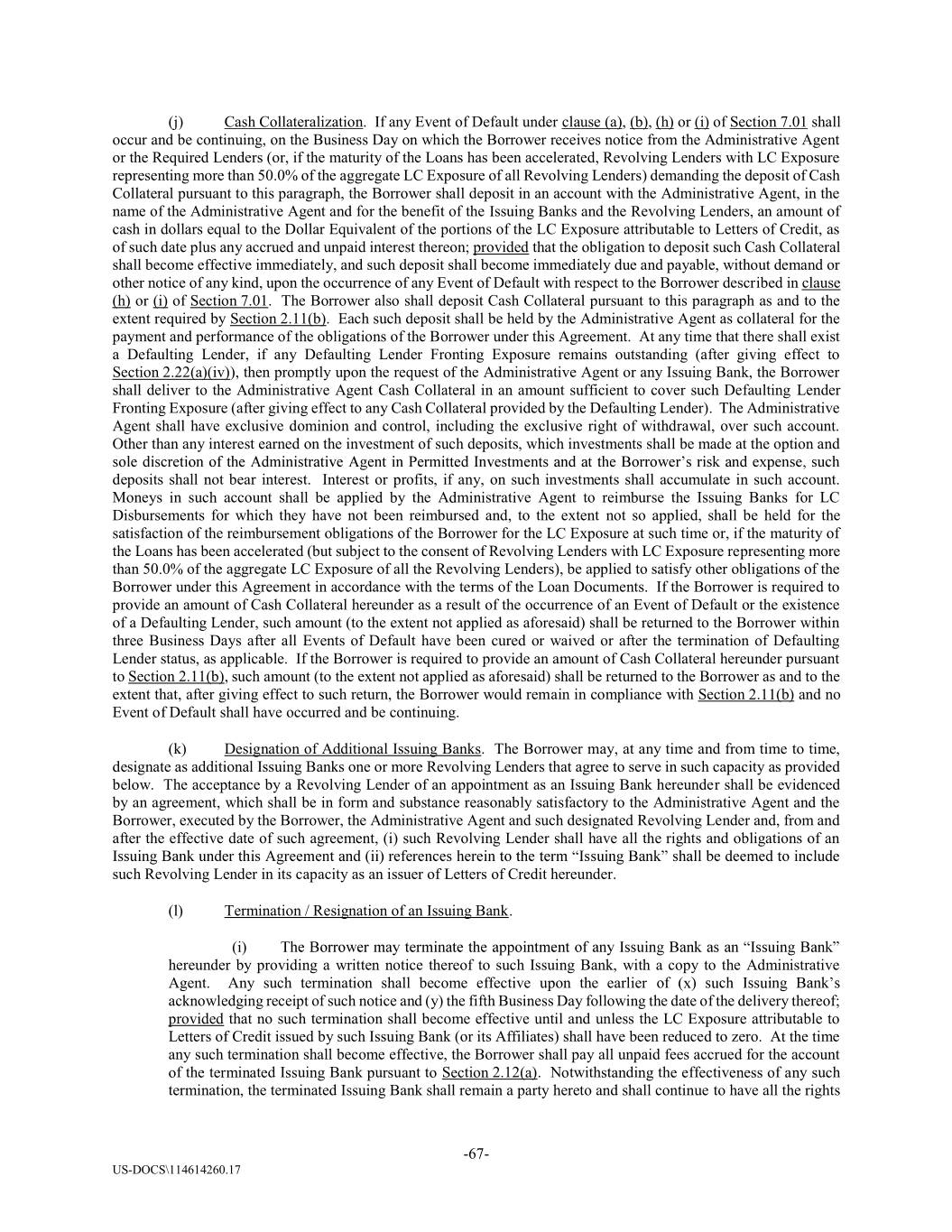 (j) Cash Collateralization. If any Event of Default under clause (a), (b), (h) or (i) of Section 7.01 shall occur and be continuing, on the Business Day on which the Borrower receives notice from the Administrative Agent or the Required Lenders (or, if the maturity of the Loans has been accelerated, Revolving Lenders with LC Exposure representing more than 50.0% of the aggregate LC Exposure of all Revolving Lenders) demanding the deposit of Cash Collateral pursuant to this paragraph, the Borrower shall deposit in an account with the Administrative Agent, in the name of the Administrative Agent and for the benefit of the Issuing Banks and the Revolving Lenders, an amount of cash in dollars equal to the Dollar Equivalent of the portions of the LC Exposure attributable to Letters of Credit, as of such date plus any accrued and unpaid interest thereon; provided that the obligation to deposit such Cash Collateral shall become effective immediately, and such deposit shall become immediately due and payable, without demand or other notice of any kind, upon the occurrence of any Event of Default with respect to the Borrower described in clause (h) or (i) of Section 7.01. The Borrower also shall deposit Cash Collateral pursuant to this paragraph as and to the extent required by Section 2.11(b). Each such deposit shall be held by the Administrative Agent as collateral for the payment and performance of the obligations of the Borrower under this Agreement. At any time that there shall exist a Defaulting Lender, if any Defaulting Lender Fronting Exposure remains outstanding (after giving effect to Section 2.22(a)(iv)), then promptly upon the request of the Administrative Agent or any Issuing Bank, the Borrower shall deliver to the Administrative Agent Cash Collateral in an amount sufficient to cover such Defaulting Lender Fronting Exposure (after giving effect to any Cash Collateral provided by the Defaulting Lender). The Administrative Agent shall have exclusive dominion and control, including the exclusive right of withdrawal, over such account. Other than any interest earned on the investment of such deposits, which investments shall be made at the option and deposits shall not bear interest. Interest or profits, if any, on such investments shall accumulate in such account. Moneys in such account shall be applied by the Administrative Agent to reimburse the Issuing Banks for LC Disbursements for which they have not been reimbursed and, to the extent not so applied, shall be held for the satisfaction of the reimbursement obligations of the Borrower for the LC Exposure at such time or, if the maturity of the Loans has been accelerated (but subject to the consent of Revolving Lenders with LC Exposure representing more than 50.0% of the aggregate LC Exposure of all the Revolving Lenders), be applied to satisfy other obligations of the Borrower under this Agreement in accordance with the terms of the Loan Documents. If the Borrower is required to provide an amount of Cash Collateral hereunder as a result of the occurrence of an Event of Default or the existence of a Defaulting Lender, such amount (to the extent not applied as aforesaid) shall be returned to the Borrower within three Business Days after all Events of Default have been cured or waived or after the termination of Defaulting Lender status, as applicable. If the Borrower is required to provide an amount of Cash Collateral hereunder pursuant to Section 2.11(b), such amount (to the extent not applied as aforesaid) shall be returned to the Borrower as and to the extent that, after giving effect to such return, the Borrower would remain in compliance with Section 2.11(b) and no Event of Default shall have occurred and be continuing. (k) Designation of Additional Issuing Banks. The Borrower may, at any time and from time to time, designate as additional Issuing Banks one or more Revolving Lenders that agree to serve in such capacity as provided below. The acceptance by a Revolving Lender of an appointment as an Issuing Bank hereunder shall be evidenced by an agreement, which shall be in form and substance reasonably satisfactory to the Administrative Agent and the Borrower, executed by the Borrower, the Administrative Agent and such designated Revolving Lender and, from and after the effective date of such agreement, (i) such Revolving Lender shall have all the rights and obligations of an such Revolving Lender in its capacity as an issuer of Letters of Credit hereunder. (l) Termination / Resignation of an Issuing Bank. (i) hereunder by providing a written notice thereof to such Issuing Bank, with a copy to the Administrative Agent. Any such termination shall become effective upon the earlier acknowledging receipt of such notice and (y) the fifth Business Day following the date of the delivery thereof; provided that no such termination shall become effective until and unless the LC Exposure attributable to Letters of Credit issued by such Issuing Bank (or its Affiliates) shall have been reduced to zero. At the time any such termination shall become effective, the Borrower shall pay all unpaid fees accrued for the account of the terminated Issuing Bank pursuant to Section 2.12(a). Notwithstanding the effectiveness of any such termination, the terminated Issuing Bank shall remain a party hereto and shall continue to have all the rights -67- US-DOCS\114614260.17