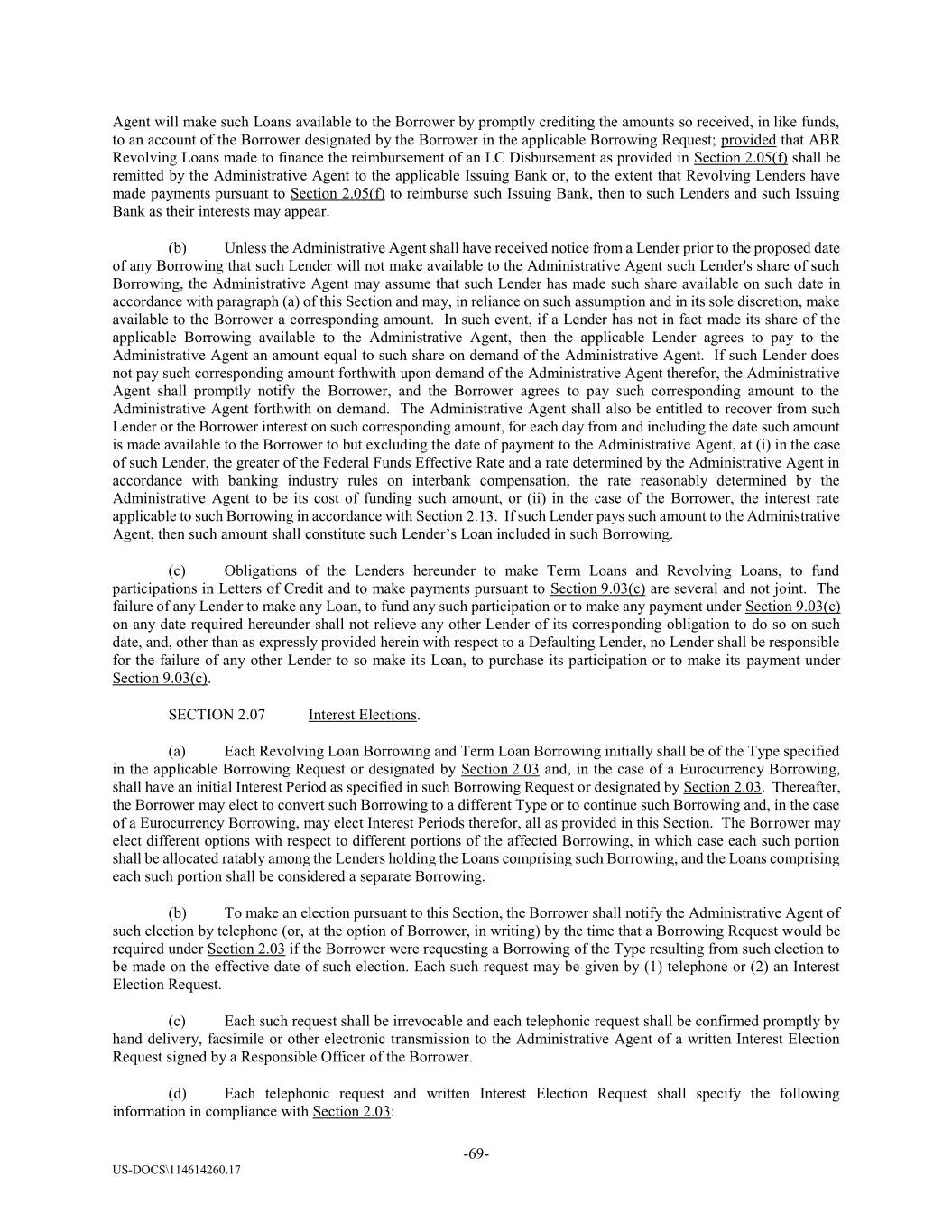 Agent will make such Loans available to the Borrower by promptly crediting the amounts so received, in like funds, to an account of the Borrower designated by the Borrower in the applicable Borrowing Request; provided that ABR Revolving Loans made to finance the reimbursement of an LC Disbursement as provided in Section 2.05(f) shall be remitted by the Administrative Agent to the applicable Issuing Bank or, to the extent that Revolving Lenders have made payments pursuant to Section 2.05(f) to reimburse such Issuing Bank, then to such Lenders and such Issuing Bank as their interests may appear. (b) Unless the Administrative Agent shall have received notice from a Lender prior to the proposed date of any Borrowing that such Lender will not make available to the Administrative Agent such Lender's share of such Borrowing, the Administrative Agent may assume that such Lender has made such share available on such date in accordance with paragraph (a) of this Section and may, in reliance on such assumption and in its sole discretion, make available to the Borrower a corresponding amount. In such event, if a Lender has not in fact made its share of the applicable Borrowing available to the Administrative Agent, then the applicable Lender agrees to pay to the Administrative Agent an amount equal to such share on demand of the Administrative Agent. If such Lender does not pay such corresponding amount forthwith upon demand of the Administrative Agent therefor, the Administrative Agent shall promptly notify the Borrower, and the Borrower agrees to pay such corresponding amount to the Administrative Agent forthwith on demand. The Administrative Agent shall also be entitled to recover from such Lender or the Borrower interest on such corresponding amount, for each day from and including the date such amount is made available to the Borrower to but excluding the date of payment to the Administrative Agent, at (i) in the case of such Lender, the greater of the Federal Funds Effective Rate and a rate determined by the Administrative Agent in accordance with banking industry rules on interbank compensation, the rate reasonably determined by the Administrative Agent to be its cost of funding such amount, or (ii) in the case of the Borrower, the interest rate applicable to such Borrowing in accordance with Section 2.13. If such Lender pays such amount to the Administrative (c) Obligations of the Lenders hereunder to make Term Loans and Revolving Loans, to fund participations in Letters of Credit and to make payments pursuant to Section 9.03(c) are several and not joint. The failure of any Lender to make any Loan, to fund any such participation or to make any payment under Section 9.03(c) on any date required hereunder shall not relieve any other Lender of its corresponding obligation to do so on such date, and, other than as expressly provided herein with respect to a Defaulting Lender, no Lender shall be responsible for the failure of any other Lender to so make its Loan, to purchase its participation or to make its payment under Section 9.03(c). SECTION 2.07 Interest Elections. (a) Each Revolving Loan Borrowing and Term Loan Borrowing initially shall be of the Type specified in the applicable Borrowing Request or designated by Section 2.03 and, in the case of a Eurocurrency Borrowing, shall have an initial Interest Period as specified in such Borrowing Request or designated by Section 2.03. Thereafter, the Borrower may elect to convert such Borrowing to a different Type or to continue such Borrowing and, in the case of a Eurocurrency Borrowing, may elect Interest Periods therefor, all as provided in this Section. The Borrower may elect different options with respect to different portions of the affected Borrowing, in which case each such portion shall be allocated ratably among the Lenders holding the Loans comprising such Borrowing, and the Loans comprising each such portion shall be considered a separate Borrowing. (b) To make an election pursuant to this Section, the Borrower shall notify the Administrative Agent of such election by telephone (or, at the option of Borrower, in writing) by the time that a Borrowing Request would be required under Section 2.03 if the Borrower were requesting a Borrowing of the Type resulting from such election to be made on the effective date of such election. Each such request may be given by (1) telephone or (2) an Interest Election Request. (c) Each such request shall be irrevocable and each telephonic request shall be confirmed promptly by hand delivery, facsimile or other electronic transmission to the Administrative Agent of a written Interest Election Request signed by a Responsible Officer of the Borrower. (d) Each telephonic request and written Interest Election Request shall specify the following information in compliance with Section 2.03: -69- US-DOCS\114614260.17