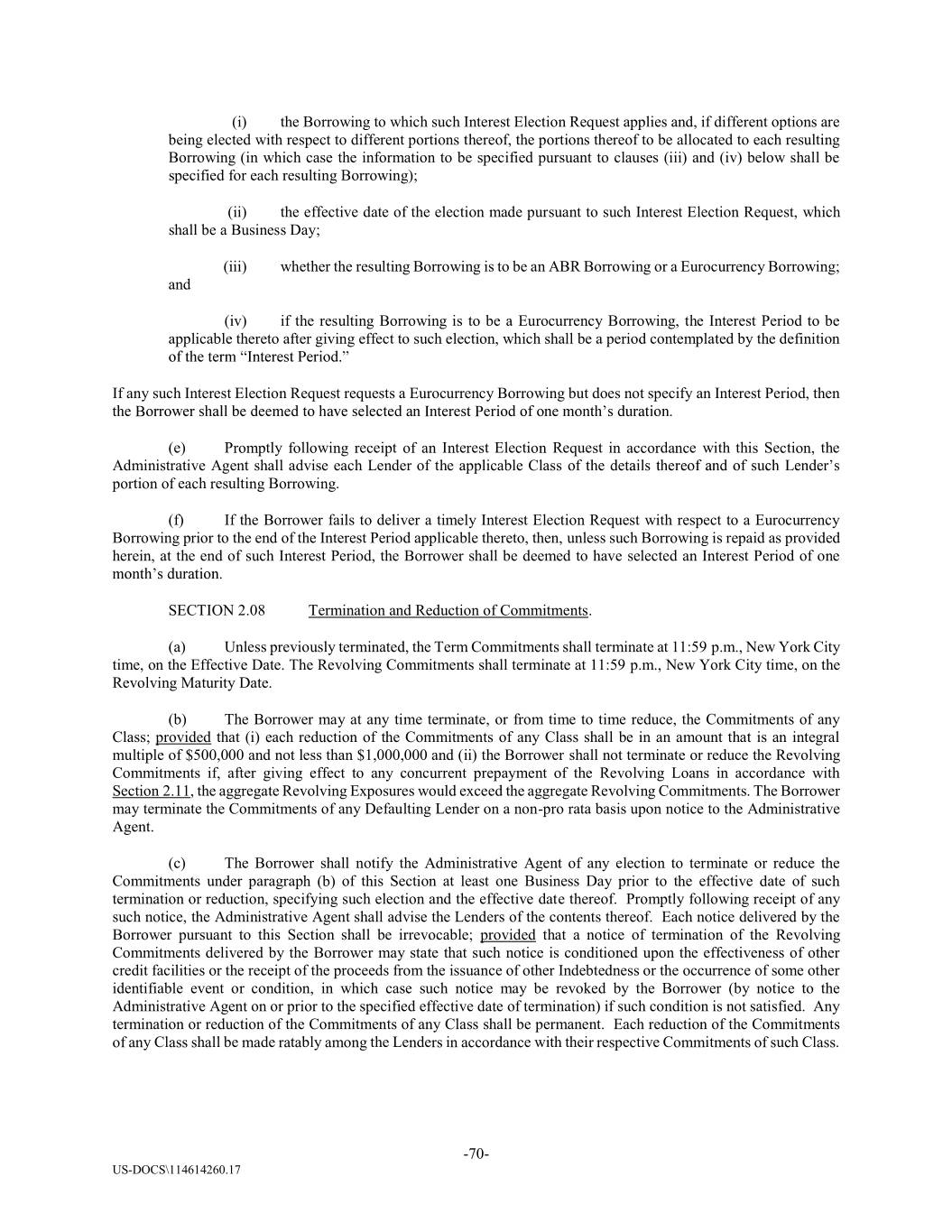 (i) the Borrowing to which such Interest Election Request applies and, if different options are being elected with respect to different portions thereof, the portions thereof to be allocated to each resulting Borrowing (in which case the information to be specified pursuant to clauses (iii) and (iv) below shall be specified for each resulting Borrowing); (ii) the effective date of the election made pursuant to such Interest Election Request, which shall be a Business Day; (iii) whether the resulting Borrowing is to be an ABR Borrowing or a Eurocurrency Borrowing; and (iv) if the resulting Borrowing is to be a Eurocurrency Borrowing, the Interest Period to be applicable thereto after giving effect to such election, which shall be a period contemplated by the definition If any such Interest Election Request requests a Eurocurrency Borrowing but does not specify an Interest Period, then (e) Promptly following receipt of an Interest Election Request in accordance with this Section, the Administrative Agent shall advise each Lender of the applicable Class portion of each resulting Borrowing. (f) If the Borrower fails to deliver a timely Interest Election Request with respect to a Eurocurrency Borrowing prior to the end of the Interest Period applicable thereto, then, unless such Borrowing is repaid as provided herein, at the end of such Interest Period, the Borrower shall be deemed to have selected an Interest Period of one SECTION 2.08 Termination and Reduction of Commitments. (a) Unless previously terminated, the Term Commitments shall terminate at 11:59 p.m., New York City time, on the Effective Date. The Revolving Commitments shall terminate at 11:59 p.m., New York City time, on the Revolving Maturity Date. (b) The Borrower may at any time terminate, or from time to time reduce, the Commitments of any Class; provided that (i) each reduction of the Commitments of any Class shall be in an amount that is an integral multiple of $500,000 and not less than $1,000,000 and (ii) the Borrower shall not terminate or reduce the Revolving Commitments if, after giving effect to any concurrent prepayment of the Revolving Loans in accordance with Section 2.11, the aggregate Revolving Exposures would exceed the aggregate Revolving Commitments. The Borrower may terminate the Commitments of any Defaulting Lender on a non-pro rata basis upon notice to the Administrative Agent. (c) The Borrower shall notify the Administrative Agent of any election to terminate or reduce the Commitments under paragraph (b) of this Section at least one Business Day prior to the effective date of such termination or reduction, specifying such election and the effective date thereof. Promptly following receipt of any such notice, the Administrative Agent shall advise the Lenders of the contents thereof. Each notice delivered by the Borrower pursuant to this Section shall be irrevocable; provided that a notice of termination of the Revolving Commitments delivered by the Borrower may state that such notice is conditioned upon the effectiveness of other credit facilities or the receipt of the proceeds from the issuance of other Indebtedness or the occurrence of some other identifiable event or condition, in which case such notice may be revoked by the Borrower (by notice to the Administrative Agent on or prior to the specified effective date of termination) if such condition is not satisfied. Any termination or reduction of the Commitments of any Class shall be permanent. Each reduction of the Commitments of any Class shall be made ratably among the Lenders in accordance with their respective Commitments of such Class. -70- US-DOCS\114614260.17