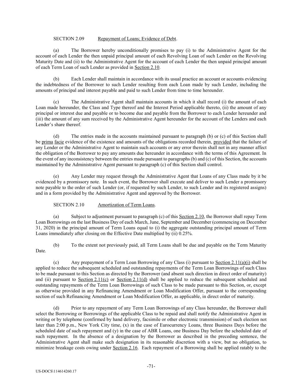 SECTION 2.09 Repayment of Loans; Evidence of Debt. (a) The Borrower hereby unconditionally promises to pay (i) to the Administrative Agent for the account of each Lender the then unpaid principal amount of each Revolving Loan of such Lender on the Revolving Maturity Date and (ii) to the Administrative Agent for the account of each Lender the then unpaid principal amount of each Term Loan of such Lender as provided in Section 2.10. (b) Each Lender shall maintain in accordance with its usual practice an account or accounts evidencing the indebtedness of the Borrower to such Lender resulting from each Loan made by such Lender, including the amounts of principal and interest payable and paid to such Lender from time to time hereunder. (c) The Administrative Agent shall maintain accounts in which it shall record (i) the amount of each Loan made hereunder, the Class and Type thereof and the Interest Period applicable thereto, (ii) the amount of any principal or interest due and payable or to become due and payable from the Borrower to each Lender hereunder and (iii) the amount of any sum received by the Administrative Agent hereunder for the account of the Lenders and each (d) The entries made in the accounts maintained pursuant to paragraph (b) or (c) of this Section shall be prima facie evidence of the existence and amounts of the obligations recorded therein, provided that the failure of any Lender or the Administrative Agent to maintain such accounts or any error therein shall not in any manner affect the obligation of the Borrower to pay any amounts due hereunder in accordance with the terms of this Agreement. In the event of any inconsistency between the entries made pursuant to paragraphs (b) and (c) of this Section, the accounts maintained by the Administrative Agent pursuant to paragraph (c) of this Section shall control. (e) Any Lender may request through the Administrative Agent that Loans of any Class made by it be evidenced by a promissory note. In such event, the Borrower shall execute and deliver to such Lender a promissory note payable to the order of such Lender (or, if requested by such Lender, to such Lender and its registered assigns) and in a form provided by the Administrative Agent and approved by the Borrower. SECTION 2.10 Amortization of Term Loans. (a) Subject to adjustment pursuant to paragraph (c) of this Section 2.10, the Borrower shall repay Term Loan Borrowings on the last Business Day of each March, June, September and December (commencing on December 31, 2020) in the principal amount of Term Loans equal to (i) the aggregate outstanding principal amount of Term Loans immediately after closing on the Effective Date multiplied by (ii) 0.25%. (b) To the extent not previously paid, all Term Loans shall be due and payable on the Term Maturity Date. (c) Any prepayment of a Term Loan Borrowing of any Class (i) pursuant to Section 2.11(a)(i) shall be applied to reduce the subsequent scheduled and outstanding repayments of the Term Loan Borrowings of such Class to be made pursuant to this Section as directed by the Borrower (and absent such direction in direct order of maturity) and (ii) pursuant to Section 2.11(c) or Section 2.11(d) shall be applied to reduce the subsequent scheduled and outstanding repayments of the Term Loan Borrowings of such Class to be made pursuant to this Section, or, except as otherwise provided in any Refinancing Amendment or Loan Modification Offer, pursuant to the corresponding section of such Refinancing Amendment or Loan Modification Offer, as applicable, in direct order of maturity. (d) Prior to any repayment of any Term Loan Borrowings of any Class hereunder, the Borrower shall select the Borrowing or Borrowings of the applicable Class to be repaid and shall notify the Administrative Agent in writing or by telephone (confirmed by hand delivery, facsimile or other electronic transmission) of such election not later than 2:00 p.m., New York City time, (x) in the case of Eurocurrency Loans, three Business Days before the scheduled date of such repayment and (y) in the case of ABR Loans, one Business Day before the scheduled date of such repayment. In the absence of a designation by the Borrower as described in the preceding sentence, the Administrative Agent shall make such designation in its reasonable discretion with a view, but no obligation, to minimize breakage costs owing under Section 2.16. Each repayment of a Borrowing shall be applied ratably to the -71- US-DOCS\114614260.17