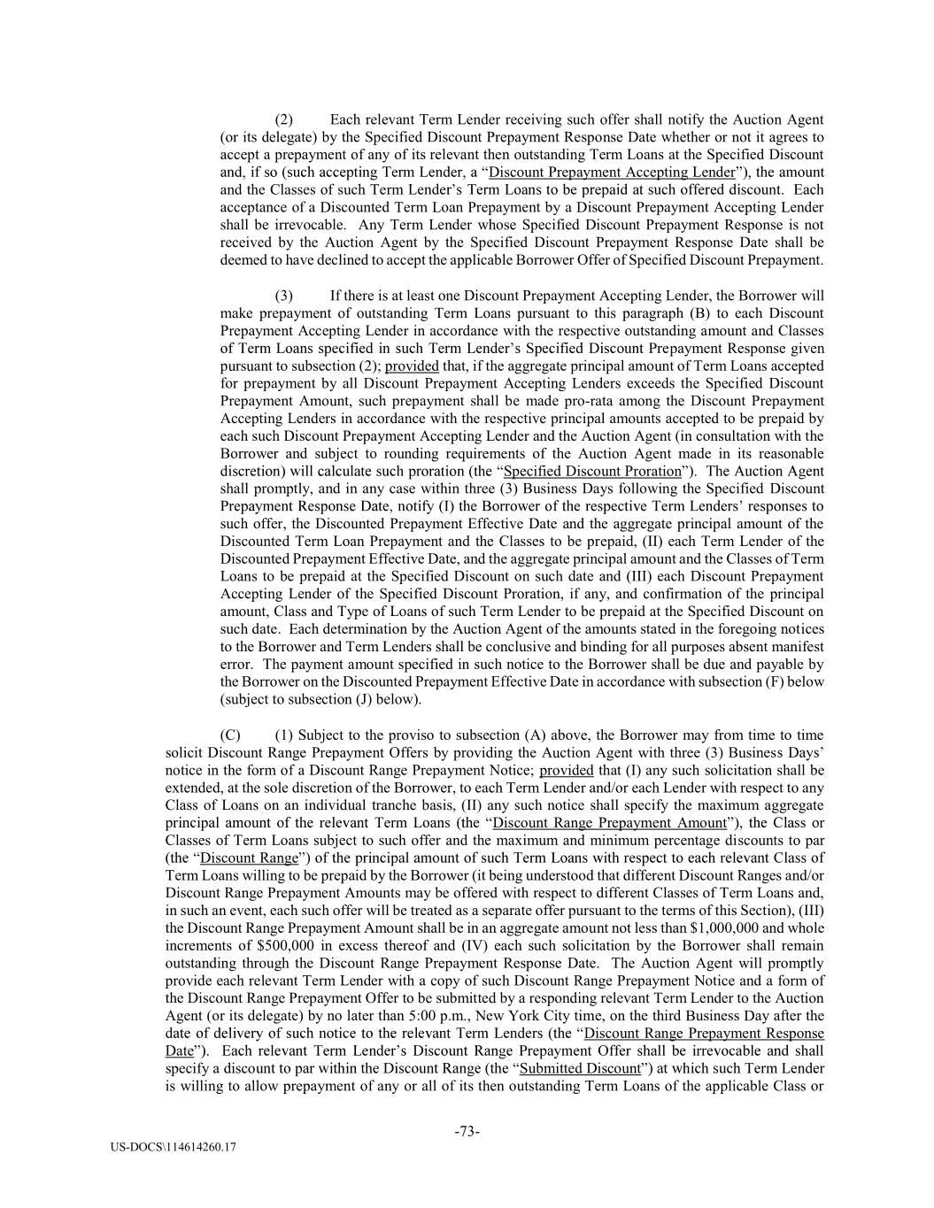 (2) Each relevant Term Lender receiving such offer shall notify the Auction Agent (or its delegate) by the Specified Discount Prepayment Response Date whether or not it agrees to accept a prepayment of any of its relevant then outstanding Term Loans at the Specified Discount Discount Prepayment Accepting Lender and the Classes of such Term acceptance of a Discounted Term Loan Prepayment by a Discount Prepayment Accepting Lender shall be irrevocable. Any Term Lender whose Specified Discount Prepayment Response is not received by the Auction Agent by the Specified Discount Prepayment Response Date shall be deemed to have declined to accept the applicable Borrower Offer of Specified Discount Prepayment. (3) If there is at least one Discount Prepayment Accepting Lender, the Borrower will make prepayment of outstanding Term Loans pursuant to this paragraph (B) to each Discount Prepayment Accepting Lender in accordance with the respective outstanding amount and Classes payment Response given pursuant to subsection (2); provided that, if the aggregate principal amount of Term Loans accepted for prepayment by all Discount Prepayment Accepting Lenders exceeds the Specified Discount Prepayment Amount, such prepayment shall be made pro-rata among the Discount Prepayment Accepting Lenders in accordance with the respective principal amounts accepted to be prepaid by each such Discount Prepayment Accepting Lender and the Auction Agent (in consultation with the Borrower and subject to rounding requirements of the Auction Agent made in its reasonable Specified Discount Proration shall promptly, and in any case within three (3) Business Days following the Specified Discount such offer, the Discounted Prepayment Effective Date and the aggregate principal amount of the Discounted Term Loan Prepayment and the Classes to be prepaid, (II) each Term Lender of the Discounted Prepayment Effective Date, and the aggregate principal amount and the Classes of Term Loans to be prepaid at the Specified Discount on such date and (III) each Discount Prepayment Accepting Lender of the Specified Discount Proration, if any, and confirmation of the principal amount, Class and Type of Loans of such Term Lender to be prepaid at the Specified Discount on such date. Each determination by the Auction Agent of the amounts stated in the foregoing notices to the Borrower and Term Lenders shall be conclusive and binding for all purposes absent manifest error. The payment amount specified in such notice to the Borrower shall be due and payable by the Borrower on the Discounted Prepayment Effective Date in accordance with subsection (F) below (subject to subsection (J) below). (C) (1) Subject to the proviso to subsection (A) above, the Borrower may from time to time solicit Discount Range Prepayment Offers by providing the Auction Agent with three (3) Busines notice in the form of a Discount Range Prepayment Notice; provided that (I) any such solicitation shall be extended, at the sole discretion of the Borrower, to each Term Lender and/or each Lender with respect to any Class of Loans on an individual tranche basis, (II) any such notice shall specify the maximum aggregate Discount Range Prepayment Amount Classes of Term Loans subject to such offer and the maximum and minimum percentage discounts to par Discount Range Term Loans willing to be prepaid by the Borrower (it being understood that different Discount Ranges and/or Discount Range Prepayment Amounts may be offered with respect to different Classes of Term Loans and, in such an event, each such offer will be treated as a separate offer pursuant to the terms of this Section), (III) the Discount Range Prepayment Amount shall be in an aggregate amount not less than $1,000,000 and whole increments of $500,000 in excess thereof and (IV) each such solicitation by the Borrower shall remain outstanding through the Discount Range Prepayment Response Date. The Auction Agent will promptly provide each relevant Term Lender with a copy of such Discount Range Prepayment Notice and a form of the Discount Range Prepayment Offer to be submitted by a responding relevant Term Lender to the Auction Agent (or its delegate) by no later than 5:00 p.m., New York City time, on the third Business Day after the Discount Range Prepayment Response Date specify a disco Submitted Discount is willing to allow prepayment of any or all of its then outstanding Term Loans of the applicable Class or -73- US-DOCS\114614260.17
