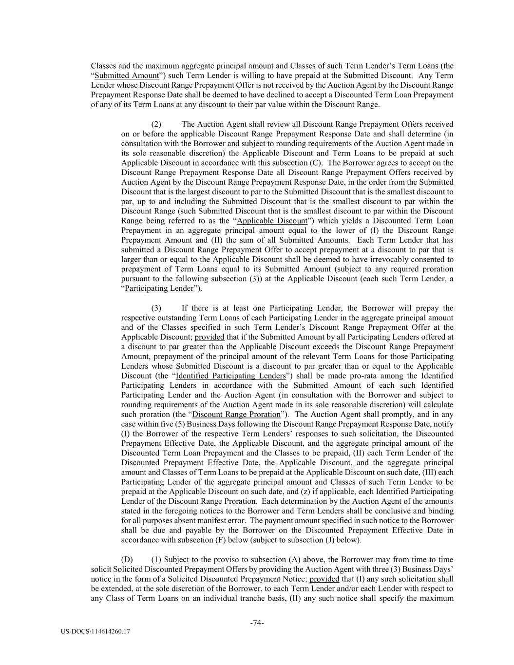 Classes and the maximum aggregate principal amount and Clas Submitted Amount Lender whose Discount Range Prepayment Offer is not received by the Auction Agent by the Discount Range Prepayment Response Date shall be deemed to have declined to accept a Discounted Term Loan Prepayment of any of its Term Loans at any discount to their par value within the Discount Range. (2) The Auction Agent shall review all Discount Range Prepayment Offers received on or before the applicable Discount Range Prepayment Response Date and shall determine (in consultation with the Borrower and subject to rounding requirements of the Auction Agent made in its sole reasonable discretion) the Applicable Discount and Term Loans to be prepaid at such Applicable Discount in accordance with this subsection (C). The Borrower agrees to accept on the Discount Range Prepayment Response Date all Discount Range Prepayment Offers received by Auction Agent by the Discount Range Prepayment Response Date, in the order from the Submitted Discount that is the largest discount to par to the Submitted Discount that is the smallest discount to par, up to and including the Submitted Discount that is the smallest discount to par within the Discount Range (such Submitted Discount that is the smallest discount to par within the Discount Applicable Discount Prepayment in an aggregate principal amount equal to the lower of (I) the Discount Range Prepayment Amount and (II) the sum of all Submitted Amounts. Each Term Lender that has submitted a Discount Range Prepayment Offer to accept prepayment at a discount to par that is larger than or equal to the Applicable Discount shall be deemed to have irrevocably consented to prepayment of Term Loans equal to its Submitted Amount (subject to any required proration pursuant to the following subsection (3)) at the Applicable Discount (each such Term Lender, a Participating Lender (3) If there is at least one Participating Lender, the Borrower will prepay the respective outstanding Term Loans of each Participating Lender in the aggregate principal amount Applicable Discount; provided that if the Submitted Amount by all Participating Lenders offered at a discount to par greater than the Applicable Discount exceeds the Discount Range Prepayment Amount, prepayment of the principal amount of the relevant Term Loans for those Participating Lenders whose Submitted Discount is a discount to par greater than or equal to the Applicable Identified Participating Lenders -rata among the Identified Participating Lenders in accordance with the Submitted Amount of each such Identified Participating Lender and the Auction Agent (in consultation with the Borrower and subject to rounding requirements of the Auction Agent made in its sole reasonable discretion) will calculate such proration (t Discount Range Proration case within five (5) Business Days following the Discount Range Prepayment Response Date, notify the Discounted Prepayment Effective Date, the Applicable Discount, and the aggregate principal amount of the Discounted Term Loan Prepayment and the Classes to be prepaid, (II) each Term Lender of the Discounted Prepayment Effective Date, the Applicable Discount, and the aggregate principal amount and Classes of Term Loans to be prepaid at the Applicable Discount on such date, (III) each Participating Lender of the aggregate principal amount and Classes of such Term Lender to be prepaid at the Applicable Discount on such date, and (z) if applicable, each Identified Participating Lender of the Discount Range Proration. Each determination by the Auction Agent of the amounts stated in the foregoing notices to the Borrower and Term Lenders shall be conclusive and binding for all purposes absent manifest error. The payment amount specified in such notice to the Borrower shall be due and payable by the Borrower on the Discounted Prepayment Effective Date in accordance with subsection (F) below (subject to subsection (J) below). (D) (1) Subject to the proviso to subsection (A) above, the Borrower may from time to time notice in the form of a Solicited Discounted Prepayment Notice; provided that (I) any such solicitation shall be extended, at the sole discretion of the Borrower, to each Term Lender and/or each Lender with respect to any Class of Term Loans on an individual tranche basis, (II) any such notice shall specify the maximum -74- US-DOCS\114614260.17