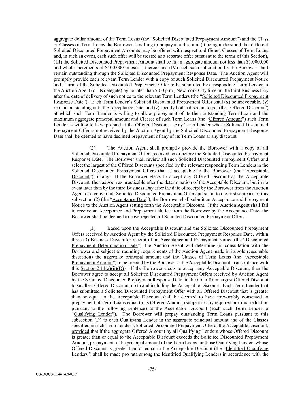 Solicited Discounted Prepayment Amount or Classes of Term Loans the Borrower is willing to prepay at a discount (it being understood that different Solicited Discounted Prepayment Amounts may be offered with respect to different Classes of Term Loans and, in such an event, each such offer will be treated as a separate offer pursuant to the terms of this Section), (III) the Solicited Discounted Prepayment Amount shall be in an aggregate amount not less than $1,000,000 and whole increments of $500,000 in excess thereof and (IV) each such solicitation by the Borrower shall remain outstanding through the Solicited Discounted Prepayment Response Date. The Auction Agent will promptly provide each relevant Term Lender with a copy of such Solicited Discounted Prepayment Notice and a form of the Solicited Discounted Prepayment Offer to be submitted by a responding Term Lender to the Auction Agent (or its delegate) by no later than 5:00 p.m., New York City time on the third Business Day Solicited Discounted Prepayment Response Date cable, (y) Offered Discount at which such Term Lender is willing to allow prepayment of its then outstanding Term Loan and the maximum aggregate principal amount a Offered Amount Lender is willing to have prepaid at the Offered Discount. Any Term Lender whose Solicited Discounted Prepayment Offer is not received by the Auction Agent by the Solicited Discounted Prepayment Response Date shall be deemed to have declined prepayment of any of its Term Loans at any discount. (2) The Auction Agent shall promptly provide the Borrower with a copy of all Solicited Discounted Prepayment Offers received on or before the Solicited Discounted Prepayment Response Date. The Borrower shall review all such Solicited Discounted Prepayment Offers and select the largest of the Offered Discounts specified by the relevant responding Term Lenders in the Solicited Discounted Prepayment Offers Acceptable Discount Discount, then as soon as practicable after the determination of the Acceptable Discount, but in no event later than by the third Business Day after the date of receipt by the Borrower from the Auction Agent of a copy of all Solicited Discounted Prepayment Offers pursuant to the first sentence of this Acceptance Date t an Acceptance and Prepayment Notice to the Auction Agent setting forth the Acceptable Discount. If the Auction Agent shall fail to receive an Acceptance and Prepayment Notice from the Borrower by the Acceptance Date, the Borrower shall be deemed to have rejected all Solicited Discounted Prepayment Offers. (3) Based upon the Acceptable Discount and the Solicited Discounted Prepayment Offers received by Auction Agent by the Solicited Discounted Prepayment Response Date, within three (3) Business Days after rec Discounted Prepayment Determination Date Borrower and subject to rounding requirements of the Auction Agent made in its sole reasonable discreti Acceptable Prepayment Amount this Section 2.11(a)(ii)(D)). If the Borrower elects to accept any Acceptable Discount, then the Borrower agree to accept all Solicited Discounted Prepayment Offers received by Auction Agent by the Solicited Discounted Prepayment Response Date, in the order from largest Offered Discount to smallest Offered Discount, up to and including the Acceptable Discount. Each Term Lender that has submitted a Solicited Discounted Prepayment Offer with an Offered Discount that is greater than or equal to the Acceptable Discount shall be deemed to have irrevocably consented to prepayment of Term Loans equal to its Offered Amount (subject to any required pro-rata reduction pursuant to the following sentence) at the Acceptable Discount (each such Term Lender, a Qualifying Lender subsection (D) to each Qualifying Lender in the aggregate principal amount and of the Classes Prepayment Offer at the Acceptable Discount; provided that if the aggregate Offered Amount by all Qualifying Lenders whose Offered Discount is greater than or equal to the Acceptable Discount exceeds the Solicited Discounted Prepayment Amount, prepayment of the principal amount of the Term Loans for those Qualifying Lenders whose Identified Qualifying Lenders nce with the -75- US-DOCS\114614260.17