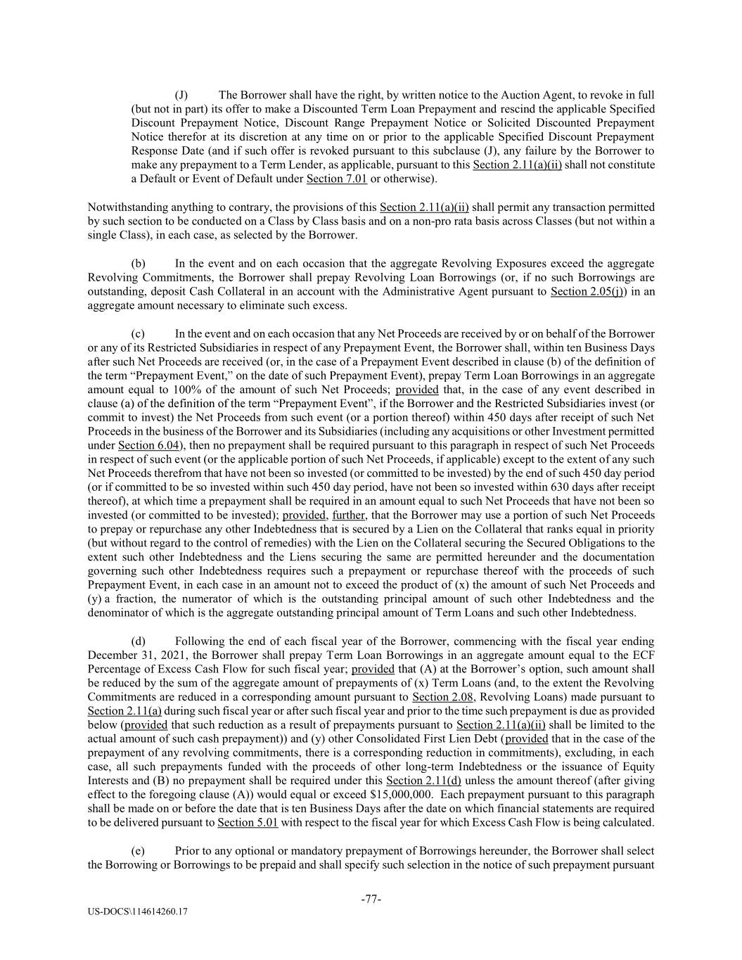 (J) The Borrower shall have the right, by written notice to the Auction Agent, to revoke in full (but not in part) its offer to make a Discounted Term Loan Prepayment and rescind the applicable Specified Discount Prepayment Notice, Discount Range Prepayment Notice or Solicited Discounted Prepayment Notice therefor at its discretion at any time on or prior to the applicable Specified Discount Prepayment Response Date (and if such offer is revoked pursuant to this subclause (J), any failure by the Borrower to make any prepayment to a Term Lender, as applicable, pursuant to this Section 2.11(a)(ii) shall not constitute a Default or Event of Default under Section 7.01 or otherwise). Notwithstanding anything to contrary, the provisions of this Section 2.11(a)(ii) shall permit any transaction permitted by such section to be conducted on a Class by Class basis and on a non-pro rata basis across Classes (but not within a single Class), in each case, as selected by the Borrower. (b) In the event and on each occasion that the aggregate Revolving Exposures exceed the aggregate Revolving Commitments, the Borrower shall prepay Revolving Loan Borrowings (or, if no such Borrowings are outstanding, deposit Cash Collateral in an account with the Administrative Agent pursuant to Section 2.05(j)) in an aggregate amount necessary to eliminate such excess. (c) In the event and on each occasion that any Net Proceeds are received by or on behalf of the Borrower or any of its Restricted Subsidiaries in respect of any Prepayment Event, the Borrower shall, within ten Business Days after such Net Proceeds are received (or, in the case of a Prepayment Event described in clause (b) of the definition of owings in an aggregate amount equal to 100% of the amount of such Net Proceeds; provided that, in the case of any event described in clause commit to invest) the Net Proceeds from such event (or a portion thereof) within 450 days after receipt of such Net Proceeds in the business of the Borrower and its Subsidiaries (including any acquisitions or other Investment permitted under Section 6.04), then no prepayment shall be required pursuant to this paragraph in respect of such Net Proceeds in respect of such event (or the applicable portion of such Net Proceeds, if applicable) except to the extent of any such Net Proceeds therefrom that have not been so invested (or committed to be invested) by the end of such 450 day period (or if committed to be so invested within such 450 day period, have not been so invested within 630 days after receipt thereof), at which time a prepayment shall be required in an amount equal to such Net Proceeds that have not been so invested (or committed to be invested); provided, further, that the Borrower may use a portion of such Net Proceeds to prepay or repurchase any other Indebtedness that is secured by a Lien on the Collateral that ranks equal in priority (but without regard to the control of remedies) with the Lien on the Collateral securing the Secured Obligations to the extent such other Indebtedness and the Liens securing the same are permitted hereunder and the documentation governing such other Indebtedness requires such a prepayment or repurchase thereof with the proceeds of such Prepayment Event, in each case in an amount not to exceed the product of (x) the amount of such Net Proceeds and (y) a fraction, the numerator of which is the outstanding principal amount of such other Indebtedness and the denominator of which is the aggregate outstanding principal amount of Term Loans and such other Indebtedness. (d) Following the end of each fiscal year of the Borrower, commencing with the fiscal year ending December 31, 2021, the Borrower shall prepay Term Loan Borrowings in an aggregate amount equal to the ECF Percentage of Excess Cash Flow for such fiscal year; provided be reduced by the sum of the aggregate amount of prepayments of (x) Term Loans (and, to the extent the Revolving Commitments are reduced in a corresponding amount pursuant to Section 2.08, Revolving Loans) made pursuant to Section 2.11(a) during such fiscal year or after such fiscal year and prior to the time such prepayment is due as provided below (provided that such reduction as a result of prepayments pursuant to Section 2.11(a)(ii) shall be limited to the actual amount of such cash prepayment)) and (y) other Consolidated First Lien Debt (provided that in the case of the prepayment of any revolving commitments, there is a corresponding reduction in commitments), excluding, in each case, all such prepayments funded with the proceeds of other long-term Indebtedness or the issuance of Equity Interests and (B) no prepayment shall be required under this Section 2.11(d) unless the amount thereof (after giving effect to the foregoing clause (A)) would equal or exceed $15,000,000. Each prepayment pursuant to this paragraph shall be made on or before the date that is ten Business Days after the date on which financial statements are required to be delivered pursuant to Section 5.01 with respect to the fiscal year for which Excess Cash Flow is being calculated. (e) Prior to any optional or mandatory prepayment of Borrowings hereunder, the Borrower shall select the Borrowing or Borrowings to be prepaid and shall specify such selection in the notice of such prepayment pursuant -77- US-DOCS\114614260.17