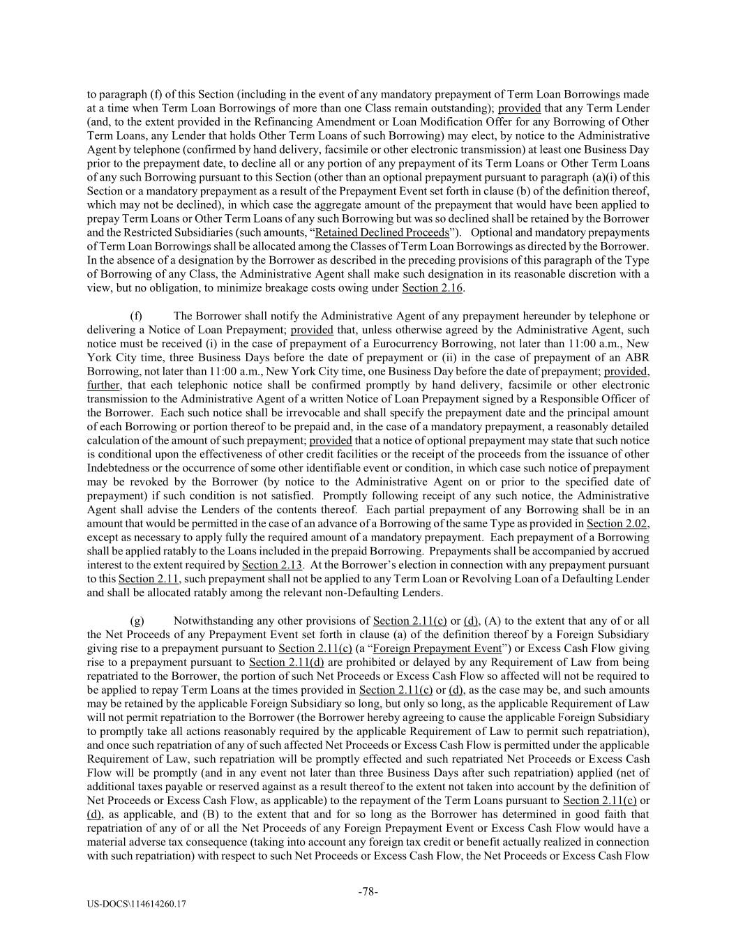 to paragraph (f) of this Section (including in the event of any mandatory prepayment of Term Loan Borrowings made at a time when Term Loan Borrowings of more than one Class remain outstanding); provided that any Term Lender (and, to the extent provided in the Refinancing Amendment or Loan Modification Offer for any Borrowing of Other Term Loans, any Lender that holds Other Term Loans of such Borrowing) may elect, by notice to the Administrative Agent by telephone (confirmed by hand delivery, facsimile or other electronic transmission) at least one Business Day prior to the prepayment date, to decline all or any portion of any prepayment of its Term Loans or Other Term Loans of any such Borrowing pursuant to this Section (other than an optional prepayment pursuant to paragraph (a)(i) of this Section or a mandatory prepayment as a result of the Prepayment Event set forth in clause (b) of the definition thereof, which may not be declined), in which case the aggregate amount of the prepayment that would have been applied to prepay Term Loans or Other Term Loans of any such Borrowing but was so declined shall be retained by the Borrower and the Restricted Subsidia Retained Declined Proceeds of Term Loan Borrowings shall be allocated among the Classes of Term Loan Borrowings as directed by the Borrower. In the absence of a designation by the Borrower as described in the preceding provisions of this paragraph of the Type of Borrowing of any Class, the Administrative Agent shall make such designation in its reasonable discretion with a view, but no obligation, to minimize breakage costs owing under Section 2.16. (f) The Borrower shall notify the Administrative Agent of any prepayment hereunder by telephone or delivering a Notice of Loan Prepayment; provided that, unless otherwise agreed by the Administrative Agent, such notice must be received (i) in the case of prepayment of a Eurocurrency Borrowing, not later than 11:00 a.m., New York City time, three Business Days before the date of prepayment or (ii) in the case of prepayment of an ABR Borrowing, not later than 11:00 a.m., New York City time, one Business Day before the date of prepayment; provided, further, that each telephonic notice shall be confirmed promptly by hand delivery, facsimile or other electronic transmission to the Administrative Agent of a written Notice of Loan Prepayment signed by a Responsible Officer of the Borrower. Each such notice shall be irrevocable and shall specify the prepayment date and the principal amount of each Borrowing or portion thereof to be prepaid and, in the case of a mandatory prepayment, a reasonably detailed calculation of the amount of such prepayment; provided that a notice of optional prepayment may state that such notice is conditional upon the effectiveness of other credit facilities or the receipt of the proceeds from the issuance of other Indebtedness or the occurrence of some other identifiable event or condition, in which case such notice of prepayment may be revoked by the Borrower (by notice to the Administrative Agent on or prior to the specified date of prepayment) if such condition is not satisfied. Promptly following receipt of any such notice, the Administrative Agent shall advise the Lenders of the contents thereof. Each partial prepayment of any Borrowing shall be in an amount that would be permitted in the case of an advance of a Borrowing of the same Type as provided in Section 2.02, except as necessary to apply fully the required amount of a mandatory prepayment. Each prepayment of a Borrowing shall be applied ratably to the Loans included in the prepaid Borrowing. Prepayments shall be accompanied by accrued interest to the extent required by Section 2.13 to this Section 2.11, such prepayment shall not be applied to any Term Loan or Revolving Loan of a Defaulting Lender and shall be allocated ratably among the relevant non-Defaulting Lenders. (g) Notwithstanding any other provisions of Section 2.11(c) or (d), (A) to the extent that any of or all the Net Proceeds of any Prepayment Event set forth in clause (a) of the definition thereof by a Foreign Subsidiary giving rise to a prepayment pursuant to Section 2.11(c) Foreign Prepayment Event rise to a prepayment pursuant to Section 2.11(d) are prohibited or delayed by any Requirement of Law from being repatriated to the Borrower, the portion of such Net Proceeds or Excess Cash Flow so affected will not be required to be applied to repay Term Loans at the times provided in Section 2.11(c) or (d), as the case may be, and such amounts may be retained by the applicable Foreign Subsidiary so long, but only so long, as the applicable Requirement of Law will not permit repatriation to the Borrower (the Borrower hereby agreeing to cause the applicable Foreign Subsidiary to promptly take all actions reasonably required by the applicable Requirement of Law to permit such repatriation), and once such repatriation of any of such affected Net Proceeds or Excess Cash Flow is permitted under the applicable Requirement of Law, such repatriation will be promptly effected and such repatriated Net Proceeds or Excess Cash Flow will be promptly (and in any event not later than three Business Days after such repatriation) applied (net of additional taxes payable or reserved against as a result thereof to the extent not taken into account by the definition of Net Proceeds or Excess Cash Flow, as applicable) to the repayment of the Term Loans pursuant to Section 2.11(c) or (d), as applicable, and (B) to the extent that and for so long as the Borrower has determined in good faith that repatriation of any of or all the Net Proceeds of any Foreign Prepayment Event or Excess Cash Flow would have a material adverse tax consequence (taking into account any foreign tax credit or benefit actually realized in connection with such repatriation) with respect to such Net Proceeds or Excess Cash Flow, the Net Proceeds or Excess Cash Flow -78- US-DOCS\114614260.17