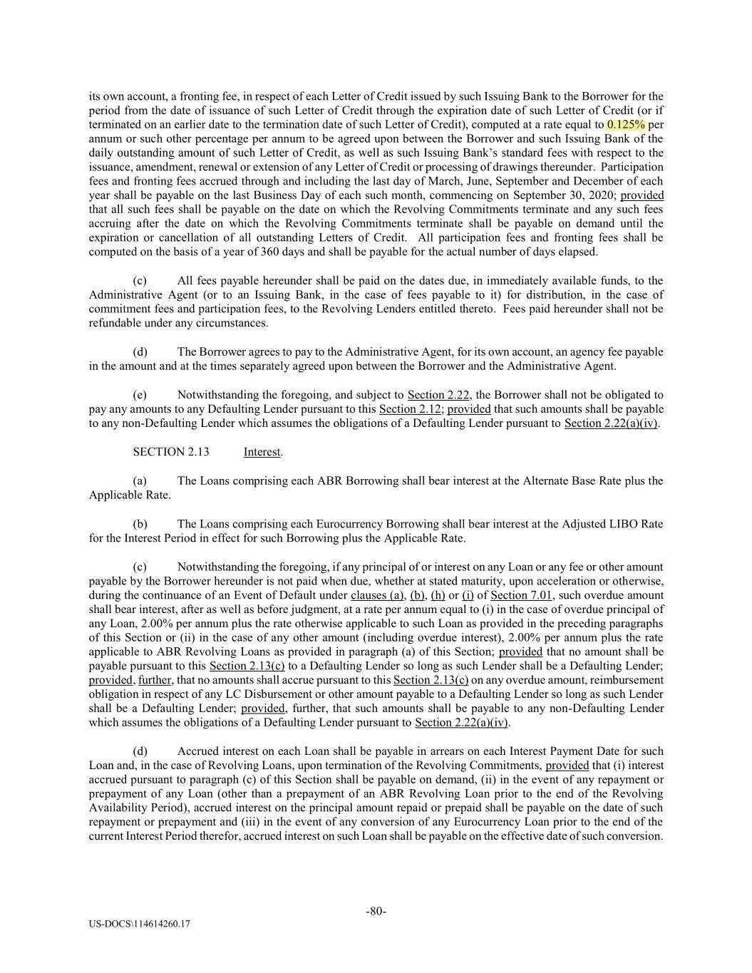its own account, a fronting fee, in respect of each Letter of Credit issued by such Issuing Bank to the Borrower for the period from the date of issuance of such Letter of Credit through the expiration date of such Letter of Credit (or if terminated on an earlier date to the termination date of such Letterter of Credit), computed at a rate equal to 0.125% per annum or such other percentage per annum to be agreed upon between the Borrower and such Issuing Bank of the ees with respect to the issuance, amendment, renewal or extension of any Letter of Credit or processing of drawings thereunder. Participation fees and fronting fees accrued through and including the last day of March, June, September and December of each year shall be payable on the last Business Day of each such month, commencing on September 30, 2020; provided that all such fees shall be payable on the date on which the Revolving Commitments terminate and any such fees accruing after the date on which the Revolving Commitments terminate shall be payable on demand until the expiration or cancellation of all outstanding Letters of Credit. All participation fees and fronting fees shall be computed on the basis of a year of 360 days and shall be payable for the actual number of days elapsed. (c) All fees payable hereunder shall be paid on the dates due, in immediately available funds, to the Administrative Agent (or to an Issuing Bank, in the case of fees payable to it) for distribution, in the case of commitment fees and participation fees, to the Revolving Lenders entitled thereto. Fees paid hereunder shall not be refundable under any circumstances. (d) The Borrower agrees to pay to the Administrative Agent, for its own account, an agency fee payable in the amount and at the times separately agreed upon between the Borrower and the Administrative Agent. (e) Notwithstanding the foregoing, and subject to Section 2.22, the Borrower shall not be obligated to pay any amounts to any Defaulting Lender pursuant to this Section 2.12; provided that such amounts shall be payable to any non-Defaulting Lender which assumes the obligations of a Defaulting Lender pursuant to Section 2.22(a)(iv). SECTION 2.13 Interest. (a) The Loans comprising each ABR Borrowing shall bear interest at the Alternate Base Rate plus the Applicable Rate. (b) The Loans comprising each Eurocurrency Borrowing shall bear interest at the Adjusted LIBO Rate for the Interest Period in effect for such Borrowing plus the Applicable Rate. (c) Notwithstanding the foregoing, if any principal of or interest on any Loan or any fee or other amount payable by the Borrower hereunder is not paid when due, whether at stated maturity, upon acceleration or otherwise, during the continuance of an Event of Default under clauses (a), (b), (h) or (i) of Section 7.01, such overdue amount shall bear interest, after as well as before judgment, at a rate per annum equal to (i) in the case of overdue principal of any Loan, 2.00% per annum plus the rate otherwise applicable to such Loan as provided in the preceding paragraphs of this Section or (ii) in the case of any other amount (including overdue interest), 2.00% per annum plus the rate applicable to ABR Revolving Loans as provided in paragraph (a) of this Section; provided that no amount shall be payable pursuant to this Section 2.13(c) to a Defaulting Lender so long as such Lender shall be a Defaulting Lender; provided, further, that no amounts shall accrue pursuant to this Section 2.13(c) on any overdue amount, reimbursement obligation in respect of any LC Disbursement or other amount payable to a Defaulting Lender so long as such Lender shall be a Defaulting Lender; provided, further, that such amounts shall be payable to any non-Defaulting Lender which assumes the obligations of a Defaulting Lender pursuant to Section 2.22(a)(iv). (d) Accrued interest on each Loan shall be payable in arrears on each Interest Payment Date for such Loan and, in the case of Revolving Loans, upon termination of the Revolving Commitments, provided that (i) interest accrued pursuant to paragraph (c) of this Section shall be payable on demand, (ii) in the event of any repayment or prepayment of any Loan (other than a prepayment of an ABR Revolving Loan prior to the end of the Revolving Availability Period), accrued interest on the principal amount repaid or prepaid shall be payable on the date of such repayment or prepayment and (iii) in the event of any conversion of any Eurocurrency Loan prior to the end of the current Interest Period therefor, accrued interest on such Loan shall be payable on the effective date of such conversion. -80- US-DOCS\114614260.17