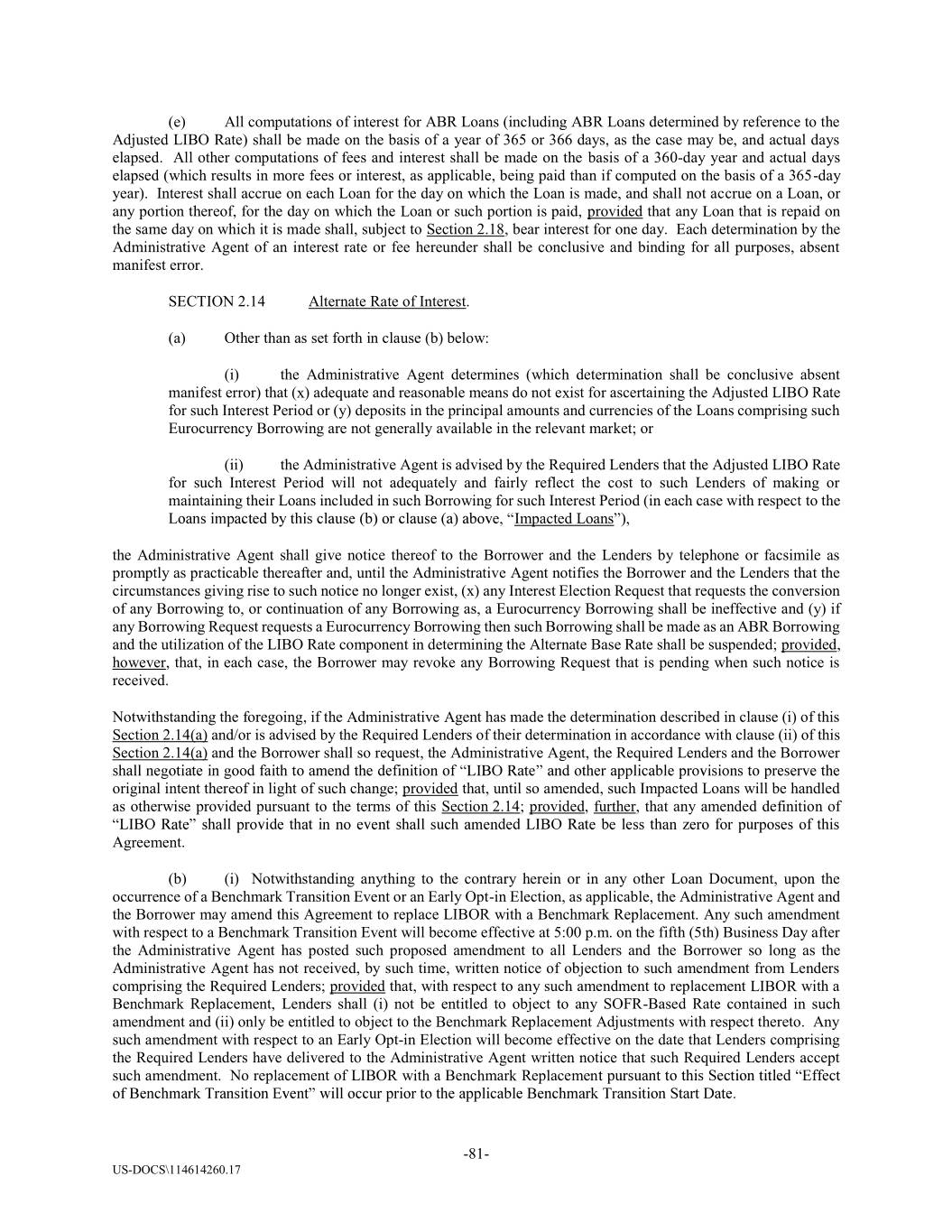 (e) All computations of interest for ABR Loans (including ABR Loans determined by reference to the Adjusted LIBO Rate) shall be made on the basis of a year of 365 or 366 days, as the case may be, and actual days elapsed. All other computations of fees and interest shall be made on the basis of a 360-day year and actual days elapsed (which results in more fees or interest, as applicable, being paid than if computed on the basis of a 365-day year). Interest shall accrue on each Loan for the day on which the Loan is made, and shall not accrue on a Loan, or any portion thereof, for the day on which the Loan or such portion is paid, provided that any Loan that is repaid on the same day on which it is made shall, subject to Section 2.18, bear interest for one day. Each determination by the Administrative Agent of an interest rate or fee hereunder shall be conclusive and binding for all purposes, absent manifest error. SECTION 2.14 Alternate Rate of Interest. (a) Other than as set forth in clause (b) below: (i) the Administrative Agent determines (which determination shall be conclusive absent manifest error) that (x) adequate and reasonable means do not exist for ascertaining the Adjusted LIBO Rate for such Interest Period or (y) deposits in the principal amounts and currencies of the Loans comprising such Eurocurrency Borrowing are not generally available in the relevant market; or (ii) the Administrative Agent is advised by the Required Lenders that the Adjusted LIBO Rate for such Interest Period will not adequately and fairly reflect the cost to such Lenders of making or maintaining their Loans included in such Borrowing for such Interest Period (in each case with respect to the Impacted Loans the Administrative Agent shall give notice thereof to the Borrower and the Lenders by telephone or facsimile as promptly as practicable thereafter and, until the Administrative Agent notifies the Borrower and the Lenders that the circumstances giving rise to such notice no longer exist, (x) any Interest Election Request that requests the conversion of any Borrowing to, or continuation of any Borrowing as, a Eurocurrency Borrowing shall be ineffective and (y) if any Borrowing Request requests a Eurocurrency Borrowing then such Borrowing shall be made as an ABR Borrowing and the utilization of the LIBO Rate component in determining the Alternate Base Rate shall be suspended; provided, however, that, in each case, the Borrower may revoke any Borrowing Request that is pending when such notice is received. Notwithstanding the foregoing, if the Administrative Agent has made the determination described in clause (i) of this Section 2.14(a) and/or is advised by the Required Lenders of their determination in accordance with clause (ii) of this Section 2.14(a) and the Borrower shall so request, the Administrative Agent, the Required Lenders and the Borrower original intent thereof in light of such change; provided that, until so amended, such Impacted Loans will be handled as otherwise provided pursuant to the terms of this Section 2.14; provided, further, that any amended definition of Agreement. (b) (i) Notwithstanding anything to the contrary herein or in any other Loan Document, upon the occurrence of a Benchmark Transition Event or an Early Opt-in Election, as applicable, the Administrative Agent and the Borrower may amend this Agreement to replace LIBOR with a Benchmark Replacement. Any such amendment with respect to a Benchmark Transition Event will become effective at 5:00 p.m. on the fifth (5th) Business Day after the Administrative Agent has posted such proposed amendment to all Lenders and the Borrower so long as the Administrative Agent has not received, by such time, written notice of objection to such amendment from Lenders comprising the Required Lenders; provided that, with respect to any such amendment to replacement LIBOR with a Benchmark Replacement, Lenders shall (i) not be entitled to object to any SOFR-Based Rate contained in such amendment and (ii) only be entitled to object to the Benchmark Replacement Adjustments with respect thereto. Any such amendment with respect to an Early Opt-in Election will become effective on the date that Lenders comprising the Required Lenders have delivered to the Administrative Agent written notice that such Required Lenders accept such amendment. No replacement of LIBOR with a Benchmark Replacemen -81- US-DOCS\114614260.17