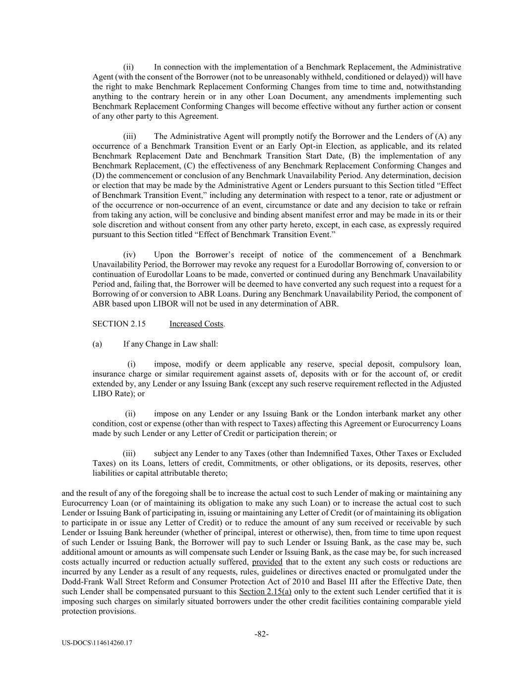 (ii) In connection with the implementation of a Benchmark Replacement, the Administrative Agent (with the consent of the Borrower (not to be unreasonably withheld, conditioned or delayed)) will have the right to make Benchmark Replacement Conforming Changes from time to time and, notwithstanding anything to the contrary herein or in any other Loan Document, any amendments implementing such Benchmark Replacement Conforming Changes will become effective without any further action or consent of any other party to this Agreement. (iii) The Administrative Agent will promptly notify the Borrower and the Lenders of (A) any occurrence of a Benchmark Transition Event or an Early Opt-in Election, as applicable, and its related Benchmark Replacement Date and Benchmark Transition Start Date, (B) the implementation of any Benchmark Replacement, (C) the effectiveness of any Benchmark Replacement Conforming Changes and (D) the commencement or conclusion of any Benchmark Unavailability Period. Any determination, decision or election that may be made by the Administrative Agent or Lenders pursuant to this Section title of the occurrence or non-occurrence of an event, circumstance or date and any decision to take or refrain from taking any action, will be conclusive and binding absent manifest error and may be made in its or their sole discretion and without consent from any other party hereto, except, in each case, as expressly required (iv) Unavailability Period, the Borrower may revoke any request for a Eurodollar Borrowing of, conversion to or continuation of Eurodollar Loans to be made, converted or continued during any Benchmark Unavailability Period and, failing that, the Borrower will be deemed to have converted any such request into a request for a Borrowing of or conversion to ABR Loans. During any Benchmark Unavailability Period, the component of ABR based upon LIBOR will not be used in any determination of ABR. SECTION 2.15 Increased Costs. (a) If any Change in Law shall: (i) impose, modify or deem applicable any reserve, special deposit, compulsory loan, insurance charge or similar requirement against assets of, deposits with or for the account of, or credit extended by, any Lender or any Issuing Bank (except any such reserve requirement reflected in the Adjusted LIBO Rate); or (ii) impose on any Lender or any Issuing Bank or the London interbank market any other condition, cost or expense (other than with respect to Taxes) affecting this Agreement or Eurocurrency Loans made by such Lender or any Letter of Credit or participation therein; or (iii) subject any Lender to any Taxes (other than Indemnified Taxes, Other Taxes or Excluded Taxes) on its Loans, letters of credit, Commitments, or other obligations, or its deposits, reserves, other liabilities or capital attributable thereto; and the result of any of the foregoing shall be to increase the actual cost to such Lender of making or maintaining any Eurocurrency Loan (or of maintaining its obligation to make any such Loan) or to increase the actual cost to such Lender or Issuing Bank of participating in, issuing or maintaining any Letter of Credit (or of maintaining its obligation to participate in or issue any Letter of Credit) or to reduce the amount of any sum received or receivable by such Lender or Issuing Bank hereunder (whether of principal, interest or otherwise), then, from time to time upon request of such Lender or Issuing Bank, the Borrower will pay to such Lender or Issuing Bank, as the case may be, such additional amount or amounts as will compensate such Lender or Issuing Bank, as the case may be, for such increased costs actually incurred or reduction actually suffered, provided that to the extent any such costs or reductions are incurred by any Lender as a result of any requests, rules, guidelines or directives enacted or promulgated under the Dodd-Frank Wall Street Reform and Consumer Protection Act of 2010 and Basel III after the Effective Date, then such Lender shall be compensated pursuant to this Section 2.15(a) only to the extent such Lender certified that it is imposing such charges on similarly situated borrowers under the other credit facilities containing comparable yield protection provisions. -82- US-DOCS\114614260.17