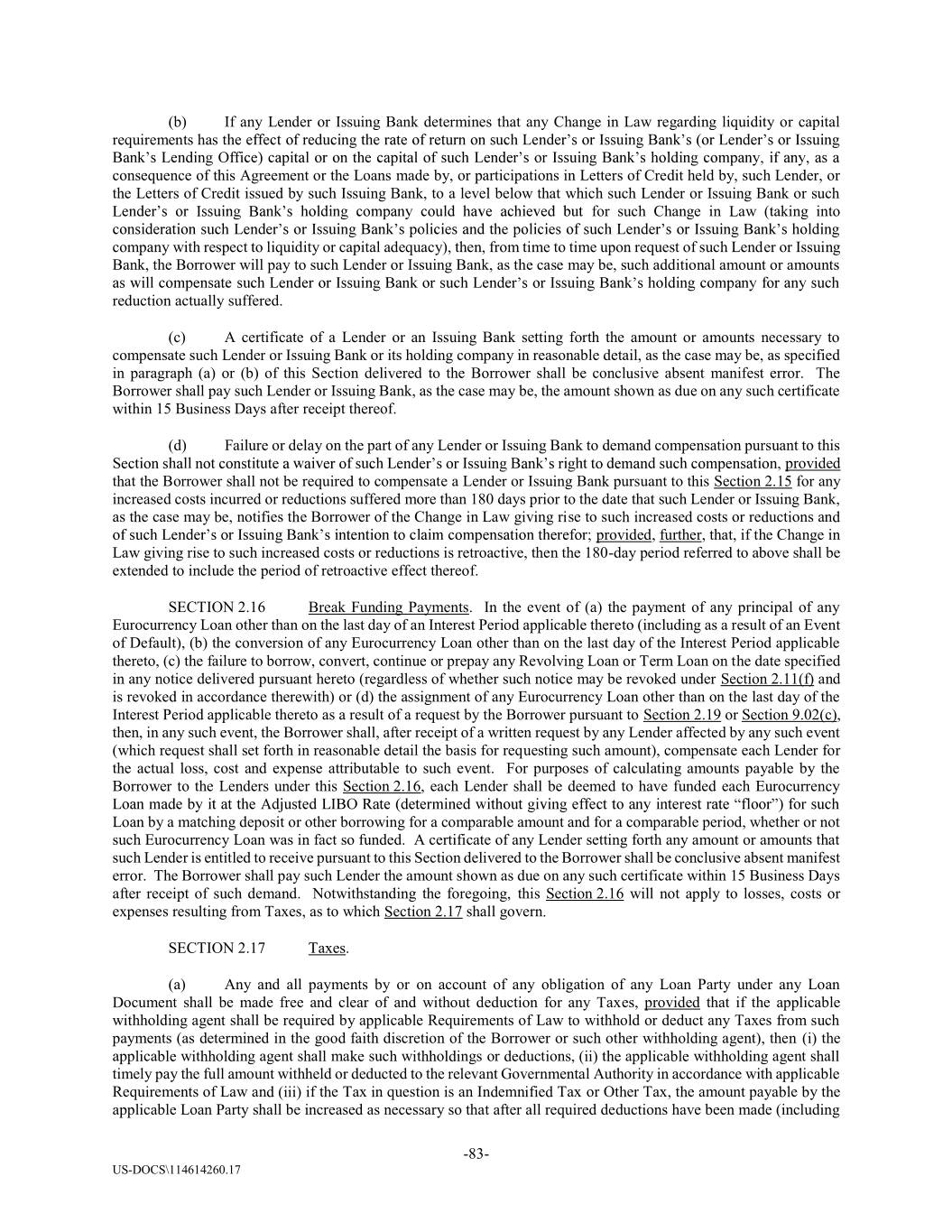 (b) If any Lender or Issuing Bank determines that any Change in Law regarding liquidity or capital requirements has t consequence of this Agreement or the Loans made by, or participations in Letters of Credit held by, such Lender, or the Letters of Credit issued by such Issuing Bank, to a level below that which such Lender or Issuing Bank or such for such Change in Law (taking into company with respect to liquidity or capital adequacy), then, from time to time upon request of such Lender or Issuing Bank, the Borrower will pay to such Lender or Issuing Bank, as the case may be, such additional amount or amounts reduction actually suffered. (c) A certificate of a Lender or an Issuing Bank setting forth the amount or amounts necessary to compensate such Lender or Issuing Bank or its holding company in reasonable detail, as the case may be, as specified in paragraph (a) or (b) of this Section delivered to the Borrower shall be conclusive absent manifest error. The Borrower shall pay such Lender or Issuing Bank, as the case may be, the amount shown as due on any such certificate within 15 Business Days after receipt thereof. (d) Failure or delay on the part of any Lender or Issuing Bank to demand compensation pursuant to this provided that the Borrower shall not be required to compensate a Lender or Issuing Bank pursuant to this Section 2.15 for any increased costs incurred or reductions suffered more than 180 days prior to the date that such Lender or Issuing Bank, as the case may be, notifies the Borrower of the Change in Law giving rise to such increased costs or reductions and provided, further, that, if the Change in Law giving rise to such increased costs or reductions is retroactive, then the 180-day period referred to above shall be extended to include the period of retroactive effect thereof. SECTION 2.16 Break Funding Payments. In the event of (a) the payment of any principal of any Eurocurrency Loan other than on the last day of an Interest Period applicable thereto (including as a result of an Event of Default), (b) the conversion of any Eurocurrency Loan other than on the last day of the Interest Period applicable thereto, (c) the failure to borrow, convert, continue or prepay any Revolving Loan or Term Loan on the date specified in any notice delivered pursuant hereto (regardless of whether such notice may be revoked under Section 2.11(f) and is revoked in accordance therewith) or (d) the assignment of any Eurocurrency Loan other than on the last day of the Interest Period applicable thereto as a result of a request by the Borrower pursuant to Section 2.19 or Section 9.02(c), then, in any such event, the Borrower shall, after receipt of a written request by any Lender affected by any such event (which request shall set forth in reasonable detail the basis for requesting such amount), compensate each Lender for the actual loss, cost and expense attributable to such event. For purposes of calculating amounts payable by the Borrower to the Lenders under this Section 2.16, each Lender shall be deemed to have funded each Eurocurrency Loan by a matching deposit or other borrowing for a comparable amount and for a comparable period, whether or not such Eurocurrency Loan was in fact so funded. A certificate of any Lender setting forth any amount or amounts that such Lender is entitled to receive pursuant to this Section delivered to the Borrower shall be conclusive absent manifest error. The Borrower shall pay such Lender the amount shown as due on any such certificate within 15 Business Days after receipt of such demand. Notwithstanding the foregoing, this Section 2.16 will not apply to losses, costs or expenses resulting from Taxes, as to which Section 2.17 shall govern. SECTION 2.17 Taxes. (a) Any and all payments by or on account of any obligation of any Loan Party under any Loan Document shall be made free and clear of and without deduction for any Taxes, provided that if the applicable withholding agent shall be required by applicable Requirements of Law to withhold or deduct any Taxes from such payments (as determined in the good faith discretion of the Borrower or such other withholding agent), then (i) the applicable withholding agent shall make such withholdings or deductions, (ii) the applicable withholding agent shall timely pay the full amount withheld or deducted to the relevant Governmental Authority in accordance with applicable Requirements of Law and (iii) if the Tax in question is an Indemnified Tax or Other Tax, the amount payable by the applicable Loan Party shall be increased as necessary so that after all required deductions have been made (including -83- US-DOCS\114614260.17