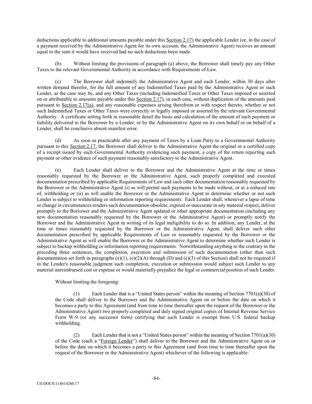 deductions applicable to additional amounts payable under this Section 2.17) the applicable Lender (or, in the case of a payment received by the Administrative Agent for its own account, the Administrative Agent) receives an amount equal to the sum it would have received had no such deductions been made. (b) Without limiting the provisions of paragraph (a) above, the Borrower shall timely pay any Other Taxes to the relevant Governmental Authority in accordance with Requirements of Law. (c) The Borrower shall indemnify the Administrative Agent and each Lender, within 30 days after written demand therefor, for the full amount of any Indemnified Taxes paid by the Administrative Agent or such Lender, as the case may be, and any Other Taxes (including Indemnified Taxes or Other Taxes imposed or asserted on or attributable to amounts payable under this Section 2.17), in each case, without duplication of the amounts paid pursuant to Section 2.17(a), and any reasonable expenses arising therefrom or with respect thereto, whether or not such Indemnified Taxes or Other Taxes were correctly or legally imposed or asserted by the relevant Governmental Authority. A certificate setting forth in reasonable detail the basis and calculation of the amount of such payment or liability delivered to the Borrower by a Lender, or by the Administrative Agent on its own behalf or on behalf of a Lender, shall be conclusive absent manifest error. (d) As soon as practicable after any payment of Taxes by a Loan Party to a Governmental Authority pursuant to this Section 2.17, the Borrower shall deliver to the Administrative Agent the original or a certified copy of a receipt issued by such Governmental Authority evidencing such payment, a copy of the return reporting such payment or other evidence of such payment reasonably satisfactory to the Administrative Agent. (e) Each Lender shall deliver to the Borrower and the Administrative Agent at the time or times reasonably requested by the Borrower or the Administrative Agent, such properly completed and executed documentation prescribed by applicable Requirements of Law and such other documentation reasonably requested by the Borrower or the Administrative Agent (i) as will permit such payments to be made without, or at a reduced rate of, withholding or (ii) as will enable the Borrower or the Administrative Agent to determine whether or not such Lender is subject to withholding or information reporting requirements. Each Lender shall, whenever a lapse of time or change in circumstances renders such documentation obsolete, expired or inaccurate in any material respect, deliver promptly to the Borrower and the Administrative Agent updated or other appropriate documentation (including any new documentation reasonably requested by the Borrower or the Administrative Agent) or promptly notify the Borrower and the Administrative Agent in writing of its legal ineligibility to do so. In addition, any Lender, at the time or times reasonably requested by the Borrower or the Administrative Agent, shall deliver such other documentation prescribed by applicable Requirements of Law or reasonably requested by the Borrower or the Administrative Agent as will enable the Borrower or the Administrative Agent to determine whether such Lender is subject to backup withholding or information reporting requirements. Notwithstanding anything to the contrary in the preceding three sentences, the completion, execution and submission of such documentation (other than such documentation set forth in paragraphs (e)(1), (e)(2)(A) through (D) and (e)(3) of this Section) shall not be required if in the Lender's reasonable judgment such completion, execution or submission would subject such Lender to any material unreimbursed cost or expense or would materially prejudice the legal or commercial position of such Lender. Without limiting the foregoing: (1) the Code shall deliver to the Borrower and the Administrative Agent on or before the date on which it becomes a party to this Agreement (and from time to time thereafter upon the request of the Borrower or the Administrative Agent) two properly completed and duly signed original copies of Internal Revenue Service Form W-9 (or any successor form) certifying that such Lender is exempt from U.S. federal backup withholding. (2) Foreign Lender nd the Administrative Agent on or before the date on which it becomes a party to this Agreement (and from time to time thereafter upon the request of the Borrower or the Administrative Agent) whichever of the following is applicable: -84- US-DOCS\114614260.17