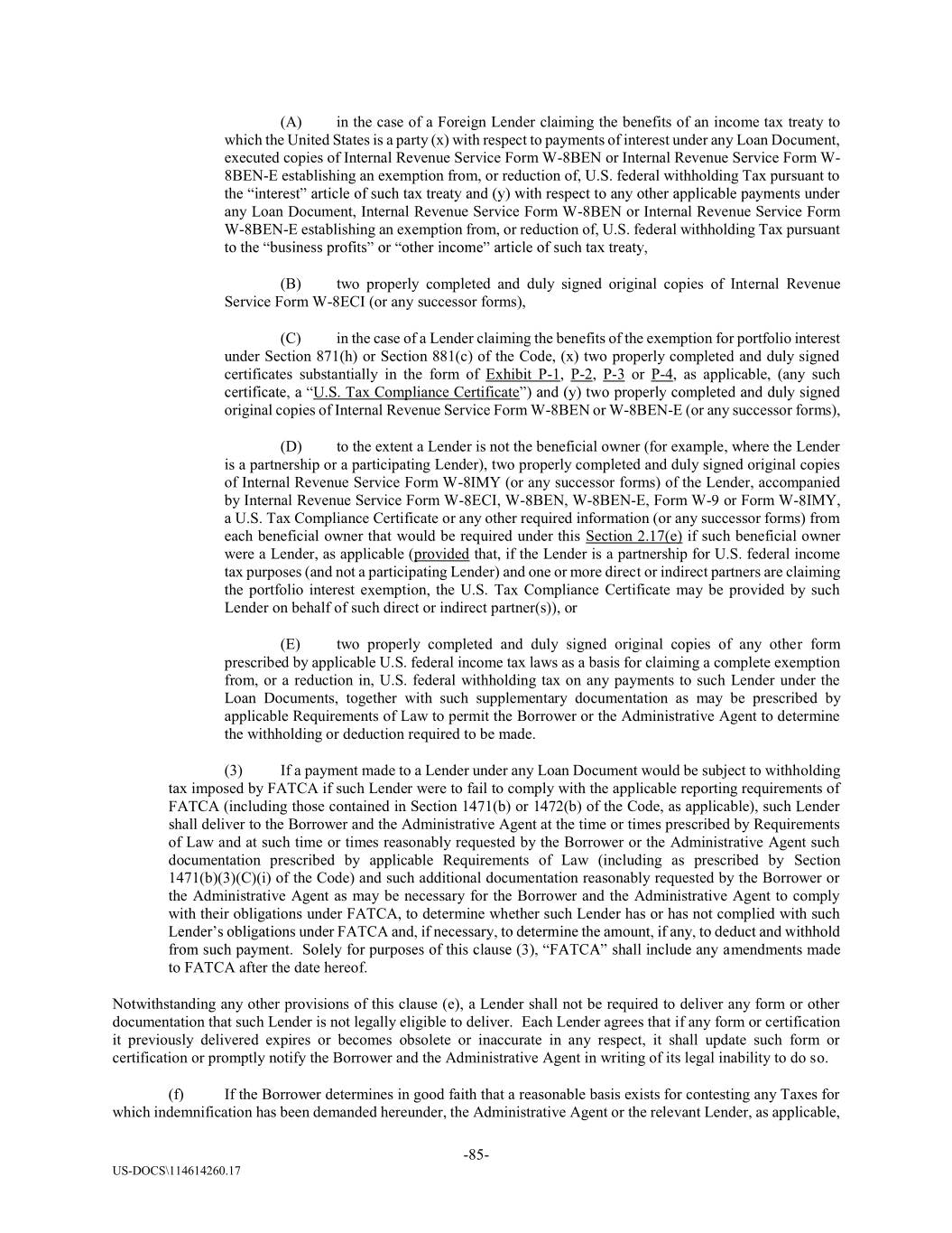 (A) in the case of a Foreign Lender claiming the benefits of an income tax treaty to which the United States is a party (x) with respect to payments of interest under any Loan Document, executed copies of Internal Revenue Service Form W-8BEN or Internal Revenue Service Form W- 8BEN-E establishing an exemption from, or reduction of, U.S. federal withholding Tax pursuant to any Loan Document, Internal Revenue Service Form W-8BEN or Internal Revenue Service Form W-8BEN-E establishing an exemption from, or reduction of, U.S. federal withholding Tax pursuant (B) two properly completed and duly signed original copies of Internal Revenue Service Form W-8ECI (or any successor forms), (C) in the case of a Lender claiming the benefits of the exemption for portfolio interest under Section 871(h) or Section 881(c) of the Code, (x) two properly completed and duly signed certificates substantially in the form of Exhibit P-1, P-2, P-3 or P-4, as applicable, (any such U.S. Tax Compliance Certificate original copies of Internal Revenue Service Form W-8BEN or W-8BEN-E (or any successor forms), (D) to the extent a Lender is not the beneficial owner (for example, where the Lender is a partnership or a participating Lender), two properly completed and duly signed original copies of Internal Revenue Service Form W-8IMY (or any successor forms) of the Lender, accompanied by Internal Revenue Service Form W-8ECI, W-8BEN, W-8BEN-E, Form W-9 or Form W-8IMY, a U.S. Tax Compliance Certificate or any other required information (or any successor forms) from each beneficial owner that would be required under this Section 2.17(e) if such beneficial owner were a Lender, as applicable (provided that, if the Lender is a partnership for U.S. federal income tax purposes (and not a participating Lender) and one or more direct or indirect partners are claiming the portfolio interest exemption, the U.S. Tax Compliance Certificate may be provided by such Lender on behalf of such direct or indirect partner(s)), or (E) two properly completed and duly signed original copies of any other form prescribed by applicable U.S. federal income tax laws as a basis for claiming a complete exemption from, or a reduction in, U.S. federal withholding tax on any payments to such Lender under the Loan Documents, together with such supplementary documentation as may be prescribed by applicable Requirements of Law to permit the Borrower or the Administrative Agent to determine the withholding or deduction required to be made. (3) If a payment made to a Lender under any Loan Document would be subject to withholding tax imposed by FATCA if such Lender were to fail to comply with the applicable reporting requirements of FATCA (including those contained in Section 1471(b) or 1472(b) of the Code, as applicable), such Lender shall deliver to the Borrower and the Administrative Agent at the time or times prescribed by Requirements of Law and at such time or times reasonably requested by the Borrower or the Administrative Agent such documentation prescribed by applicable Requirements of Law (including as prescribed by Section 1471(b)(3)(C)(i) of the Code) and such additional documentation reasonably requested by the Borrower or the Administrative Agent as may be necessary for the Borrower and the Administrative Agent to comply with their obligations under FATCA, to determine whether such Lender has or has not complied with such mendments made to FATCA after the date hereof. Notwithstanding any other provisions of this clause (e), a Lender shall not be required to deliver any form or other documentation that such Lender is not legally eligible to deliver. Each Lender agrees that if any form or certification it previously delivered expires or becomes obsolete or inaccurate in any respect, it shall update such form or certification or promptly notify the Borrower and the Administrative Agent in writing of its legal inability to do so. (f) If the Borrower determines in good faith that a reasonable basis exists for contesting any Taxes for which indemnification has been demanded hereunder, the Administrative Agent or the relevant Lender, as applicable, -85- US-DOCS\114614260.17
