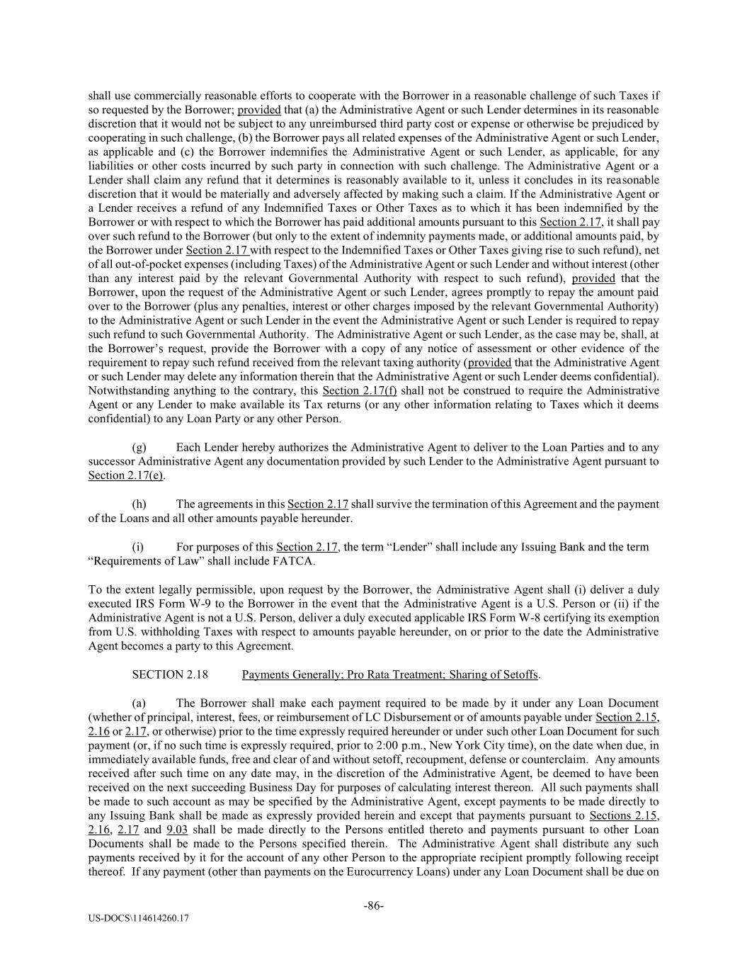 shall use commercially reasonable efforts to cooperate with the Borrower in a reasonable challenge of such Taxes if so requested by the Borrower; provided that (a) the Administrative Agent or such Lender determines in its reasonable discretion that it would not be subject to any unreimbursed third party cost or expense or otherwise be prejudiced by cooperating in such challenge, (b) the Borrower pays all related expenses of the Administrative Agent or such Lender, as applicable and (c) the Borrower indemnifies the Administrative Agent or such Lender, as applicable, for any liabilities or other costs incurred by such party in connection with such challenge. The Administrative Agent or a Lender shall claim any refund that it determines is reasonably available to it, unless it concludes in its reasonable discretion that it would be materially and adversely affected by making such a claim. If the Administrative Agent or a Lender receives a refund of any Indemnified Taxes or Other Taxes as to which it has been indemnified by the Borrower or with respect to which the Borrower has paid additional amounts pursuant to this Section 2.17, it shall pay over such refund to the Borrower (but only to the extent of indemnity payments made, or additional amounts paid, by the Borrower under Section 2.17 with respect to the Indemnified Taxes or Other Taxes giving rise to such refund), net of all out-of-pocket expenses (including Taxes) of the Administrative Agent or such Lender and without interest (other than any interest paid by the relevant Governmental Authority with respect to such refund), provided that the Borrower, upon the request of the Administrative Agent or such Lender, agrees promptly to repay the amount paid over to the Borrower (plus any penalties, interest or other charges imposed by the relevant Governmental Authority) to the Administrative Agent or such Lender in the event the Administrative Agent or such Lender is required to repay such refund to such Governmental Authority. The Administrative Agent or such Lender, as the case may be, shall, at wer with a copy of any notice of assessment or other evidence of the requirement to repay such refund received from the relevant taxing authority (provided that the Administrative Agent or such Lender may delete any information therein that the Administrative Agent or such Lender deems confidential). Notwithstanding anything to the contrary, this Section 2.17(f) shall not be construed to require the Administrative Agent or any Lender to make available its Tax returns (or any other information relating to Taxes which it deems confidential) to any Loan Party or any other Person. (g) Each Lender hereby authorizes the Administrative Agent to deliver to the Loan Parties and to any successor Administrative Agent any documentation provided by such Lender to the Administrative Agent pursuant to Section 2.17(e). (h) The agreements in this Section 2.17 shall survive the termination of this Agreement and the payment of the Loans and all other amounts payable hereunder. (i) For purposes of this Section 2.17 To the extent legally permissible, upon request by the Borrower, the Administrative Agent shall (i) deliver a duly executed IRS Form W-9 to the Borrower in the event that the Administrative Agent is a U.S. Person or (ii) if the Administrative Agent is not a U.S. Person, deliver a duly executed applicable IRS Form W-8 certifying its exemption from U.S. withholding Taxes with respect to amounts payable hereunder, on or prior to the date the Administrative Agent becomes a party to this Agreement. SECTION 2.18 Payments Generally; Pro Rata Treatment; Sharing of Setoffs. (a) The Borrower shall make each payment required to be made by it under any Loan Document (whether of principal, interest, fees, or reimbursement of LC Disbursement or of amounts payable under Section 2.15, 2.16 or 2.17, or otherwise) prior to the time expressly required hereunder or under such other Loan Document for such payment (or, if no such time is expressly required, prior to 2:00 p.m., New York City time), on the date when due, in immediately available funds, free and clear of and without setoff, recoupment, defense or counterclaim. Any amounts received after such time on any date may, in the discretion of the Administrative Agent, be deemed to have been received on the next succeeding Business Day for purposes of calculating interest thereon. All such payments shall be made to such account as may be specified by the Administrative Agent, except payments to be made directly to any Issuing Bank shall be made as expressly provided herein and except that payments pursuant to Sections 2.15, 2.16, 2.17 and 9.03 shall be made directly to the Persons entitled thereto and payments pursuant to other Loan Documents shall be made to the Persons specified therein. The Administrative Agent shall distribute any such payments received by it for the account of any other Person to the appropriate recipient promptly following receipt thereof. If any payment (other than payments on the Eurocurrency Loans) under any Loan Document shall be due on -86- US-DOCS\114614260.17