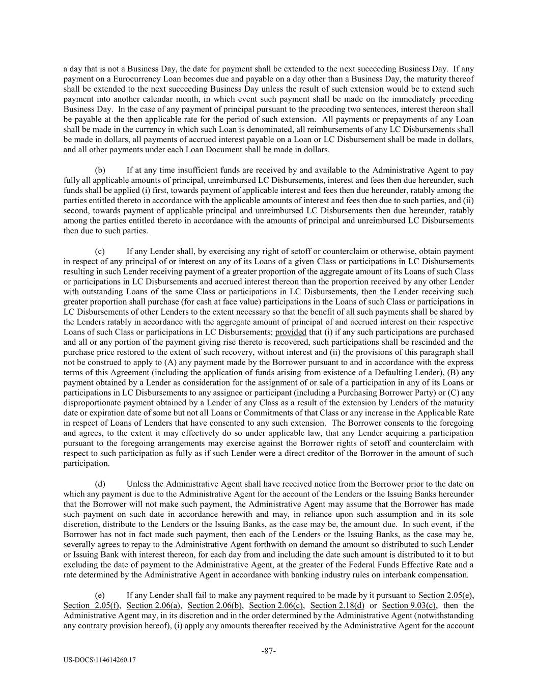 a day that is not a Business Day, the date for payment shall be extended to the next succeeding Business Day. If any payment on a Eurocurrency Loan becomes due and payable on a day other than a Business Day, the maturity thereof shall be extended to the next succeeding Business Day unless the result of such extension would be to extend such payment into another calendar month, in which event such payment shall be made on the immediately preceding Business Day. In the case of any payment of principal pursuant to the preceding two sentences, interest thereon shall be payable at the then applicable rate for the period of such extension. All payments or prepayments of any Loan shall be made in the currency in which such Loan is denominated, all reimbursements of any LC Disbursements shall be made in dollars, all payments of accrued interest payable on a Loan or LC Disbursement shall be made in dollars, and all other payments under each Loan Document shall be made in dollars. (b) If at any time insufficient funds are received by and available to the Administrative Agent to pay fully all applicable amounts of principal, unreimbursed LC Disbursements, interest and fees then due hereunder, such funds shall be applied (i) first, towards payment of applicable interest and fees then due hereunder, ratably among the parties entitled thereto in accordance with the applicable amounts of interest and fees then due to such parties, and (ii) second, towards payment of applicable principal and unreimbursed LC Disbursements then due hereunder, ratably among the parties entitled thereto in accordance with the amounts of principal and unreimbursed LC Disbursements then due to such parties. (c) If any Lender shall, by exercising any right of setoff or counterclaim or otherwise, obtain payment in respect of any principal of or interest on any of its Loans of a given Class or participations in LC Disbursements resulting in such Lender receiving payment of a greater proportion of the aggregate amount of its Loans of such Class or participations in LC Disbursements and accrued interest thereon than the proportion received by any other Lender with outstanding Loans of the same Class or participations in LC Disbursements, then the Lender receiving such greater proportion shall purchase (for cash at face value) participations in the Loans of such Class or participations in LC Disbursements of other Lenders to the extent necessary so that the benefit of all such payments shall be shared by the Lenders ratably in accordance with the aggregate amount of principal of and accrued interest on their respective Loans of such Class or participations in LC Disbursements; provided that (i) if any such participations are purchased and all or any portion of the payment giving rise thereto is recovered, such participations shall be rescinded and the purchase price restored to the extent of such recovery, without interest and (ii) the provisions of this paragraph shall not be construed to apply to (A) any payment made by the Borrower pursuant to and in accordance with the express terms of this Agreement (including the application of funds arising from existence of a Defaulting Lender), (B) any payment obtained by a Lender as consideration for the assignment of or sale of a participation in any of its Loans or participations in LC Disbursements to any assignee or participant (including a Purchasing Borrower Party) or (C) any disproportionate payment obtained by a Lender of any Class as a result of the extension by Lenders of the maturity date or expiration date of some but not all Loans or Commitments of that Class or any increase in the Applicable Rate in respect of Loans of Lenders that have consented to any such extension. The Borrower consents to the foregoing and agrees, to the extent it may effectively do so under applicable law, that any Lender acquiring a participation pursuant to the foregoing arrangements may exercise against the Borrower rights of setoff and counterclaim with respect to such participation as fully as if such Lender were a direct creditor of the Borrower in the amount of such participation. (d) Unless the Administrative Agent shall have received notice from the Borrower prior to the date on which any payment is due to the Administrative Agent for the account of the Lenders or the Issuing Banks hereunder that the Borrower will not make such payment, the Administrative Agent may assume that the Borrower has made such payment on such date in accordance herewith and may, in reliance upon such assumption and in its sole discretion, distribute to the Lenders or the Issuing Banks, as the case may be, the amount due. In such event, if the Borrower has not in fact made such payment, then each of the Lenders or the Issuing Banks, as the case may be, severally agrees to repay to the Administrative Agent forthwith on demand the amount so distributed to such Lender or Issuing Bank with interest thereon, for each day from and including the date such amount is distributed to it to but excluding the date of payment to the Administrative Agent, at the greater of the Federal Funds Effective Rate and a rate determined by the Administrative Agent in accordance with banking industry rules on interbank compensation. (e) If any Lender shall fail to make any payment required to be made by it pursuant to Section 2.05(e), Section 2.05(f), Section 2.06(a), Section 2.06(b), Section 2.06(c), Section 2.18(d) or Section 9.03(c), then the Administrative Agent may, in its discretion and in the order determined by the Administrative Agent (notwithstanding any contrary provision hereof), (i) apply any amounts thereafter received by the Administrative Agent for the account -87- US-DOCS\114614260.17
