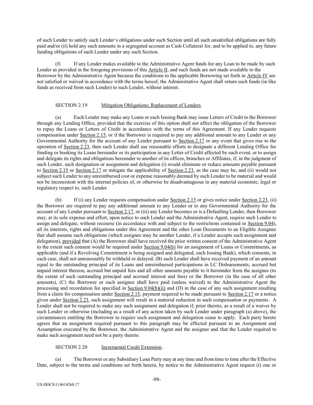 paid and/or (ii) hold any such amounts in a segregated account as Cash Collateral for, and to be applied to, any future funding obligations of such Lender under any such Section. (f) If any Lender makes available to the Administrative Agent funds for any Loan to be made by such Lender as provided in the foregoing provisions of this Article II, and such funds are not made available to the Borrower by the Administrative Agent because the conditions to the applicable Borrowing set forth in Article IV are not satisfied or waived in accordance with the terms hereof, the Administrative Agent shall return such funds (in like funds as received from such Lender) to such Lender, without interest. SECTION 2.19 Mitigation Obligations; Replacement of Lenders. (a) Each Lender may make any Loans or each Issuing Bank may issue Letters of Credit to the Borrower through any Lending Office, provided that the exercise of this option shall not affect the obligation of the Borrower to repay the Loans or Letters of Credit in accordance with the terms of this Agreement. If any Lender requests compensation under Section 2.15, or if the Borrower is required to pay any additional amount to any Lender or any Governmental Authority for the account of any Lender pursuant to Section 2.17 or any event that gives rise to the operation of Section 2.23, then such Lender shall use reasonable efforts to designate a different Lending Office for funding or booking its Loans hereunder or its participation in any Letter of Credit affected by such event, or to assign and delegate its rights and obligations hereunder to another of its offices, branches or Affiliates, if, in the judgment of such Lender, such designation or assignment and delegation (i) would eliminate or reduce amounts payable pursuant to Section 2.15 or Section 2.17 or mitigate the applicability of Section 2.23, as the case may be, and (ii) would not subject such Lender to any unreimbursed cost or expense reasonably deemed by such Lender to be material and would not be inconsistent with the internal policies of, or otherwise be disadvantageous in any material economic, legal or regulatory respect to, such Lender. (b) If (i) any Lender requests compensation under Section 2.15 or gives notice under Section 2.23, (ii) the Borrower are required to pay any additional amount to any Lender or to any Governmental Authority for the account of any Lender pursuant to Section 2.17, or (iii) any Lender becomes or is a Defaulting Lender, then Borrower may, at its sole expense and effort, upon notice to such Lender and the Administrative Agent, require such Lender to assign and delegate, without recourse (in accordance with and subject to the restrictions contained in Section 9.04), all its interests, rights and obligations under this Agreement and the other Loan Documents to an Eligible Assignee that shall assume such obligations (which assignee may be another Lender, if a Lender accepts such assignment and delegation), provided that (A) the Borrower shall have received the prior written consent of the Administrative Agent to the extent such consent would be required under Section 9.04(b) for an assignment of Loans or Commitments, as applicable (and if a Revolving Commitment is being assigned and delegated, each Issuing Bank), which consents, in each case, shall not unreasonably be withheld or delayed, (B) such Lender shall have received payment of an amount equal to the outstanding principal of its Loans and unreimbursed participations in LC Disbursements, accrued but unpaid interest thereon, accrued but unpaid fees and all other amounts payable to it hereunder from the assignee (to the extent of such outstanding principal and accrued interest and fees) or the Borrower (in the case of all other amounts), (C) the Borrower or such assignee shall have paid (unless waived) to the Administrative Agent the processing and recordation fee specified in Section 9.04(b)(ii) and (D) in the case of any such assignment resulting from a claim for compensation under Section 2.15, payment required to be made pursuant to Section 2.17 or a notice given under Section 2.23, such assignment will result in a material reduction in such compensation or payments. A Lender shall not be required to make any such assignment and delegation if, prior thereto, as a result of a waiver by such Lender or otherwise (including as a result of any action taken by such Lender under paragraph (a) above), the circumstances entitling the Borrower to require such assignment and delegation cease to apply. Each party hereto agrees that an assignment required pursuant to this paragraph may be effected pursuant to an Assignment and Assumption executed by the Borrower, the Administrative Agent and the assignee and that the Lender required to make such assignment need not be a party thereto. SECTION 2.20 Incremental Credit Extension. (a) The Borrower or any Subsidiary Loan Party may at any time and from time to time after the Effective Date, subject to the terms and conditions set forth herein, by notice to the Administrative Agent request (i) one or -88- US-DOCS\114614260.17