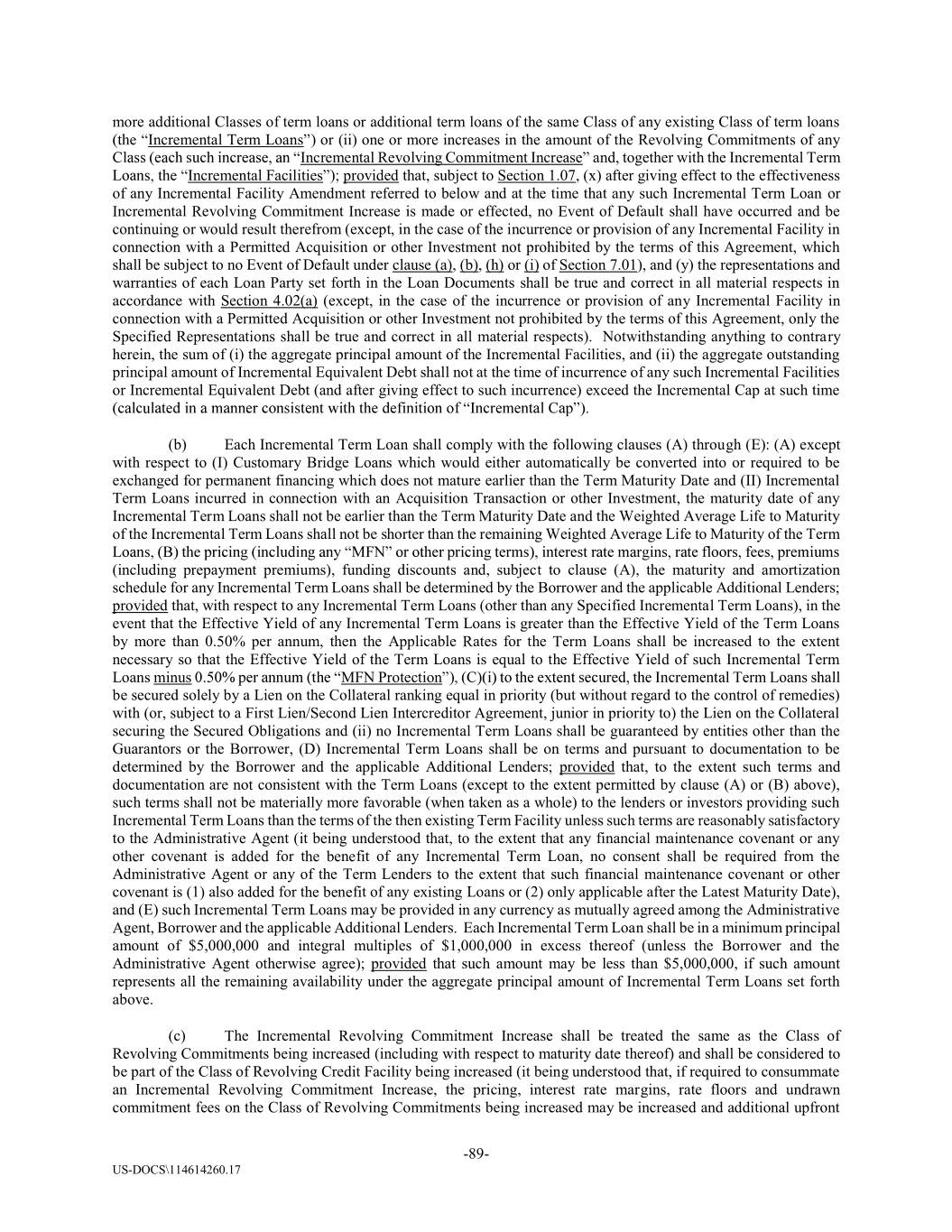 more additional Classes of term loans or additional term loans of the same Class of any existing Class of term loans Incremental Term Loans or (ii) one or more increases in the amount of the Revolving Commitments of any Incremental Revolving Commitment Increase and, together with the Incremental Term Incremental Facilities provided that, subject to Section 1.07, (x) after giving effect to the effectiveness of any Incremental Facility Amendment referred to below and at the time that any such Incremental Term Loan or Incremental Revolving Commitment Increase is made or effected, no Event of Default shall have occurred and be continuing or would result therefrom (except, in the case of the incurrence or provision of any Incremental Facility in connection with a Permitted Acquisition or other Investment not prohibited by the terms of this Agreement, which shall be subject to no Event of Default under clause (a), (b), (h) or (i) of Section 7.01), and (y) the representations and warranties of each Loan Party set forth in the Loan Documents shall be true and correct in all material respects in accordance with Section 4.02(a) (except, in the case of the incurrence or provision of any Incremental Facility in connection with a Permitted Acquisition or other Investment not prohibited by the terms of this Agreement, only the Specified Representations shall be true and correct in all material respects). Notwithstanding anything to contrary herein, the sum of (i) the aggregate principal amount of the Incremental Facilities, and (ii) the aggregate outstanding principal amount of Incremental Equivalent Debt shall not at the time of incurrence of any such Incremental Facilities or Incremental Equivalent Debt (and after giving effect to such incurrence) exceed the Incremental Cap at such time (b) Each Incremental Term Loan shall comply with the following clauses (A) through (E): (A) except with respect to (I) Customary Bridge Loans which would either automatically be converted into or required to be exchanged for permanent financing which does not mature earlier than the Term Maturity Date and (II) Incremental Term Loans incurred in connection with an Acquisition Transaction or other Investment, the maturity date of any Incremental Term Loans shall not be earlier than the Term Maturity Date and the Weighted Average Life to Maturity of the Incremental Term Loans shall not be shorter than the remaining Weighted Average Life to Maturity of the Term (including prepayment premiums), funding discounts and, subject to clause (A), the maturity and amortization schedule for any Incremental Term Loans shall be determined by the Borrower and the applicable Additional Lenders; provided that, with respect to any Incremental Term Loans (other than any Specified Incremental Term Loans), in the event that the Effective Yield of any Incremental Term Loans is greater than the Effective Yield of the Term Loans by more than 0.50% per annum, then the Applicable Rates for the Term Loans shall be increased to the extent necessary so that the Effective Yield of the Term Loans is equal to the Effective Yield of such Incremental Term Loans minus MFN Protection be secured solely by a Lien on the Collateral ranking equal in priority (but without regard to the control of remedies) with (or, subject to a First Lien/Second Lien Intercreditor Agreement, junior in priority to) the Lien on the Collateral securing the Secured Obligations and (ii) no Incremental Term Loans shall be guaranteed by entities other than the Guarantors or the Borrower, (D) Incremental Term Loans shall be on terms and pursuant to documentation to be determined by the Borrower and the applicable Additional Lenders; provided that, to the extent such terms and documentation are not consistent with the Term Loans (except to the extent permitted by clause (A) or (B) above), such terms shall not be materially more favorable (when taken as a whole) to the lenders or investors providing such Incremental Term Loans than the terms of the then existing Term Facility unless such terms are reasonably satisfactory to the Administrative Agent (it being understood that, to the extent that any financial maintenance covenant or any other covenant is added for the benefit of any Incremental Term Loan, no consent shall be required from the Administrative Agent or any of the Term Lenders to the extent that such financial maintenance covenant or other covenant is (1) also added for the benefit of any existing Loans or (2) only applicable after the Latest Maturity Date), and (E) such Incremental Term Loans may be provided in any currency as mutually agreed among the Administrative Agent, Borrower and the applicable Additional Lenders. Each Incremental Term Loan shall be in a minimum principal amount of $5,000,000 and integral multiples of $1,000,000 in excess thereof (unless the Borrower and the Administrative Agent otherwise agree); provided that such amount may be less than $5,000,000, if such amount represents all the remaining availability under the aggregate principal amount of Incremental Term Loans set forth above. (c) The Incremental Revolving Commitment Increase shall be treated the same as the Class of Revolving Commitments being increased (including with respect to maturity date thereof) and shall be considered to be part of the Class of Revolving Credit Facility being increased (it being understood that, if required to consummate an Incremental Revolving Commitment Increase, the pricing, interest rate margins, rate floors and undrawn commitment fees on the Class of Revolving Commitments being increased may be increased and additional upfront -89- US-DOCS\114614260.17