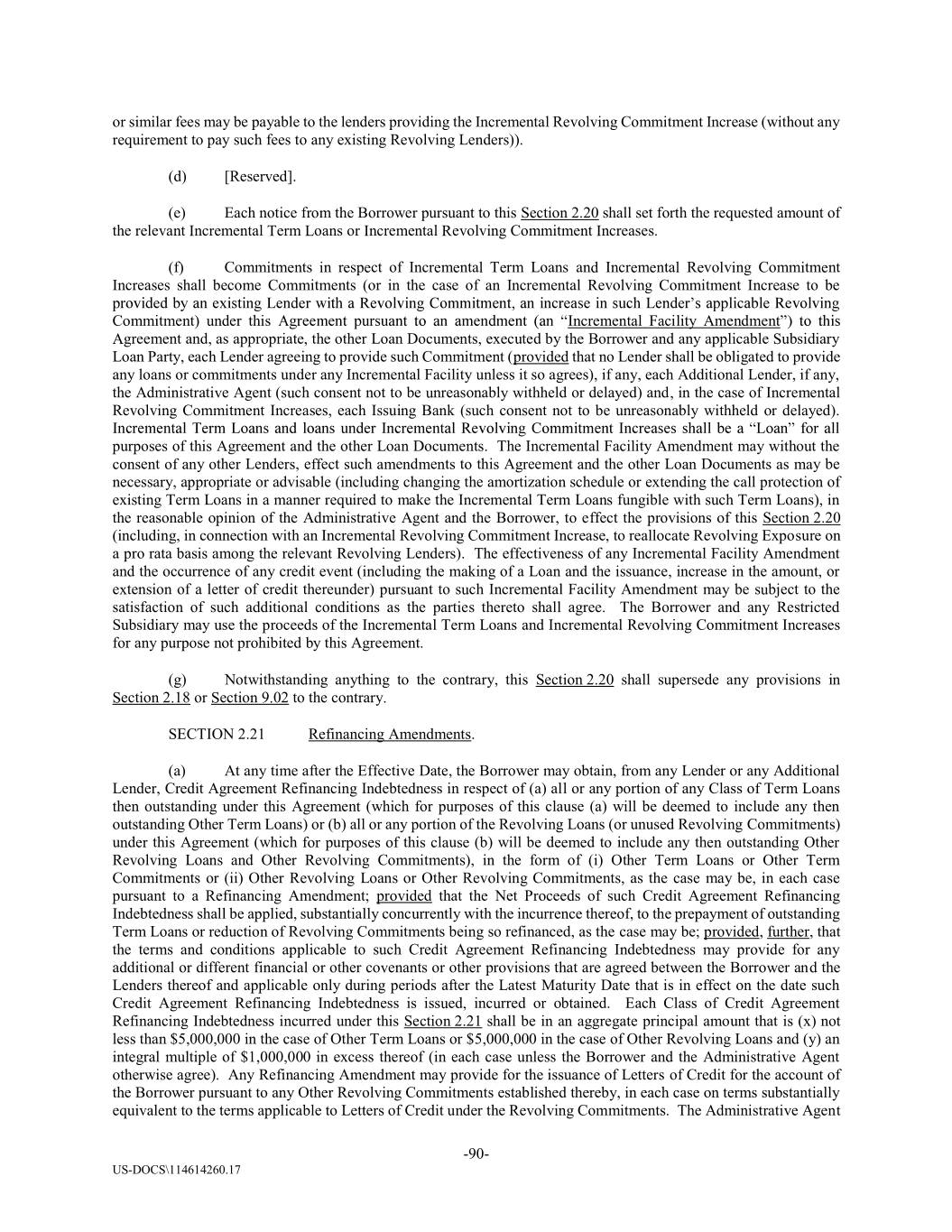 or similar fees may be payable to the lenders providing the Incremental Revolving Commitment Increase (without any requirement to pay such fees to any existing Revolving Lenders)). (d) [Reserved]. (e) Each notice from the Borrower pursuant to this Section 2.20 shall set forth the requested amount of the relevant Incremental Term Loans or Incremental Revolving Commitment Increases. (f) Commitments in respect of Incremental Term Loans and Incremental Revolving Commitment Increases shall become Commitments (or in the case of an Incremental Revolving Commitment Increase to be Commitment) under this Incremental Facility Amendment Agreement and, as appropriate, the other Loan Documents, executed by the Borrower and any applicable Subsidiary Loan Party, each Lender agreeing to provide such Commitment (provided that no Lender shall be obligated to provide any loans or commitments under any Incremental Facility unless it so agrees), if any, each Additional Lender, if any, the Administrative Agent (such consent not to be unreasonably withheld or delayed) and, in the case of Incremental Revolving Commitment Increases, each Issuing Bank (such consent not to be unreasonably withheld or delayed). purposes of this Agreement and the other Loan Documents. The Incremental Facility Amendment may without the consent of any other Lenders, effect such amendments to this Agreement and the other Loan Documents as may be necessary, appropriate or advisable (including changing the amortization schedule or extending the call protection of existing Term Loans in a manner required to make the Incremental Term Loans fungible with such Term Loans), in the reasonable opinion of the Administrative Agent and the Borrower, to effect the provisions of this Section 2.20 (including, in connection with an Incremental Revolving Commitment Increase, to reallocate Revolving Exposure on a pro rata basis among the relevant Revolving Lenders). The effectiveness of any Incremental Facility Amendment and the occurrence of any credit event (including the making of a Loan and the issuance, increase in the amount, or extension of a letter of credit thereunder) pursuant to such Incremental Facility Amendment may be subject to the satisfaction of such additional conditions as the parties thereto shall agree. The Borrower and any Restricted Subsidiary may use the proceeds of the Incremental Term Loans and Incremental Revolving Commitment Increases for any purpose not prohibited by this Agreement. (g) Notwithstanding anything to the contrary, this Section 2.20 shall supersede any provisions in Section 2.18 or Section 9.02 to the contrary. SECTION 2.21 Refinancing Amendments. (a) At any time after the Effective Date, the Borrower may obtain, from any Lender or any Additional Lender, Credit Agreement Refinancing Indebtedness in respect of (a) all or any portion of any Class of Term Loans then outstanding under this Agreement (which for purposes of this clause (a) will be deemed to include any then outstanding Other Term Loans) or (b) all or any portion of the Revolving Loans (or unused Revolving Commitments) under this Agreement (which for purposes of this clause (b) will be deemed to include any then outstanding Other Revolving Loans and Other Revolving Commitments), in the form of (i) Other Term Loans or Other Term Commitments or (ii) Other Revolving Loans or Other Revolving Commitments, as the case may be, in each case pursuant to a Refinancing Amendment; provided that the Net Proceeds of such Credit Agreement Refinancing Indebtedness shall be applied, substantially concurrently with the incurrence thereof, to the prepayment of outstanding Term Loans or reduction of Revolving Commitments being so refinanced, as the case may be; provided, further, that the terms and conditions applicable to such Credit Agreement Refinancing Indebtedness may provide for any additional or different financial or other covenants or other provisions that are agreed between the Borrower and the Lenders thereof and applicable only during periods after the Latest Maturity Date that is in effect on the date such Credit Agreement Refinancing Indebtedness is issued, incurred or obtained. Each Class of Credit Agreement Refinancing Indebtedness incurred under this Section 2.21 shall be in an aggregate principal amount that is (x) not less than $5,000,000 in the case of Other Term Loans or $5,000,000 in the case of Other Revolving Loans and (y) an integral multiple of $1,000,000 in excess thereof (in each case unless the Borrower and the Administrative Agent otherwise agree). Any Refinancing Amendment may provide for the issuance of Letters of Credit for the account of the Borrower pursuant to any Other Revolving Commitments established thereby, in each case on terms substantially equivalent to the terms applicable to Letters of Credit under the Revolving Commitments. The Administrative Agent -90- US-DOCS\114614260.17