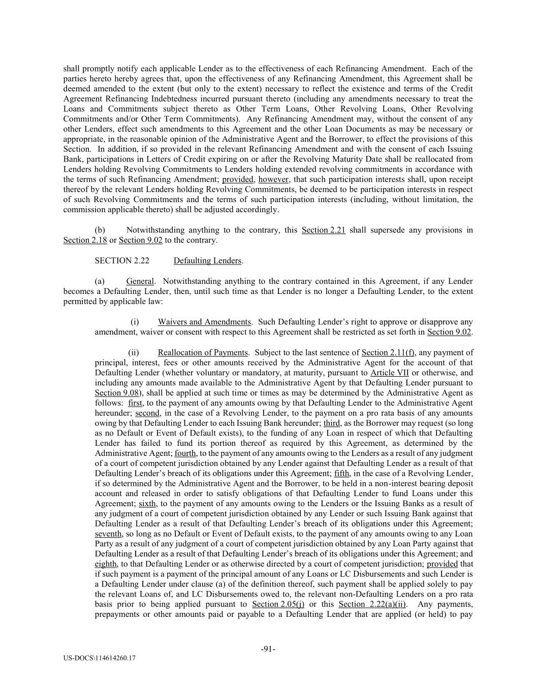 shall promptly notify each applicable Lender as to the effectiveness of each Refinancing Amendment. Each of the parties hereto hereby agrees that, upon the effectiveness of any Refinancing Amendment, this Agreement shall be deemed amended to the extent (but only to the extent) necessary to reflect the existence and terms of the Credit Agreement Refinancing Indebtedness incurred pursuant thereto (including any amendments necessary to treat the Loans and Commitments subject thereto as Other Term Loans, Other Revolving Loans, Other Revolving Commitments and/or Other Term Commitments). Any Refinancing Amendment may, without the consent of any other Lenders, effect such amendments to this Agreement and the other Loan Documents as may be necessary or appropriate, in the reasonable opinion of the Administrative Agent and the Borrower, to effect the provisions of this Section. In addition, if so provided in the relevant Refinancing Amendment and with the consent of each Issuing Bank, participations in Letters of Credit expiring on or after the Revolving Maturity Date shall be reallocated from Lenders holding Revolving Commitments to Lenders holding extended revolving commitments in accordance with the terms of such Refinancing Amendment; provided, however, that such participation interests shall, upon receipt thereof by the relevant Lenders holding Revolving Commitments, be deemed to be participation interests in respect of such Revolving Commitments and the terms of such participation interests (including, without limitation, the commission applicable thereto) shall be adjusted accordingly. (b) Notwithstanding anything to the contrary, this Section 2.21 shall supersede any provisions in Section 2.18 or Section 9.02 to the contrary. SECTION 2.22 Defaulting Lenders. (a) General. Notwithstanding anything to the contrary contained in this Agreement, if any Lender becomes a Defaulting Lender, then, until such time as that Lender is no longer a Defaulting Lender, to the extent permitted by applicable law: (i) Waivers and Amendments amendment, waiver or consent with respect to this Agreement shall be restricted as set forth in Section 9.02. (ii) Reallocation of Payments. Subject to the last sentence of Section 2.11(f), any payment of principal, interest, fees or other amounts received by the Administrative Agent for the account of that Defaulting Lender (whether voluntary or mandatory, at maturity, pursuant to Article VII or otherwise, and including any amounts made available to the Administrative Agent by that Defaulting Lender pursuant to Section 9.08), shall be applied at such time or times as may be determined by the Administrative Agent as follows: first, to the payment of any amounts owing by that Defaulting Lender to the Administrative Agent hereunder; second, in the case of a Revolving Lender, to the payment on a pro rata basis of any amounts owing by that Defaulting Lender to each Issuing Bank hereunder; third, as the Borrower may request (so long as no Default or Event of Default exists), to the funding of any Loan in respect of which that Defaulting Lender has failed to fund its portion thereof as required by this Agreement, as determined by the Administrative Agent; fourth, to the payment of any amounts owing to the Lenders as a result of any judgment of a court of competent jurisdiction obtained by any Lender against that Defaulting Lender as a result of that fifth, in the case of a Revolving Lender, if so determined by the Administrative Agent and the Borrower, to be held in a non-interest bearing deposit account and released in order to satisfy obligations of that Defaulting Lender to fund Loans under this Agreement; sixth, to the payment of any amounts owing to the Lenders or the Issuing Banks as a result of any judgment of a court of competent jurisdiction obtained by any Lender or such Issuing Bank against that Defaulting Lender as a result of that Defaulting Lender seventh, so long as no Default or Event of Default exists, to the payment of any amounts owing to any Loan Party as a result of any judgment of a court of competent jurisdiction obtained by any Loan Party against that eighth, to that Defaulting Lender or as otherwise directed by a court of competent jurisdiction; provided that if such payment is a payment of the principal amount of any Loans or LC Disbursements and such Lender is a Defaulting Lender under clause (a) of the definition thereof, such payment shall be applied solely to pay the relevant Loans of, and LC Disbursements owed to, the relevant non-Defaulting Lenders on a pro rata basis prior to being applied pursuant to Section 2.05(j) or this Section 2.22(a)(ii). Any payments, prepayments or other amounts paid or payable to a Defaulting Lender that are applied (or held) to pay -91- US-DOCS\114614260.17