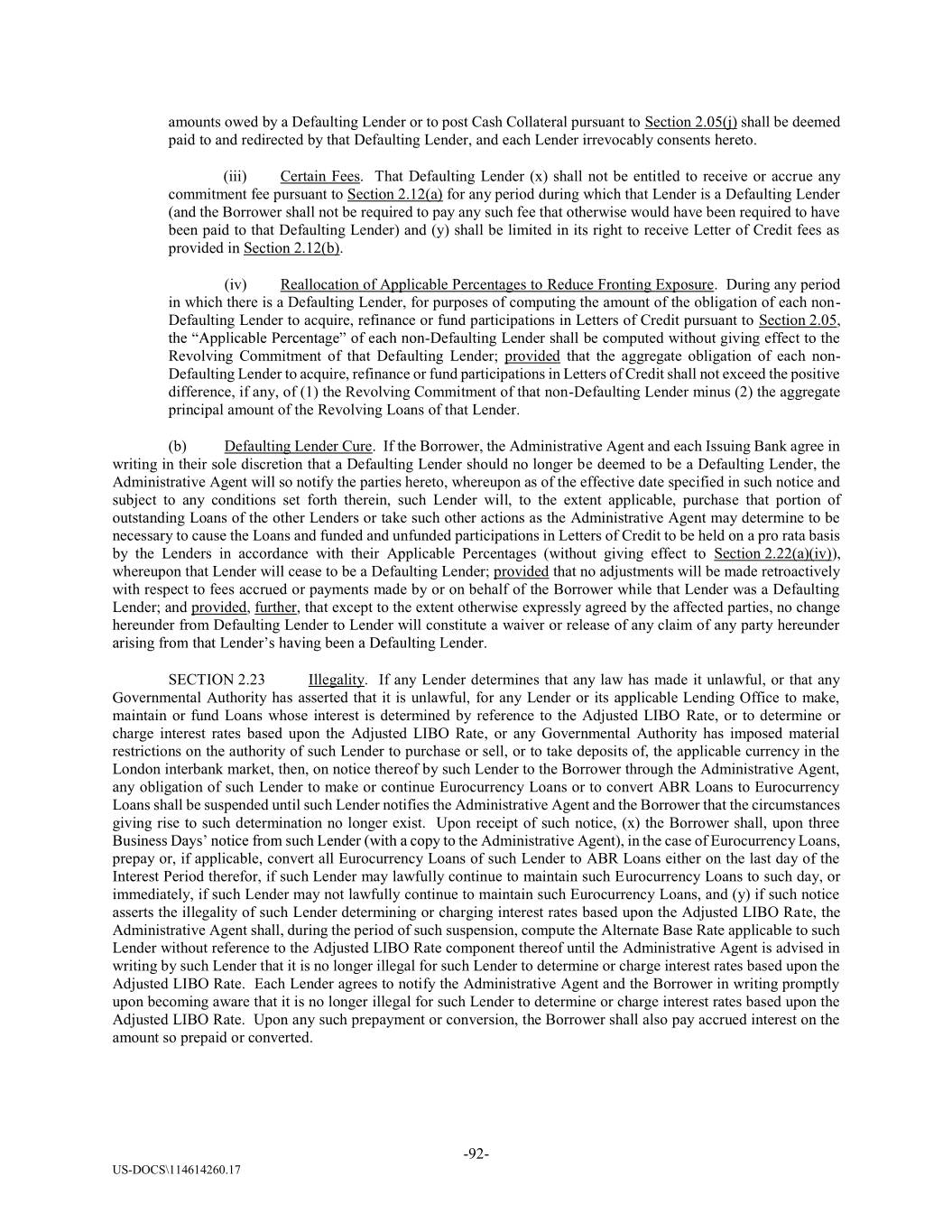 amounts owed by a Defaulting Lender or to post Cash Collateral pursuant to Section 2.05(j) shall be deemed paid to and redirected by that Defaulting Lender, and each Lender irrevocably consents hereto. (iii) Certain Fees. That Defaulting Lender (x) shall not be entitled to receive or accrue any commitment fee pursuant to Section 2.12(a) for any period during which that Lender is a Defaulting Lender (and the Borrower shall not be required to pay any such fee that otherwise would have been required to have been paid to that Defaulting Lender) and (y) shall be limited in its right to receive Letter of Credit fees as provided in Section 2.12(b). (iv) Reallocation of Applicable Percentages to Reduce Fronting Exposure. During any period in which there is a Defaulting Lender, for purposes of computing the amount of the obligation of each non- Defaulting Lender to acquire, refinance or fund participations in Letters of Credit pursuant to Section 2.05, -Defaulting Lender shall be computed without giving effect to the Revolving Commitment of that Defaulting Lender; provided that the aggregate obligation of each non- Defaulting Lender to acquire, refinance or fund participations in Letters of Credit shall not exceed the positive difference, if any, of (1) the Revolving Commitment of that non-Defaulting Lender minus (2) the aggregate principal amount of the Revolving Loans of that Lender. (b) Defaulting Lender Cure. If the Borrower, the Administrative Agent and each Issuing Bank agree in writing in their sole discretion that a Defaulting Lender should no longer be deemed to be a Defaulting Lender, the Administrative Agent will so notify the parties hereto, whereupon as of the effective date specified in such notice and subject to any conditions set forth therein, such Lender will, to the extent applicable, purchase that portion of outstanding Loans of the other Lenders or take such other actions as the Administrative Agent may determine to be necessary to cause the Loans and funded and unfunded participations in Letters of Credit to be held on a pro rata basis by the Lenders in accordance with their Applicable Percentages (without giving effect to Section 2.22(a)(iv)), whereupon that Lender will cease to be a Defaulting Lender; provided that no adjustments will be made retroactively with respect to fees accrued or payments made by or on behalf of the Borrower while that Lender was a Defaulting Lender; and provided, further, that except to the extent otherwise expressly agreed by the affected parties, no change hereunder from Defaulting Lender to Lender will constitute a waiver or release of any claim of any party hereunder SECTION 2.23 Illegality. If any Lender determines that any law has made it unlawful, or that any Governmental Authority has asserted that it is unlawful, for any Lender or its applicable Lending Office to make, maintain or fund Loans whose interest is determined by reference to the Adjusted LIBO Rate, or to determine or charge interest rates based upon the Adjusted LIBO Rate, or any Governmental Authority has imposed material restrictions on the authority of such Lender to purchase or sell, or to take deposits of, the applicable currency in the London interbank market, then, on notice thereof by such Lender to the Borrower through the Administrative Agent, any obligation of such Lender to make or continue Eurocurrency Loans or to convert ABR Loans to Eurocurrency Loans shall be suspended until such Lender notifies the Administrative Agent and the Borrower that the circumstances giving rise to such determination no longer exist. Upon receipt of such notice, (x) the Borrower shall, upon three e Administrative Agent), in the case of Eurocurrency Loans, prepay or, if applicable, convert all Eurocurrency Loans of such Lender to ABR Loans either on the last day of the Interest Period therefor, if such Lender may lawfully continue to maintain such Eurocurrency Loans to such day, or immediately, if such Lender may not lawfully continue to maintain such Eurocurrency Loans, and (y) if such notice asserts the illegality of such Lender determining or charging interest rates based upon the Adjusted LIBO Rate, the Administrative Agent shall, during the period of such suspension, compute the Alternate Base Rate applicable to such Lender without reference to the Adjusted LIBO Rate component thereof until the Administrative Agent is advised in writing by such Lender that it is no longer illegal for such Lender to determine or charge interest rates based upon the Adjusted LIBO Rate. Each Lender agrees to notify the Administrative Agent and the Borrower in writing promptly upon becoming aware that it is no longer illegal for such Lender to determine or charge interest rates based upon the Adjusted LIBO Rate. Upon any such prepayment or conversion, the Borrower shall also pay accrued interest on the amount so prepaid or converted. -92- US-DOCS\114614260.17