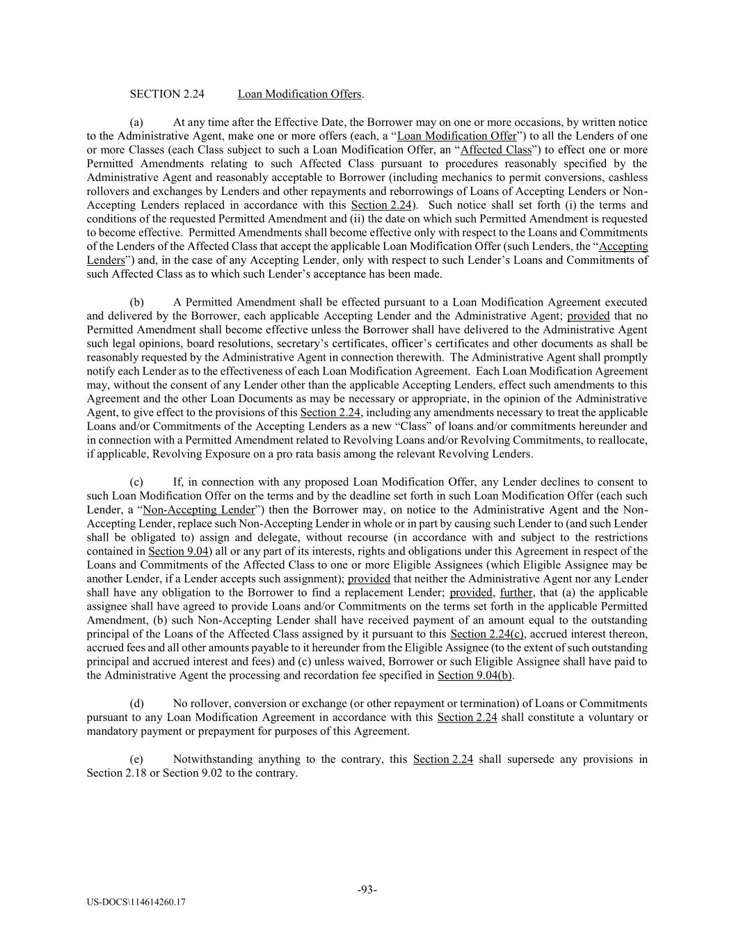 SECTION 2.24 Loan Modification Offers. (a) At any time after the Effective Date, the Borrower may on one or more occasions, by written notice Loan Modification Offer or more Classes (each Class subject to such a Lo Affected Class Permitted Amendments relating to such Affected Class pursuant to procedures reasonably specified by the Administrative Agent and reasonably acceptable to Borrower (including mechanics to permit conversions, cashless rollovers and exchanges by Lenders and other repayments and reborrowings of Loans of Accepting Lenders or Non- Accepting Lenders replaced in accordance with this Section 2.24). Such notice shall set forth (i) the terms and conditions of the requested Permitted Amendment and (ii) the date on which such Permitted Amendment is requested to become effective. Permitted Amendments shall become effective only with respect to the Loans and Commitments Accepting Lenders (b) A Permitted Amendment shall be effected pursuant to a Loan Modification Agreement executed and delivered by the Borrower, each applicable Accepting Lender and the Administrative Agent; provided that no Permitted Amendment shall become effective unless the Borrower shall have delivered to the Administrative Agent ificates and other documents as shall be reasonably requested by the Administrative Agent in connection therewith. The Administrative Agent shall promptly notify each Lender as to the effectiveness of each Loan Modification Agreement. Each Loan Modification Agreement may, without the consent of any Lender other than the applicable Accepting Lenders, effect such amendments to this Agreement and the other Loan Documents as may be necessary or appropriate, in the opinion of the Administrative Agent, to give effect to the provisions of this Section 2.24, including any amendments necessary to treat the applicable Loans and/or Commitments of the Accepting in connection with a Permitted Amendment related to Revolving Loans and/or Revolving Commitments, to reallocate, if applicable, Revolving Exposure on a pro rata basis among the relevant Revolving Lenders. (c) If, in connection with any proposed Loan Modification Offer, any Lender declines to consent to such Loan Modification Offer on the terms and by the deadline set forth in such Loan Modification Offer (each such Non-Accepting Lender - Accepting Lender, replace such Non-Accepting Lender in whole or in part by causing such Lender to (and such Lender shall be obligated to) assign and delegate, without recourse (in accordance with and subject to the restrictions contained in Section 9.04) all or any part of its interests, rights and obligations under this Agreement in respect of the Loans and Commitments of the Affected Class to one or more Eligible Assignees (which Eligible Assignee may be another Lender, if a Lender accepts such assignment); provided that neither the Administrative Agent nor any Lender shall have any obligation to the Borrower to find a replacement Lender; provided, further, that (a) the applicable assignee shall have agreed to provide Loans and/or Commitments on the terms set forth in the applicable Permitted Amendment, (b) such Non-Accepting Lender shall have received payment of an amount equal to the outstanding principal of the Loans of the Affected Class assigned by it pursuant to this Section 2.24(c), accrued interest thereon, accrued fees and all other amounts payable to it hereunder from the Eligible Assignee (to the extent of such outstanding principal and accrued interest and fees) and (c) unless waived, Borrower or such Eligible Assignee shall have paid to the Administrative Agent the processing and recordation fee specified in Section 9.04(b). (d) No rollover, conversion or exchange (or other repayment or termination) of Loans or Commitments pursuant to any Loan Modification Agreement in accordance with this Section 2.24 shall constitute a voluntary or mandatory payment or prepayment for purposes of this Agreement. (e) Notwithstanding anything to the contrary, this Section 2.24 shall supersede any provisions in Section 2.18 or Section 9.02 to the contrary. -93- US-DOCS\114614260.17