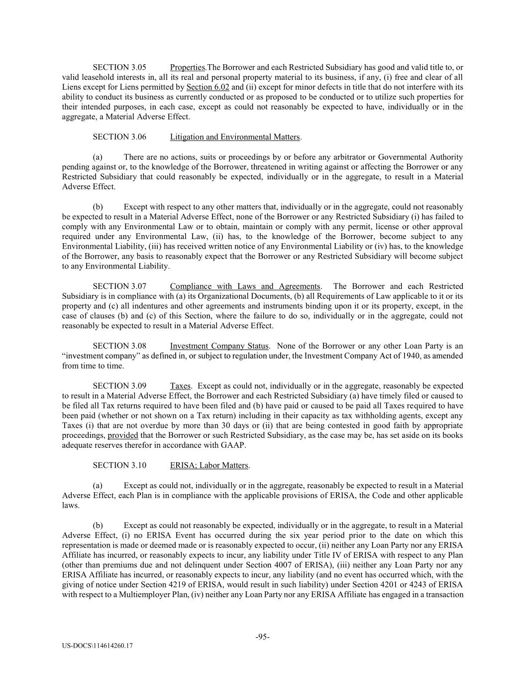 SECTION 3.05 Properties.The Borrower and each Restricted Subsidiary has good and valid title to, or valid leasehold interests in, all its real and personal property material to its business, if any, (i) free and clear of all Liens except for Liens permitted by Section 6.02 and (ii) except for minor defects in title that do not interfere with its ability to conduct its business as currently conducted or as proposed to be conducted or to utilize such properties for their intended purposes, in each case, except as could not reasonably be expected to have, individually or in the aggregate, a Material Adverse Effect. SECTION 3.06 Litigation and Environmental Matters. (a) There are no actions, suits or proceedings by or before any arbitrator or Governmental Authority pending against or, to the knowledge of the Borrower, threatened in writing against or affecting the Borrower or any Restricted Subsidiary that could reasonably be expected, individually or in the aggregate, to result in a Material Adverse Effect. (b) Except with respect to any other matters that, individually or in the aggregate, could not reasonably be expected to result in a Material Adverse Effect, none of the Borrower or any Restricted Subsidiary (i) has failed to comply with any Environmental Law or to obtain, maintain or comply with any permit, license or other approval required under any Environmental Law, (ii) has, to the knowledge of the Borrower, become subject to any Environmental Liability, (iii) has received written notice of any Environmental Liability or (iv) has, to the knowledge of the Borrower, any basis to reasonably expect that the Borrower or any Restricted Subsidiary will become subject to any Environmental Liability. SECTION 3.07 Compliance with Laws and Agreements. The Borrower and each Restricted Subsidiary is in compliance with (a) its Organizational Documents, (b) all Requirements of Law applicable to it or its property and (c) all indentures and other agreements and instruments binding upon it or its property, except, in the case of clauses (b) and (c) of this Section, where the failure to do so, individually or in the aggregate, could not reasonably be expected to result in a Material Adverse Effect. SECTION 3.08 Investment Company Status. None of the Borrower or any other Loan Party is an from time to time. SECTION 3.09 Taxes. Except as could not, individually or in the aggregate, reasonably be expected to result in a Material Adverse Effect, the Borrower and each Restricted Subsidiary (a) have timely filed or caused to be filed all Tax returns required to have been filed and (b) have paid or caused to be paid all Taxes required to have been paid (whether or not shown on a Tax return) including in their capacity as tax withholding agents, except any Taxes (i) that are not overdue by more than 30 days or (ii) that are being contested in good faith by appropriate proceedings, provided that the Borrower or such Restricted Subsidiary, as the case may be, has set aside on its books adequate reserves therefor in accordance with GAAP. SECTION 3.10 ERISA; Labor Matters. (a) Except as could not, individually or in the aggregate, reasonably be expected to result in a Material Adverse Effect, each Plan is in compliance with the applicable provisions of ERISA, the Code and other applicable laws. (b) Except as could not reasonably be expected, individually or in the aggregate, to result in a Material Adverse Effect, (i) no ERISA Event has occurred during the six year period prior to the date on which this representation is made or deemed made or is reasonably expected to occur, (ii) neither any Loan Party nor any ERISA Affiliate has incurred, or reasonably expects to incur, any liability under Title IV of ERISA with respect to any Plan (other than premiums due and not delinquent under Section 4007 of ERISA), (iii) neither any Loan Party nor any ERISA Affiliate has incurred, or reasonably expects to incur, any liability (and no event has occurred which, with the giving of notice under Section 4219 of ERISA, would result in such liability) under Section 4201 or 4243 of ERISA with respect to a Multiemployer Plan, (iv) neither any Loan Party nor any ERISA Affiliate has engaged in a transaction -95- US-DOCS\114614260.17