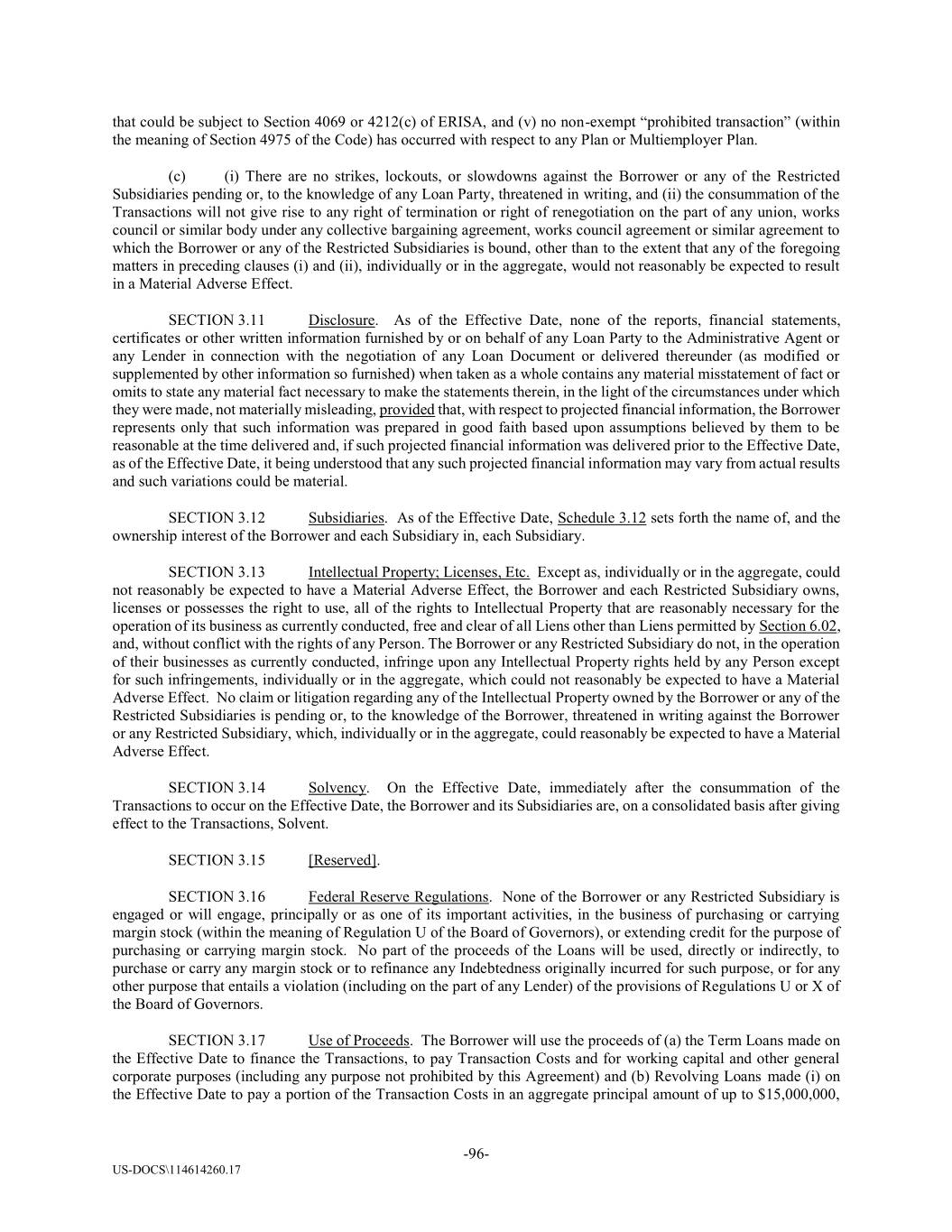 that could be subject to Section 4069 or 4212(c) of ERISA, and (v) no non- the meaning of Section 4975 of the Code) has occurred with respect to any Plan or Multiemployer Plan. (c) (i) There are no strikes, lockouts, or slowdowns against the Borrower or any of the Restricted Subsidiaries pending or, to the knowledge of any Loan Party, threatened in writing, and (ii) the consummation of the Transactions will not give rise to any right of termination or right of renegotiation on the part of any union, works council or similar body under any collective bargaining agreement, works council agreement or similar agreement to which the Borrower or any of the Restricted Subsidiaries is bound, other than to the extent that any of the foregoing matters in preceding clauses (i) and (ii), individually or in the aggregate, would not reasonably be expected to result in a Material Adverse Effect. SECTION 3.11 Disclosure. As of the Effective Date, none of the reports, financial statements, certificates or other written information furnished by or on behalf of any Loan Party to the Administrative Agent or any Lender in connection with the negotiation of any Loan Document or delivered thereunder (as modified or supplemented by other information so furnished) when taken as a whole contains any material misstatement of fact or omits to state any material fact necessary to make the statements therein, in the light of the circumstances under which they were made, not materially misleading, provided that, with respect to projected financial information, the Borrower represents only that such information was prepared in good faith based upon assumptions believed by them to be reasonable at the time delivered and, if such projected financial information was delivered prior to the Effective Date, as of the Effective Date, it being understood that any such projected financial information may vary from actual results and such variations could be material. SECTION 3.12 Subsidiaries. As of the Effective Date, Schedule 3.12 sets forth the name of, and the ownership interest of the Borrower and each Subsidiary in, each Subsidiary. SECTION 3.13 Intellectual Property; Licenses, Etc. Except as, individually or in the aggregate, could not reasonably be expected to have a Material Adverse Effect, the Borrower and each Restricted Subsidiary owns, licenses or possesses the right to use, all of the rights to Intellectual Property that are reasonably necessary for the operation of its business as currently conducted, free and clear of all Liens other than Liens permitted by Section 6.02, and, without conflict with the rights of any Person. The Borrower or any Restricted Subsidiary do not, in the operation of their businesses as currently conducted, infringe upon any Intellectual Property rights held by any Person except for such infringements, individually or in the aggregate, which could not reasonably be expected to have a Material Adverse Effect. No claim or litigation regarding any of the Intellectual Property owned by the Borrower or any of the Restricted Subsidiaries is pending or, to the knowledge of the Borrower, threatened in writing against the Borrower or any Restricted Subsidiary, which, individually or in the aggregate, could reasonably be expected to have a Material Adverse Effect. SECTION 3.14 Solvency. On the Effective Date, immediately after the consummation of the Transactions to occur on the Effective Date, the Borrower and its Subsidiaries are, on a consolidated basis after giving effect to the Transactions, Solvent. SECTION 3.15 [Reserved]. SECTION 3.16 Federal Reserve Regulations. None of the Borrower or any Restricted Subsidiary is engaged or will engage, principally or as one of its important activities, in the business of purchasing or carrying margin stock (within the meaning of Regulation U of the Board of Governors), or extending credit for the purpose of purchasing or carrying margin stock. No part of the proceeds of the Loans will be used, directly or indirectly, to purchase or carry any margin stock or to refinance any Indebtedness originally incurred for such purpose, or for any other purpose that entails a violation (including on the part of any Lender) of the provisions of Regulations U or X of the Board of Governors. SECTION 3.17 Use of Proceeds. The Borrower will use the proceeds of (a) the Term Loans made on the Effective Date to finance the Transactions, to pay Transaction Costs and for working capital and other general corporate purposes (including any purpose not prohibited by this Agreement) and (b) Revolving Loans made (i) on the Effective Date to pay a portion of the Transaction Costs in an aggregate principal amount of up to $15,000,000, -96- US-DOCS\114614260.17