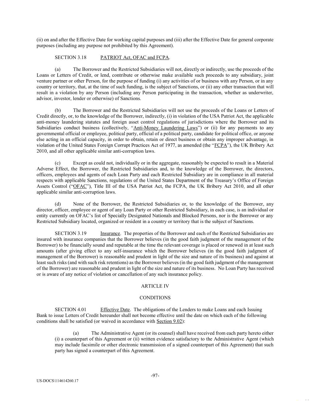 (ii) on and after the Effective Date for working capital purposes and (iii) after the Effective Date for general corporate purposes (including any purpose not prohibited by this Agreement). SECTION 3.18 PATRIOT Act, OFAC and FCPA. (a) The Borrower and the Restricted Subsidiaries will not, directly or indirectly, use the proceeds of the Loans or Letters of Credit, or lend, contribute or otherwise make available such proceeds to any subsidiary, joint venture partner or other Person, for the purpose of funding (i) any activities of or business with any Person, or in any country or territory, that, at the time of such funding, is the subject of Sanctions, or (ii) any other transaction that will result in a violation by any Person (including any Person participating in the transaction, whether as underwriter, advisor, investor, lender or otherwise) of Sanctions. (b) The Borrower and the Restricted Subsidiaries will not use the proceeds of the Loans or Letters of Credit directly, or, to the knowledge of the Borrower, indirectly, (i) in violation of the USA Patriot Act, the applicable anti-money laundering statutes and foreign asset control regulations of jurisdictions where the Borrower and its Anti-Money Laundering Laws governmental official or employee, political party, official of a political party, candidate for political office, or anyone else acting in an official capacity, in order to obtain, retain or direct business or obtain any improper advantage, in FCPA 2010, and all other applicable similar anti-corruption laws. (c) Except as could not, individually or in the aggregate, reasonably be expected to result in a Material Adverse Effect, the Borrower, the Restricted Subsidiaries and, to the knowledge of the Borrower, the directors, officers, employees and agents of each Loan Party and each Restricted Subsidiary are in compliance in all material Assets Control OFAC applicable similar anti-corruption laws. (d) None of the Borrower, the Restricted Subsidiaries or, to the knowledge of the Borrower, any director, officer, employee or agent of any Loan Party or other Restricted Subsidiary, in each case, is an individual or Restricted Subsidiary located, organized or resident in a country or territory that is the subject of Sanctions. SECTION 3.19 Insurance. The properties of the Borrower and each of the Restricted Subsidiaries are insured with insurance companies that the Borrower believes (in the good faith judgment of the management of the Borrower) to be financially sound and reputable at the time the relevant coverage is placed or renewed in at least such amounts (after giving effect to any self-insurance which the Borrower believes (in the good faith judgment of management of the Borrower) is reasonable and prudent in light of the size and nature of its business) and against at least such risks (and with such risk retentions) as the Borrower believes (in the good faith judgment of the management of the Borrower) are reasonable and prudent in light of the size and nature of its business. No Loan Party has received or is aware of any notice of violation or cancellation of any such insurance policy. ARTICLE IV CONDITIONS SECTION 4.01 Effective Date. The obligations of the Lenders to make Loans and each Issuing Bank to issue Letters of Credit hereunder shall not become effective until the date on which each of the following conditions shall be satisfied (or waived in accordance with Section 9.02): (a) The Administrative Agent (or its counsel) shall have received from each party hereto either (i) a counterpart of this Agreement or (ii) written evidence satisfactory to the Administrative Agent (which may include facsimile or other electronic transmission of a signed counterpart of this Agreement) that such party has signed a counterpart of this Agreement. -97- US-DOCS\114614260.17