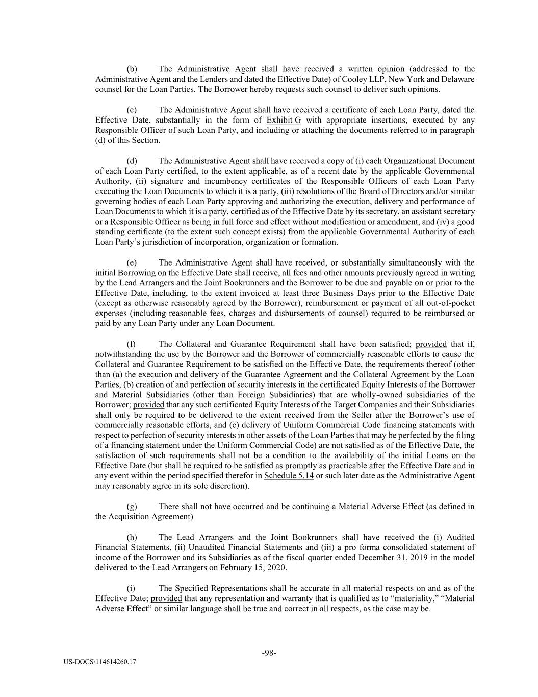 (b) The Administrative Agent shall have received a written opinion (addressed to the Administrative Agent and the Lenders and dated the Effective Date) of Cooley LLP, New York and Delaware counsel for the Loan Parties. The Borrower hereby requests such counsel to deliver such opinions. (c) The Administrative Agent shall have received a certificate of each Loan Party, dated the Effective Date, substantially in the form of Exhibit G with appropriate insertions, executed by any Responsible Officer of such Loan Party, and including or attaching the documents referred to in paragraph (d) of this Section. (d) The Administrative Agent shall have received a copy of (i) each Organizational Document of each Loan Party certified, to the extent applicable, as of a recent date by the applicable Governmental Authority, (ii) signature and incumbency certificates of the Responsible Officers of each Loan Party executing the Loan Documents to which it is a party, (iii) resolutions of the Board of Directors and/or similar governing bodies of each Loan Party approving and authorizing the execution, delivery and performance of Loan Documents to which it is a party, certified as of the Effective Date by its secretary, an assistant secretary or a Responsible Officer as being in full force and effect without modification or amendment, and (iv) a good standing certificate (to the extent such concept exists) from the applicable Governmental Authority of each (e) The Administrative Agent shall have received, or substantially simultaneously with the initial Borrowing on the Effective Date shall receive, all fees and other amounts previously agreed in writing by the Lead Arrangers and the Joint Bookrunners and the Borrower to be due and payable on or prior to the Effective Date, including, to the extent invoiced at least three Business Days prior to the Effective Date (except as otherwise reasonably agreed by the Borrower), reimbursement or payment of all out-of-pocket expenses (including reasonable fees, charges and disbursements of counsel) required to be reimbursed or paid by any Loan Party under any Loan Document. (f) The Collateral and Guarantee Requirement shall have been satisfied; provided that if, notwithstanding the use by the Borrower and the Borrower of commercially reasonable efforts to cause the Collateral and Guarantee Requirement to be satisfied on the Effective Date, the requirements thereof (other than (a) the execution and delivery of the Guarantee Agreement and the Collateral Agreement by the Loan Parties, (b) creation of and perfection of security interests in the certificated Equity Interests of the Borrower and Material Subsidiaries (other than Foreign Subsidiaries) that are wholly-owned subsidiaries of the Borrower; provided that any such certificated Equity Interests of the Target Companies and their Subsidiaries shall only be required commercially reasonable efforts, and (c) delivery of Uniform Commercial Code financing statements with respect to perfection of security interests in other assets of the Loan Parties that may be perfected by the filing of a financing statement under the Uniform Commercial Code) are not satisfied as of the Effective Date, the satisfaction of such requirements shall not be a condition to the availability of the initial Loans on the Effective Date (but shall be required to be satisfied as promptly as practicable after the Effective Date and in any event within the period specified therefor in Schedule 5.14 or such later date as the Administrative Agent may reasonably agree in its sole discretion). (g) There shall not have occurred and be continuing a Material Adverse Effect (as defined in the Acquisition Agreement) (h) The Lead Arrangers and the Joint Bookrunners shall have received the (i) Audited Financial Statements, (ii) Unaudited Financial Statements and (iii) a pro forma consolidated statement of income of the Borrower and its Subsidiaries as of the fiscal quarter ended December 31, 2019 in the model delivered to the Lead Arrangers on February 15, 2020. (i) The Specified Representations shall be accurate in all material respects on and as of the Effective Date; provided ge shall be true and correct in all respects, as the case may be. -98- US-DOCS\114614260.17