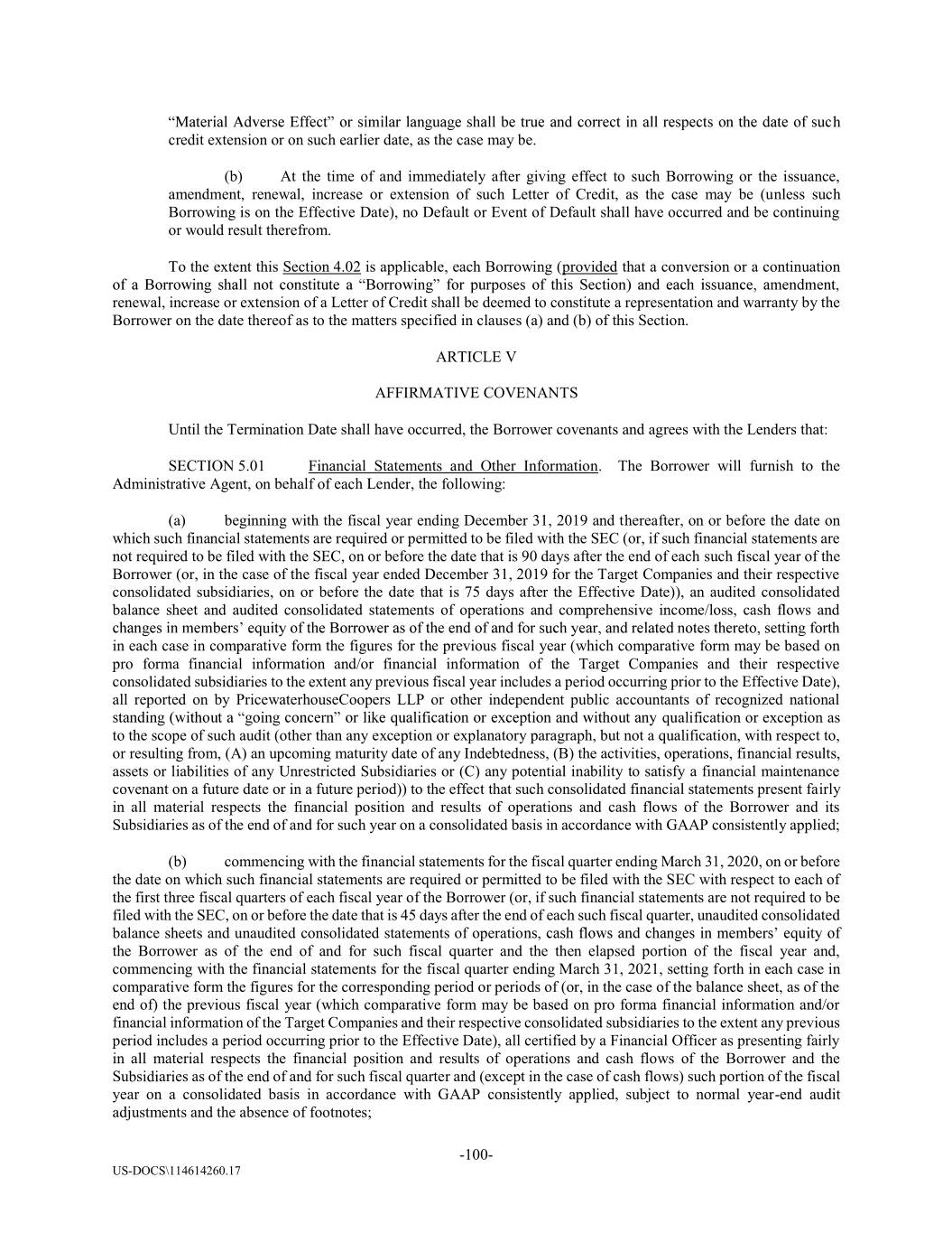 h credit extension or on such earlier date, as the case may be. (b) At the time of and immediately after giving effect to such Borrowing or the issuance, amendment, renewal, increase or extension of such Letter of Credit, as the case may be (unless such Borrowing is on the Effective Date), no Default or Event of Default shall have occurred and be continuing or would result therefrom. To the extent this Section 4.02 is applicable, each Borrowing (provided that a conversion or a continuation renewal, increase or extension of a Letter of Credit shall be deemed to constitute a representation and warranty by the Borrower on the date thereof as to the matters specified in clauses (a) and (b) of this Section. ARTICLE V AFFIRMATIVE COVENANTS Until the Termination Date shall have occurred, the Borrower covenants and agrees with the Lenders that: SECTION 5.01 Financial Statements and Other Information. The Borrower will furnish to the Administrative Agent, on behalf of each Lender, the following: (a) beginning with the fiscal year ending December 31, 2019 and thereafter, on or before the date on which such financial statements are required or permitted to be filed with the SEC (or, if such financial statements are not required to be filed with the SEC, on or before the date that is 90 days after the end of each such fiscal year of the Borrower (or, in the case of the fiscal year ended December 31, 2019 for the Target Companies and their respective consolidated subsidiaries, on or before the date that is 75 days after the Effective Date)), an audited consolidated balance sheet and audited consolidated statements of operations and comprehensive income/loss, cash flows and in each case in comparative form the figures for the previous fiscal year (which comparative form may be based on pro forma financial information and/or financial information of the Target Companies and their respective consolidated subsidiaries to the extent any previous fiscal year includes a period occurring prior to the Effective Date), all reported on by PricewaterhouseCoopers LLP or other independent public accountants of recognized national qualification or exception as to the scope of such audit (other than any exception or explanatory paragraph, but not a qualification, with respect to, or resulting from, (A) an upcoming maturity date of any Indebtedness, (B) the activities, operations, financial results, assets or liabilities of any Unrestricted Subsidiaries or (C) any potential inability to satisfy a financial maintenance covenant on a future date or in a future period)) to the effect that such consolidated financial statements present fairly in all material respects the financial position and results of operations and cash flows of the Borrower and its Subsidiaries as of the end of and for such year on a consolidated basis in accordance with GAAP consistently applied; (b) commencing with the financial statements for the fiscal quarter ending March 31, 2020, on or before the date on which such financial statements are required or permitted to be filed with the SEC with respect to each of the first three fiscal quarters of each fiscal year of the Borrower (or, if such financial statements are not required to be filed with the SEC, on or before the date that is 45 days after the end of each such fiscal quarter, unaudited consolidated balance sheets and unaudited consolidated statements of operatio the Borrower as of the end of and for such fiscal quarter and the then elapsed portion of the fiscal year and, commencing with the financial statements for the fiscal quarter ending March 31, 2021, setting forth in each case in comparative form the figures for the corresponding period or periods of (or, in the case of the balance sheet, as of the end of) the previous fiscal year (which comparative form may be based on pro forma financial information and/or financial information of the Target Companies and their respective consolidated subsidiaries to the extent any previous period includes a period occurring prior to the Effective Date), all certified by a Financial Officer as presenting fairly in all material respects the financial position and results of operations and cash flows of the Borrower and the Subsidiaries as of the end of and for such fiscal quarter and (except in the case of cash flows) such portion of the fiscal year on a consolidated basis in accordance with GAAP consistently applied, subject to normal year-end audit adjustments and the absence of footnotes; -100- US-DOCS\114614260.17