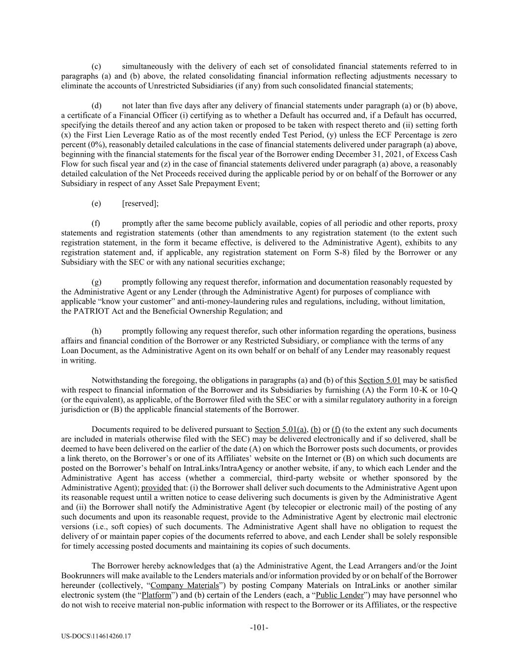 (c) simultaneously with the delivery of each set of consolidated financial statements referred to in paragraphs (a) and (b) above, the related consolidating financial information reflecting adjustments necessary to eliminate the accounts of Unrestricted Subsidiaries (if any) from such consolidated financial statements; (d) not later than five days after any delivery of financial statements under paragraph (a) or (b) above, a certificate of a Financial Officer (i) certifying as to whether a Default has occurred and, if a Default has occurred, specifying the details thereof and any action taken or proposed to be taken with respect thereto and (ii) setting forth (x) the First Lien Leverage Ratio as of the most recently ended Test Period, (y) unless the ECF Percentage is zero percent (0%), reasonably detailed calculations in the case of financial statements delivered under paragraph (a) above, beginning with the financial statements for the fiscal year of the Borrower ending December 31, 2021, of Excess Cash Flow for such fiscal year and (z) in the case of financial statements delivered under paragraph (a) above, a reasonably detailed calculation of the Net Proceeds received during the applicable period by or on behalf of the Borrower or any Subsidiary in respect of any Asset Sale Prepayment Event; (e) [reserved]; (f) promptly after the same become publicly available, copies of all periodic and other reports, proxy statements and registration statements (other than amendments to any registration statement (to the extent such registration statement, in the form it became effective, is delivered to the Administrative Agent), exhibits to any registration statement and, if applicable, any registration statement on Form S-8) filed by the Borrower or any Subsidiary with the SEC or with any national securities exchange; (g) promptly following any request therefor, information and documentation reasonably requested by the Administrative Agent or any Lender (through the Administrative Agent) for purposes of compliance with -money-laundering rules and regulations, including, without limitation, the PATRIOT Act and the Beneficial Ownership Regulation; and (h) promptly following any request therefor, such other information regarding the operations, business affairs and financial condition of the Borrower or any Restricted Subsidiary, or compliance with the terms of any Loan Document, as the Administrative Agent on its own behalf or on behalf of any Lender may reasonably request in writing. Notwithstanding the foregoing, the obligations in paragraphs (a) and (b) of this Section 5.01 may be satisfied with respect to financial information of the Borrower and its Subsidiaries by furnishing (A) the Form 10-K or 10-Q (or the equivalent), as applicable, of the Borrower filed with the SEC or with a similar regulatory authority in a foreign jurisdiction or (B) the applicable financial statements of the Borrower. Documents required to be delivered pursuant to Section 5.01(a), (b) or (f) (to the extent any such documents are included in materials otherwise filed with the SEC) may be delivered electronically and if so delivered, shall be deemed to have been delivered on the earlier of the date (A) on which the Borrower posts such documents, or provides Administrative Agent has access (whether a commercial, third-party website or whether sponsored by the Administrative Agent); provided that: (i) the Borrower shall deliver such documents to the Administrative Agent upon its reasonable request until a written notice to cease delivering such documents is given by the Administrative Agent and (ii) the Borrower shall notify the Administrative Agent (by telecopier or electronic mail) of the posting of any such documents and upon its reasonable request, provide to the Administrative Agent by electronic mail electronic versions (i.e., soft copies) of such documents. The Administrative Agent shall have no obligation to request the delivery of or maintain paper copies of the documents referred to above, and each Lender shall be solely responsible for timely accessing posted documents and maintaining its copies of such documents. The Borrower hereby acknowledges that (a) the Administrative Agent, the Lead Arrangers and/or the Joint Bookrunners will make available to the Lenders materials and/or information provided by or on behalf of the Borrower Company Materials Platform Public Lender do not wish to receive material non-public information with respect to the Borrower or its Affiliates, or the respective -101- US-DOCS\114614260.17