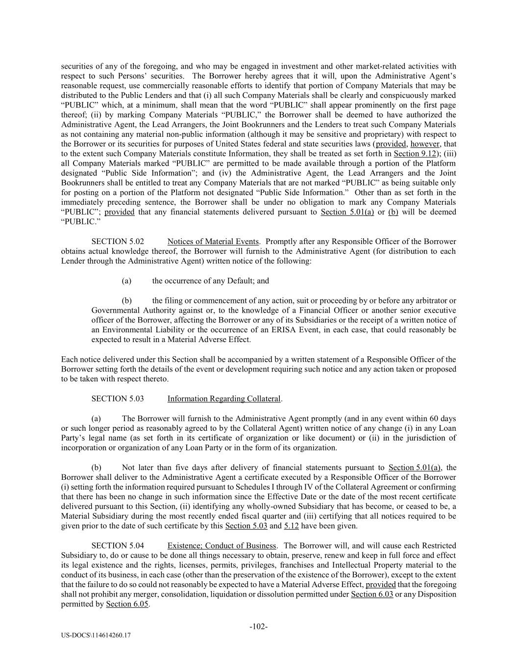 securities of any of the foregoing, and who may be engaged in investment and other market-related activities with reasonable request, use commercially reasonable efforts to identify that portion of Company Materials that may be distributed to the Public Lenders and that (i) all such Company Materials shall be clearly and conspicuously marked thereof; (ii) by marking Company Mat Administrative Agent, the Lead Arrangers, the Joint Bookrunners and the Lenders to treat such Company Materials as not containing any material non-public information (although it may be sensitive and proprietary) with respect to the Borrower or its securities for purposes of United States federal and state securities laws (provided, however, that to the extent such Company Materials constitute Information, they shall be treated as set forth in Section 9.12); (iii) for posting on a portion of the Platform not design immediately preceding sentence, the Borrower shall be under no obligation to mark any Company Materials provided that any financial statements delivered pursuant to Section 5.01(a) or (b) will be deemed SECTION 5.02 Notices of Material Events. Promptly after any Responsible Officer of the Borrower obtains actual knowledge thereof, the Borrower will furnish to the Administrative Agent (for distribution to each Lender through the Administrative Agent) written notice of the following: (a) the occurrence of any Default; and (b) the filing or commencement of any action, suit or proceeding by or before any arbitrator or Governmental Authority against or, to the knowledge of a Financial Officer or another senior executive officer of the Borrower, affecting the Borrower or any of its Subsidiaries or the receipt of a written notice of an Environmental Liability or the occurrence of an ERISA Event, in each case, that could reasonably be expected to result in a Material Adverse Effect. Each notice delivered under this Section shall be accompanied by a written statement of a Responsible Officer of the Borrower setting forth the details of the event or development requiring such notice and any action taken or proposed to be taken with respect thereto. SECTION 5.03 Information Regarding Collateral. (a) The Borrower will furnish to the Administrative Agent promptly (and in any event within 60 days or such longer period as reasonably agreed to by the Collateral Agent) written notice of any change (i) in any Loan incorporation or organization of any Loan Party or in the form of its organization. (b) Not later than five days after delivery of financial statements pursuant to Section 5.01(a), the Borrower shall deliver to the Administrative Agent a certificate executed by a Responsible Officer of the Borrower (i) setting forth the information required pursuant to Schedules I through IV of the Collateral Agreement or confirming that there has been no change in such information since the Effective Date or the date of the most recent certificate delivered pursuant to this Section, (ii) identifying any wholly-owned Subsidiary that has become, or ceased to be, a Material Subsidiary during the most recently ended fiscal quarter and (iii) certifying that all notices required to be given prior to the date of such certificate by this Section 5.03 and 5.12 have been given. SECTION 5.04 Existence; Conduct of Business. The Borrower will, and will cause each Restricted Subsidiary to, do or cause to be done all things necessary to obtain, preserve, renew and keep in full force and effect its legal existence and the rights, licenses, permits, privileges, franchises and Intellectual Property material to the conduct of its business, in each case (other than the preservation of the existence of the Borrower), except to the extent that the failure to do so could not reasonably be expected to have a Material Adverse Effect, provided that the foregoing shall not prohibit any merger, consolidation, liquidation or dissolution permitted under Section 6.03 or any Disposition permitted by Section 6.05. -102- US-DOCS\114614260.17