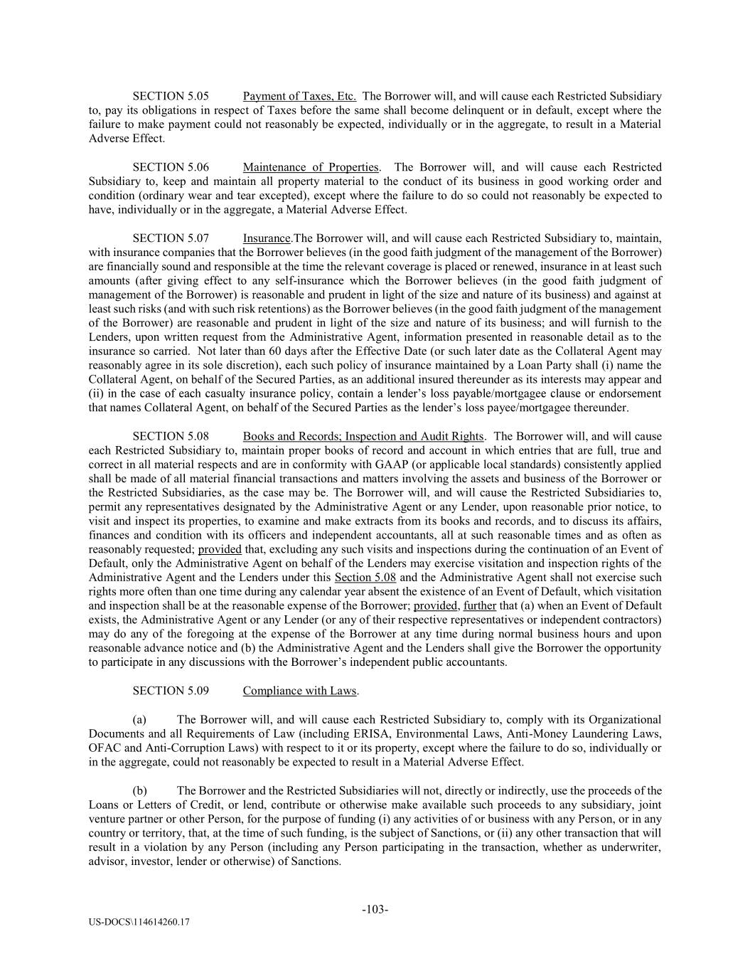SECTION 5.05 Payment of Taxes, Etc. The Borrower will, and will cause each Restricted Subsidiary to, pay its obligations in respect of Taxes before the same shall become delinquent or in default, except where the failure to make payment could not reasonably be expected, individually or in the aggregate, to result in a Material Adverse Effect. SECTION 5.06 Maintenance of Properties. The Borrower will, and will cause each Restricted Subsidiary to, keep and maintain all property material to the conduct of its business in good working order and condition (ordinary wear and tear excepted), except where the failure to do so could not reasonably be expected to have, individually or in the aggregate, a Material Adverse Effect. SECTION 5.07 Insurance.The Borrower will, and will cause each Restricted Subsidiary to, maintain, with insurance companies that the Borrower believes (in the good faith judgment of the management of the Borrower) are financially sound and responsible at the time the relevant coverage is placed or renewed, insurance in at least such amounts (after giving effect to any self-insurance which the Borrower believes (in the good faith judgment of management of the Borrower) is reasonable and prudent in light of the size and nature of its business) and against at least such risks (and with such risk retentions) as the Borrower believes (in the good faith judgment of the management of the Borrower) are reasonable and prudent in light of the size and nature of its business; and will furnish to the Lenders, upon written request from the Administrative Agent, information presented in reasonable detail as to the insurance so carried. Not later than 60 days after the Effective Date (or such later date as the Collateral Agent may reasonably agree in its sole discretion), each such policy of insurance maintained by a Loan Party shall (i) name the Collateral Agent, on behalf of the Secured Parties, as an additional insured thereunder as its interests may appear and loss payee/mortgagee thereunder. SECTION 5.08 Books and Records; Inspection and Audit Rights. The Borrower will, and will cause each Restricted Subsidiary to, maintain proper books of record and account in which entries that are full, true and correct in all material respects and are in conformity with GAAP (or applicable local standards) consistently applied shall be made of all material financial transactions and matters involving the assets and business of the Borrower or the Restricted Subsidiaries, as the case may be. The Borrower will, and will cause the Restricted Subsidiaries to, permit any representatives designated by the Administrative Agent or any Lender, upon reasonable prior notice, to visit and inspect its properties, to examine and make extracts from its books and records, and to discuss its affairs, finances and condition with its officers and independent accountants, all at such reasonable times and as often as reasonably requested; provided that, excluding any such visits and inspections during the continuation of an Event of Default, only the Administrative Agent on behalf of the Lenders may exercise visitation and inspection rights of the Administrative Agent and the Lenders under this Section 5.08 and the Administrative Agent shall not exercise such rights more often than one time during any calendar year absent the existence of an Event of Default, which visitation and inspection shall be at the reasonable expense of the Borrower; provided, further that (a) when an Event of Default exists, the Administrative Agent or any Lender (or any of their respective representatives or independent contractors) may do any of the foregoing at the expense of the Borrower at any time during normal business hours and upon reasonable advance notice and (b) the Administrative Agent and the Lenders shall give the Borrower the opportunity untants. SECTION 5.09 Compliance with Laws. (a) The Borrower will, and will cause each Restricted Subsidiary to, comply with its Organizational Documents and all Requirements of Law (including ERISA, Environmental Laws, Anti-Money Laundering Laws, OFAC and Anti-Corruption Laws) with respect to it or its property, except where the failure to do so, individually or in the aggregate, could not reasonably be expected to result in a Material Adverse Effect. (b) The Borrower and the Restricted Subsidiaries will not, directly or indirectly, use the proceeds of the Loans or Letters of Credit, or lend, contribute or otherwise make available such proceeds to any subsidiary, joint venture partner or other Person, for the purpose of funding (i) any activities of or business with any Person, or in any country or territory, that, at the time of such funding, is the subject of Sanctions, or (ii) any other transaction that will result in a violation by any Person (including any Person participating in the transaction, whether as underwriter, advisor, investor, lender or otherwise) of Sanctions. -103- US-DOCS\114614260.17