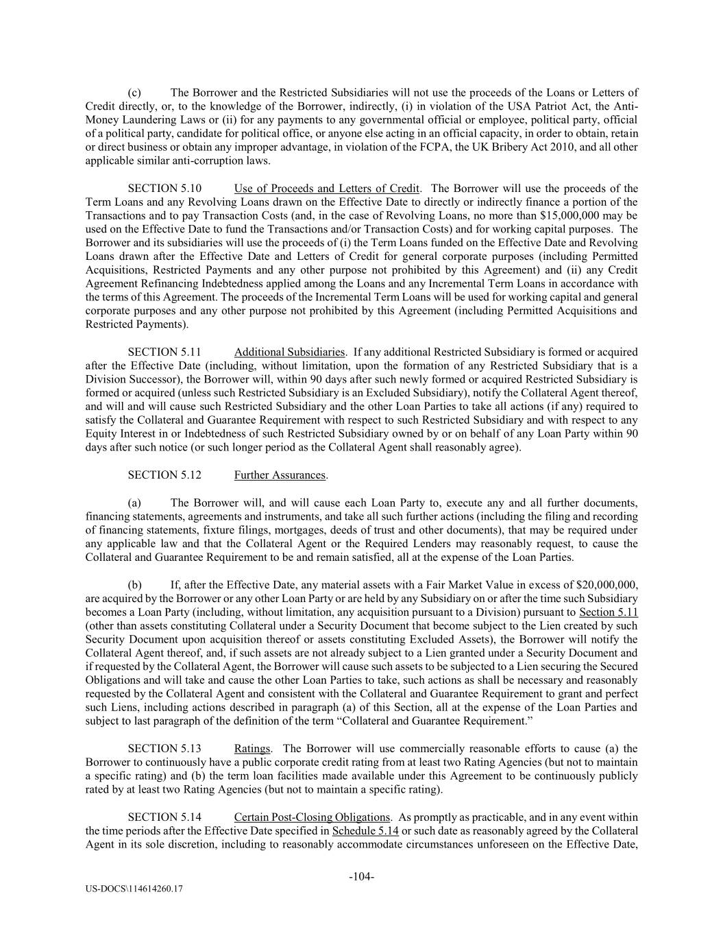 (c) The Borrower and the Restricted Subsidiaries will not use the proceeds of the Loans or Letters of Credit directly, or, to the knowledge of the Borrower, indirectly, (i) in violation of the USA Patriot Act, the Anti- Money Laundering Laws or (ii) for any payments to any governmental official or employee, political party, official of a political party, candidate for political office, or anyone else acting in an official capacity, in order to obtain, retain or direct business or obtain any improper advantage, in violation of the FCPA, the UK Bribery Act 2010, and all other applicable similar anti-corruption laws. SECTION 5.10 Use of Proceeds and Letters of Credit. The Borrower will use the proceeds of the Term Loans and any Revolving Loans drawn on the Effective Date to directly or indirectly finance a portion of the Transactions and to pay Transaction Costs (and, in the case of Revolving Loans, no more than $15,000,000 may be used on the Effective Date to fund the Transactions and/or Transaction Costs) and for working capital purposes. The Borrower and its subsidiaries will use the proceeds of (i) the Term Loans funded on the Effective Date and Revolving Loans drawn after the Effective Date and Letters of Credit for general corporate purposes (including Permitted Acquisitions, Restricted Payments and any other purpose not prohibited by this Agreement) and (ii) any Credit Agreement Refinancing Indebtedness applied among the Loans and any Incremental Term Loans in accordance with the terms of this Agreement. The proceeds of the Incremental Term Loans will be used for working capital and general corporate purposes and any other purpose not prohibited by this Agreement (including Permitted Acquisitions and Restricted Payments). SECTION 5.11 Additional Subsidiaries. If any additional Restricted Subsidiary is formed or acquired after the Effective Date (including, without limitation, upon the formation of any Restricted Subsidiary that is a Division Successor), the Borrower will, within 90 days after such newly formed or acquired Restricted Subsidiary is formed or acquired (unless such Restricted Subsidiary is an Excluded Subsidiary), notify the Collateral Agent thereof, and will and will cause such Restricted Subsidiary and the other Loan Parties to take all actions (if any) required to satisfy the Collateral and Guarantee Requirement with respect to such Restricted Subsidiary and with respect to any Equity Interest in or Indebtedness of such Restricted Subsidiary owned by or on behalf of any Loan Party within 90 days after such notice (or such longer period as the Collateral Agent shall reasonably agree). SECTION 5.12 Further Assurances. (a) The Borrower will, and will cause each Loan Party to, execute any and all further documents, financing statements, agreements and instruments, and take all such further actions (including the filing and recording of financing statements, fixture filings, mortgages, deeds of trust and other documents), that may be required under any applicable law and that the Collateral Agent or the Required Lenders may reasonably request, to cause the Collateral and Guarantee Requirement to be and remain satisfied, all at the expense of the Loan Parties. (b) If, after the Effective Date, any material assets with a Fair Market Value in excess of $20,000,000, are acquired by the Borrower or any other Loan Party or are held by any Subsidiary on or after the time such Subsidiary becomes a Loan Party (including, without limitation, any acquisition pursuant to a Division) pursuant to Section 5.11 (other than assets constituting Collateral under a Security Document that become subject to the Lien created by such Security Document upon acquisition thereof or assets constituting Excluded Assets), the Borrower will notify the Collateral Agent thereof, and, if such assets are not already subject to a Lien granted under a Security Document and if requested by the Collateral Agent, the Borrower will cause such assets to be subjected to a Lien securing the Secured Obligations and will take and cause the other Loan Parties to take, such actions as shall be necessary and reasonably requested by the Collateral Agent and consistent with the Collateral and Guarantee Requirement to grant and perfect such Liens, including actions described in paragraph (a) of this Section, all at the expense of the Loan Parties and SECTION 5.13 Ratings. The Borrower will use commercially reasonable efforts to cause (a) the Borrower to continuously have a public corporate credit rating from at least two Rating Agencies (but not to maintain a specific rating) and (b) the term loan facilities made available under this Agreement to be continuously publicly rated by at least two Rating Agencies (but not to maintain a specific rating). SECTION 5.14 Certain Post-Closing Obligations. As promptly as practicable, and in any event within the time periods after the Effective Date specified in Schedule 5.14 or such date as reasonably agreed by the Collateral Agent in its sole discretion, including to reasonably accommodate circumstances unforeseen on the Effective Date, -104- US-DOCS\114614260.17