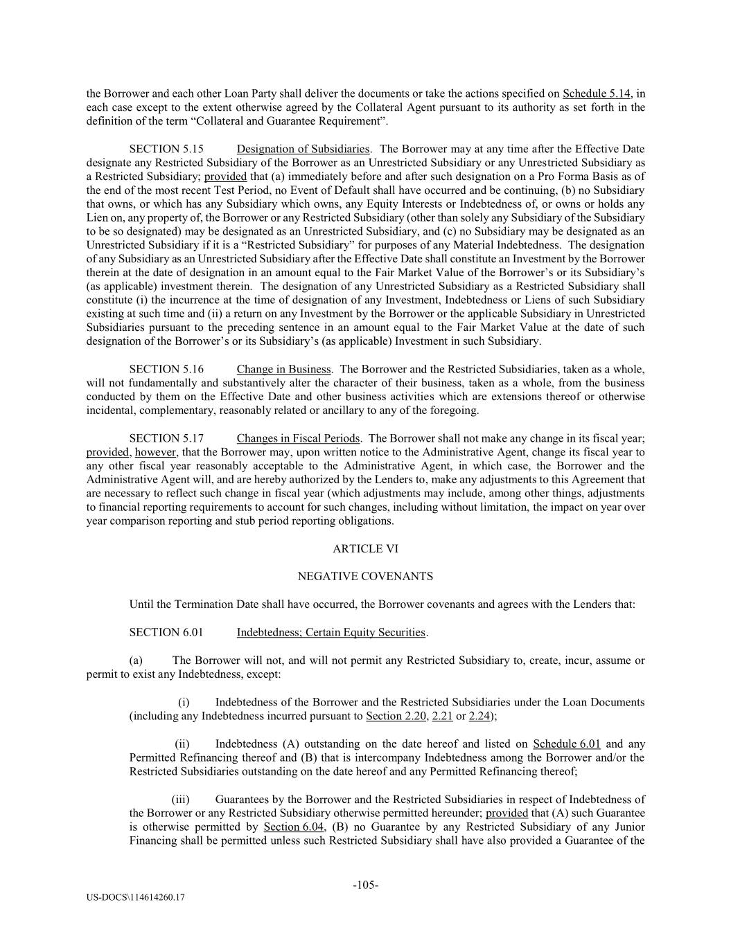 the Borrower and each other Loan Party shall deliver the documents or take the actions specified on Schedule 5.14, in each case except to the extent otherwise agreed by the Collateral Agent pursuant to its authority as set forth in the SECTION 5.15 Designation of Subsidiaries. The Borrower may at any time after the Effective Date designate any Restricted Subsidiary of the Borrower as an Unrestricted Subsidiary or any Unrestricted Subsidiary as a Restricted Subsidiary; provided that (a) immediately before and after such designation on a Pro Forma Basis as of the end of the most recent Test Period, no Event of Default shall have occurred and be continuing, (b) no Subsidiary that owns, or which has any Subsidiary which owns, any Equity Interests or Indebtedness of, or owns or holds any Lien on, any property of, the Borrower or any Restricted Subsidiary (other than solely any Subsidiary of the Subsidiary to be so designated) may be designated as an Unrestricted Subsidiary, and (c) no Subsidiary may be designated as an of any Subsidiary as an Unrestricted Subsidiary after the Effective Date shall constitute an Investment by the Borrower (as applicable) investment therein. The designation of any Unrestricted Subsidiary as a Restricted Subsidiary shall constitute (i) the incurrence at the time of designation of any Investment, Indebtedness or Liens of such Subsidiary existing at such time and (ii) a return on any Investment by the Borrower or the applicable Subsidiary in Unrestricted Subsidiaries pursuant to the preceding sentence in an amount equal to the Fair Market Value at the date of such SECTION 5.16 Change in Business. The Borrower and the Restricted Subsidiaries, taken as a whole, will not fundamentally and substantively alter the character of their business, taken as a whole, from the business conducted by them on the Effective Date and other business activities which are extensions thereof or otherwise incidental, complementary, reasonably related or ancillary to any of the foregoing. SECTION 5.17 Changes in Fiscal Periods. The Borrower shall not make any change in its fiscal year; provided, however, that the Borrower may, upon written notice to the Administrative Agent, change its fiscal year to any other fiscal year reasonably acceptable to the Administrative Agent, in which case, the Borrower and the Administrative Agent will, and are hereby authorized by the Lenders to, make any adjustments to this Agreement that are necessary to reflect such change in fiscal year (which adjustments may include, among other things, adjustments to financial reporting requirements to account for such changes, including without limitation, the impact on year over year comparison reporting and stub period reporting obligations. ARTICLE VI NEGATIVE COVENANTS Until the Termination Date shall have occurred, the Borrower covenants and agrees with the Lenders that: SECTION 6.01 Indebtedness; Certain Equity Securities. (a) The Borrower will not, and will not permit any Restricted Subsidiary to, create, incur, assume or permit to exist any Indebtedness, except: (i) Indebtedness of the Borrower and the Restricted Subsidiaries under the Loan Documents (including any Indebtedness incurred pursuant to Section 2.20, 2.21 or 2.24); (ii) Indebtedness (A) outstanding on the date hereof and listed on Schedule 6.01 and any Permitted Refinancing thereof and (B) that is intercompany Indebtedness among the Borrower and/or the Restricted Subsidiaries outstanding on the date hereof and any Permitted Refinancing thereof; (iii) Guarantees by the Borrower and the Restricted Subsidiaries in respect of Indebtedness of the Borrower or any Restricted Subsidiary otherwise permitted hereunder; provided that (A) such Guarantee is otherwise permitted by Section 6.04, (B) no Guarantee by any Restricted Subsidiary of any Junior Financing shall be permitted unless such Restricted Subsidiary shall have also provided a Guarantee of the -105- US-DOCS\114614260.17