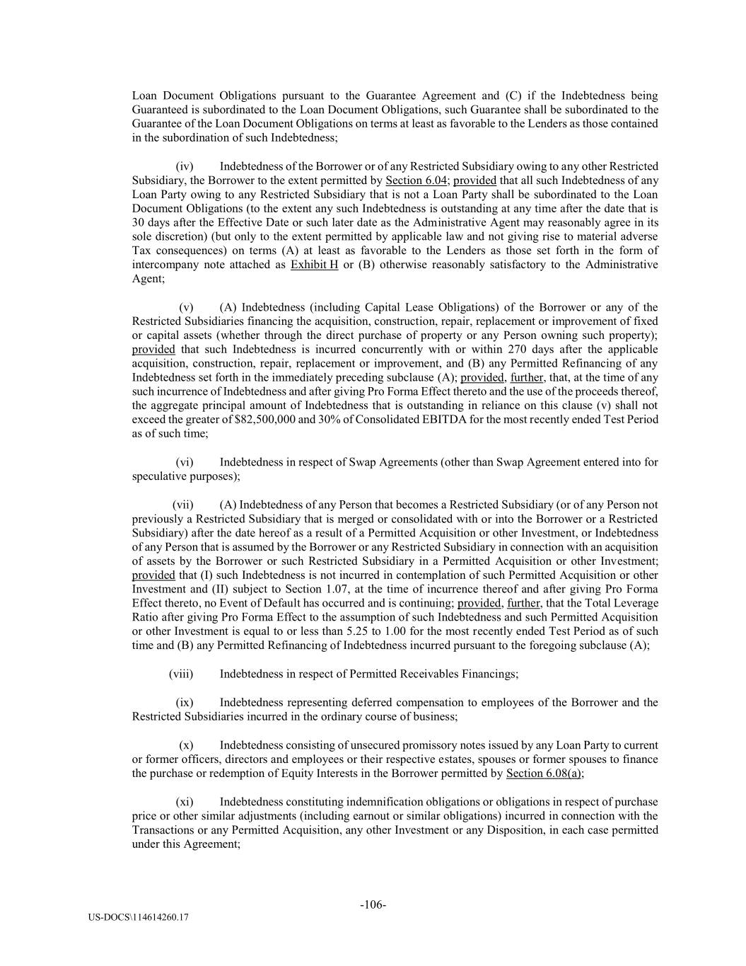 Loan Document Obligations pursuant to the Guarantee Agreement and (C) if the Indebtedness being Guaranteed is subordinated to the Loan Document Obligations, such Guarantee shall be subordinated to the Guarantee of the Loan Document Obligations on terms at least as favorable to the Lenders as those contained in the subordination of such Indebtedness; (iv) Indebtedness of the Borrower or of any Restricted Subsidiary owing to any other Restricted Subsidiary, the Borrower to the extent permitted by Section 6.04; provided that all such Indebtedness of any Loan Party owing to any Restricted Subsidiary that is not a Loan Party shall be subordinated to the Loan Document Obligations (to the extent any such Indebtedness is outstanding at any time after the date that is 30 days after the Effective Date or such later date as the Administrative Agent may reasonably agree in its sole discretion) (but only to the extent permitted by applicable law and not giving rise to material adverse Tax consequences) on terms (A) at least as favorable to the Lenders as those set forth in the form of intercompany note attached as Exhibit H or (B) otherwise reasonably satisfactory to the Administrative Agent; (v) (A) Indebtedness (including Capital Lease Obligations) of the Borrower or any of the Restricted Subsidiaries financing the acquisition, construction, repair, replacement or improvement of fixed or capital assets (whether through the direct purchase of property or any Person owning such property); provided that such Indebtedness is incurred concurrently with or within 270 days after the applicable acquisition, construction, repair, replacement or improvement, and (B) any Permitted Refinancing of any Indebtedness set forth in the immediately preceding subclause (A); provided, further, that, at the time of any such incurrence of Indebtedness and after giving Pro Forma Effect thereto and the use of the proceeds thereof, the aggregate principal amount of Indebtedness that is outstanding in reliance on this clause (v) shall not exceed the greater of $82,500,000 and 30% of Consolidated EBITDA for the most recently ended Test Period as of such time; (vi) Indebtedness in respect of Swap Agreements (other than Swap Agreement entered into for speculative purposes); (vii) (A) Indebtedness of any Person that becomes a Restricted Subsidiary (or of any Person not previously a Restricted Subsidiary that is merged or consolidated with or into the Borrower or a Restricted Subsidiary) after the date hereof as a result of a Permitted Acquisition or other Investment, or Indebtedness of any Person that is assumed by the Borrower or any Restricted Subsidiary in connection with an acquisition of assets by the Borrower or such Restricted Subsidiary in a Permitted Acquisition or other Investment; provided that (I) such Indebtedness is not incurred in contemplation of such Permitted Acquisition or other Investment and (II) subject to Section 1.07, at the time of incurrence thereof and after giving Pro Forma Effect thereto, no Event of Default has occurred and is continuing; provided, further, that the Total Leverage Ratio after giving Pro Forma Effect to the assumption of such Indebtedness and such Permitted Acquisition or other Investment is equal to or less than 5.25 to 1.00 for the most recently ended Test Period as of such time and (B) any Permitted Refinancing of Indebtedness incurred pursuant to the foregoing subclause (A); (viii) Indebtedness in respect of Permitted Receivables Financings; (ix) Indebtedness representing deferred compensation to employees of the Borrower and the Restricted Subsidiaries incurred in the ordinary course of business; (x) Indebtedness consisting of unsecured promissory notes issued by any Loan Party to current or former officers, directors and employees or their respective estates, spouses or former spouses to finance the purchase or redemption of Equity Interests in the Borrower permitted by Section 6.08(a); (xi) Indebtedness constituting indemnification obligations or obligations in respect of purchase price or other similar adjustments (including earnout or similar obligations) incurred in connection with the Transactions or any Permitted Acquisition, any other Investment or any Disposition, in each case permitted under this Agreement; -106- US-DOCS\114614260.17